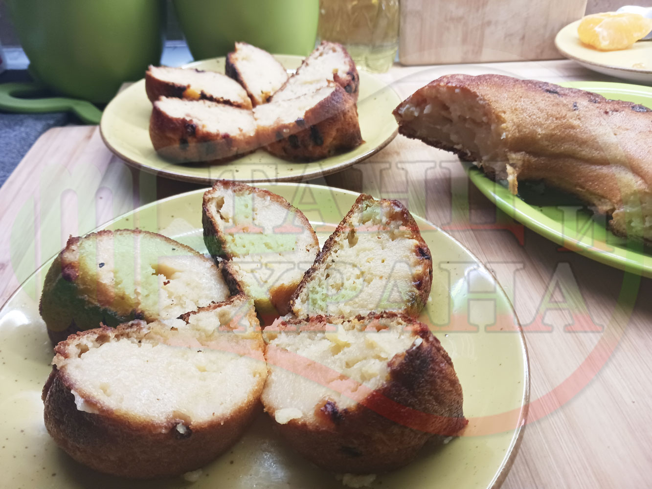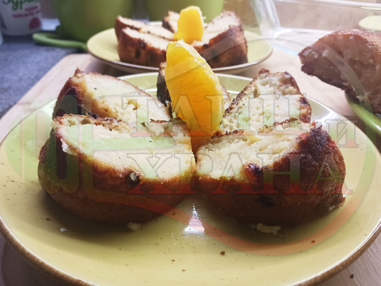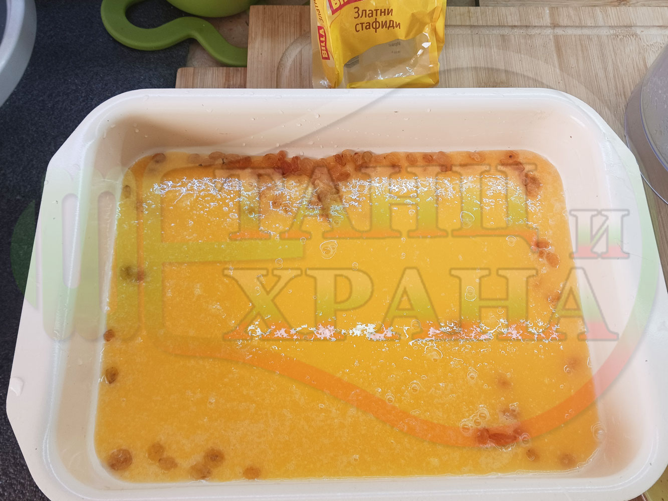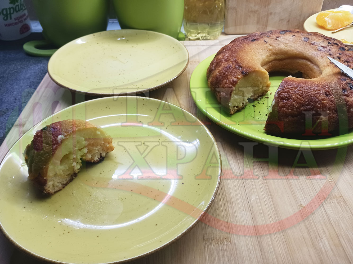 Български портокалов постен кремообразен кекс "Портокаловостафиден" приготвен с пресни портокали, кристална и пудра захар, нишесте праскова, брашно без набухвател и златни стафиди подходящ за постещи хора
