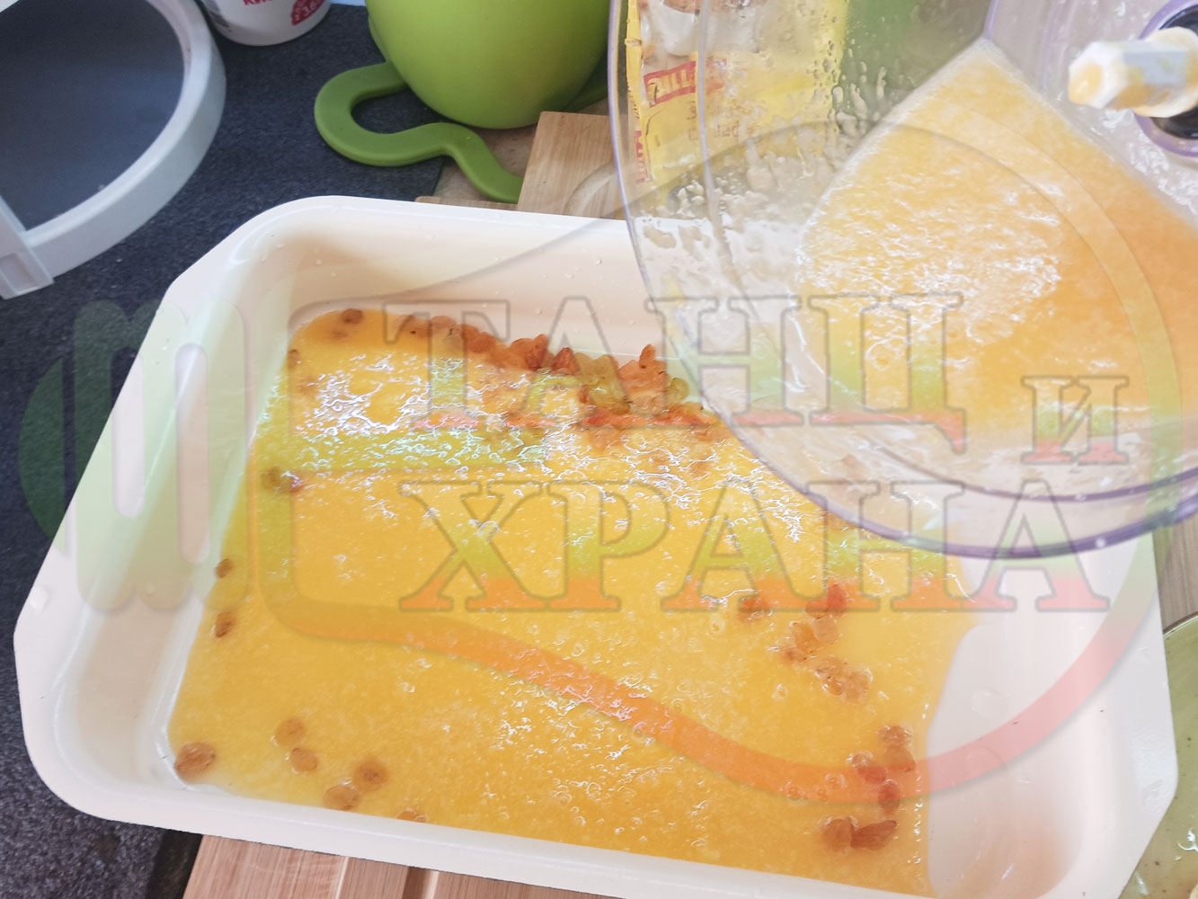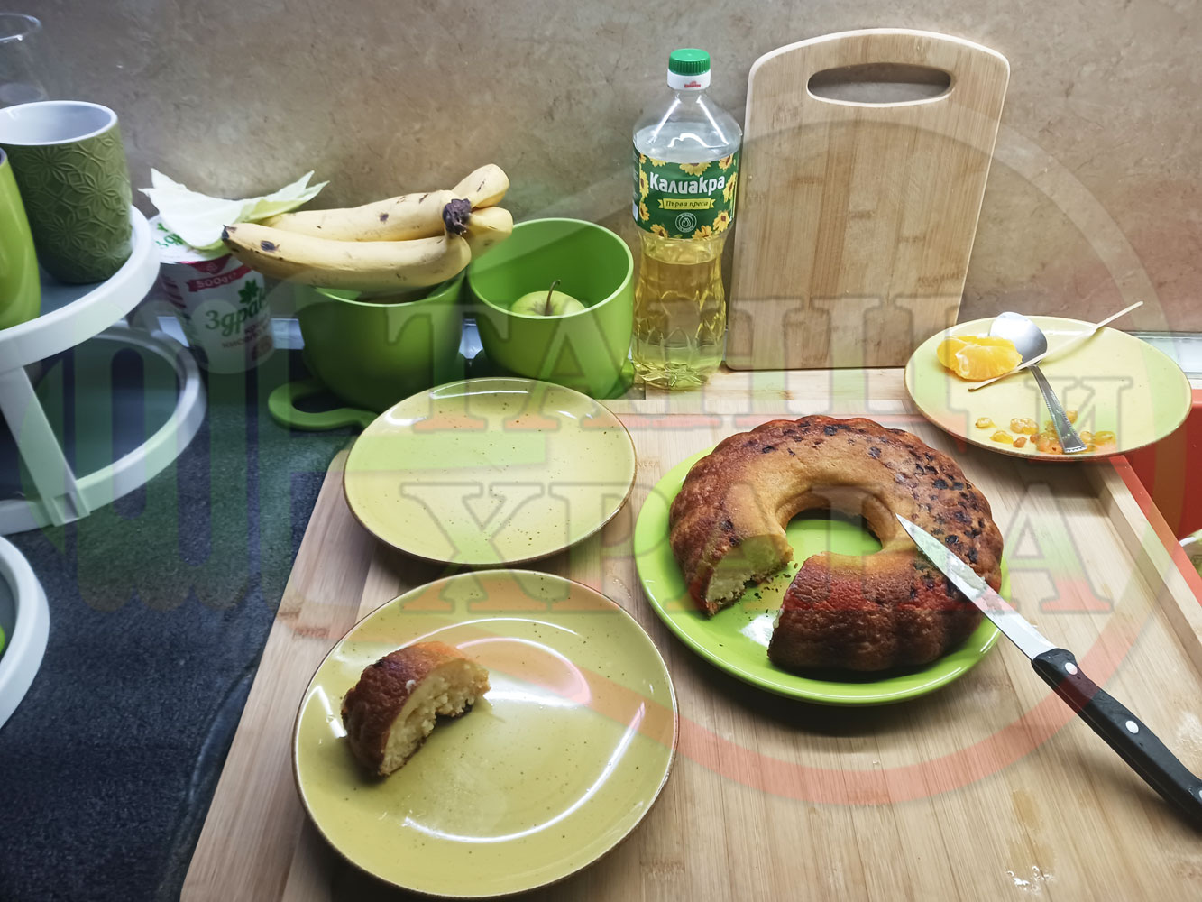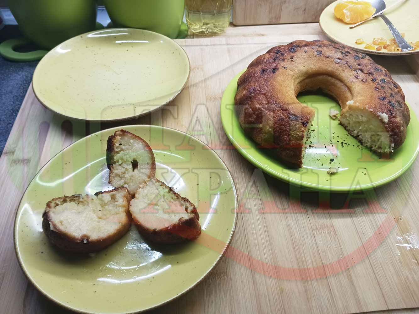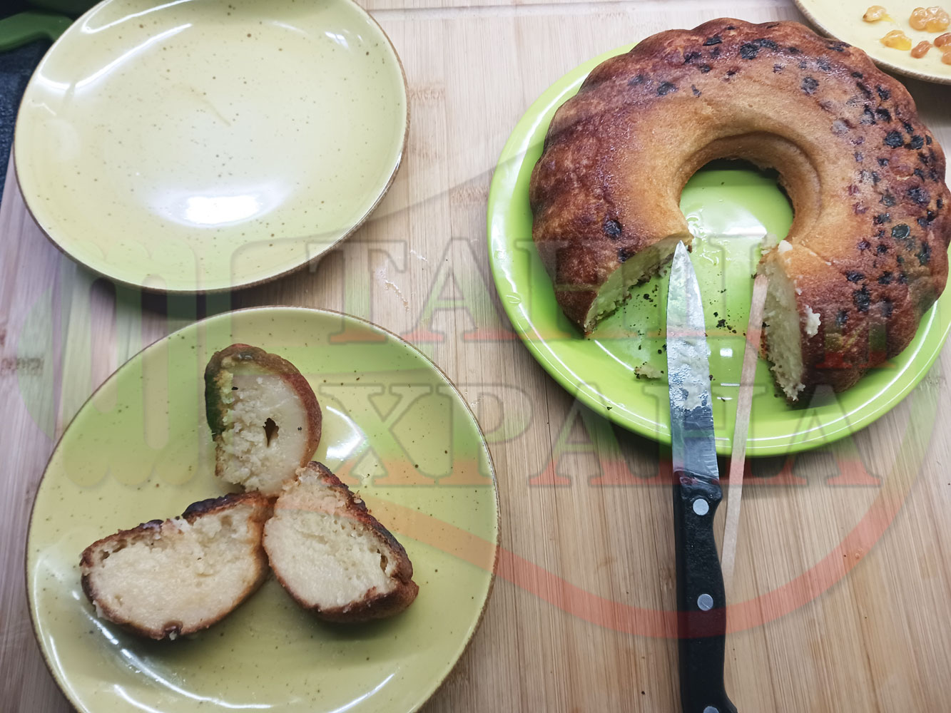 Български портокалов постен кремообразен кекс "Портокаловостафиден" приготвен с пресни портокали, кристална и пудра захар, нишесте праскова, брашно без набухвател и златни стафиди подходящ за постещи хора