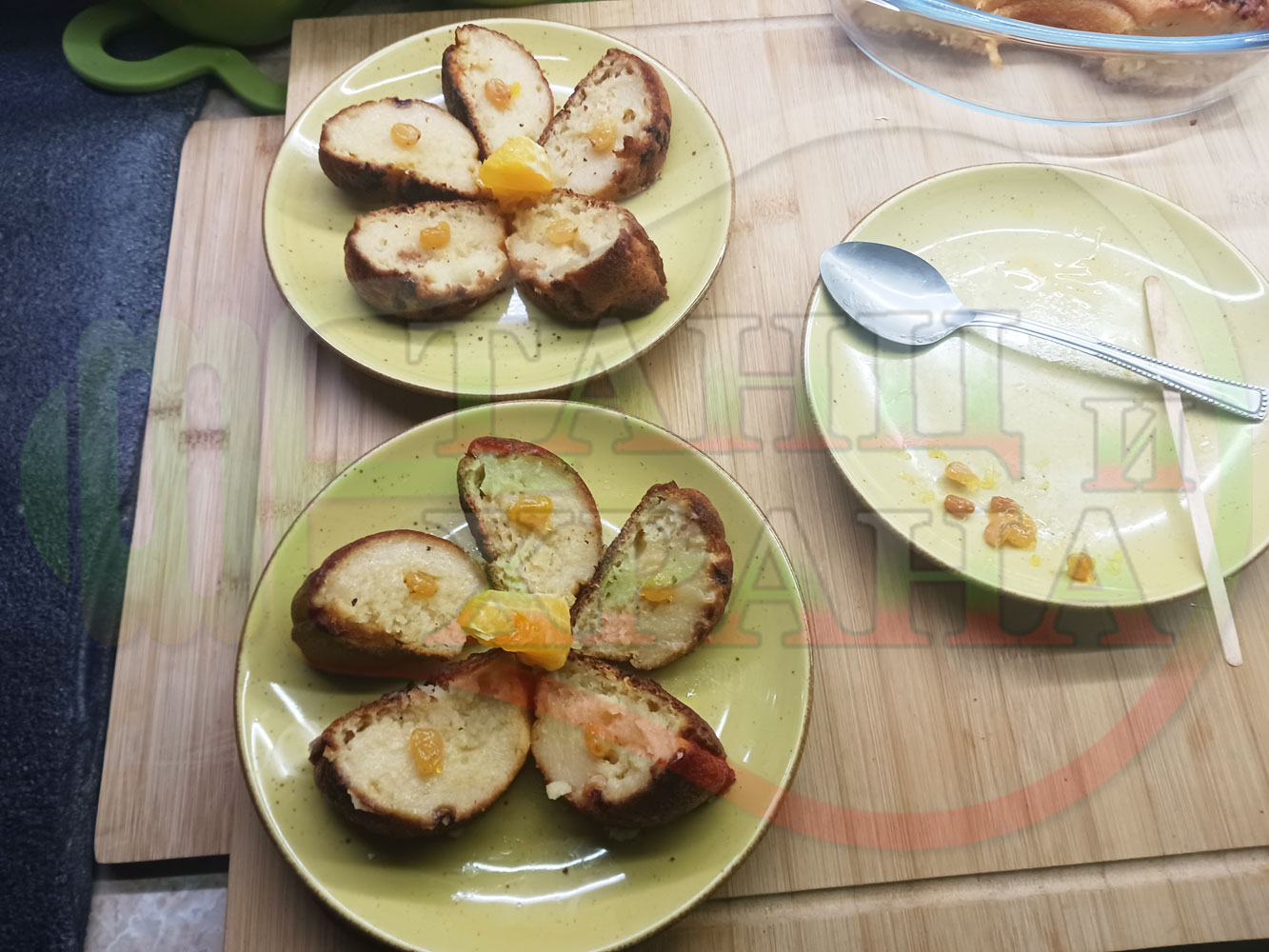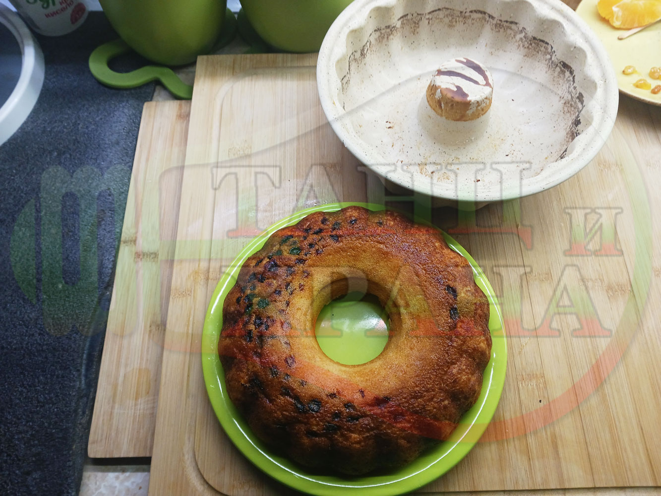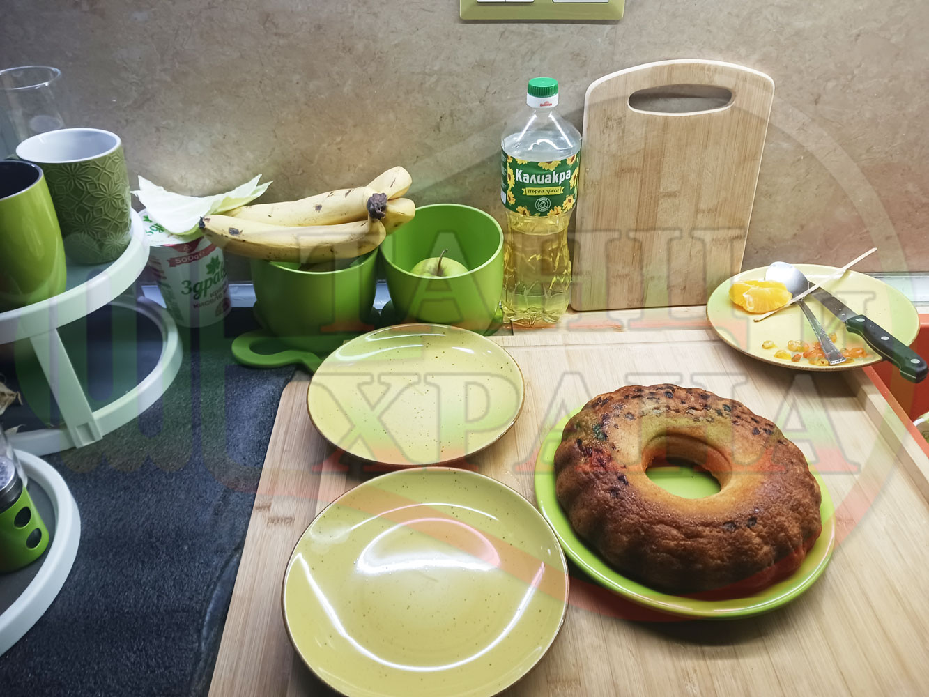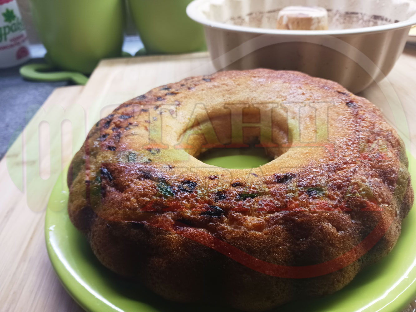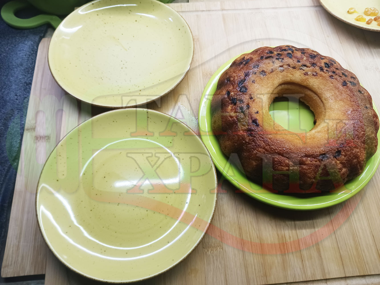 Български портокалов постен кремообразен кекс "Портокаловостафиден" приготвен с пресни портокали, кристална и пудра захар, нишесте праскова, брашно без набухвател и златни стафиди подходящ за постещи хора