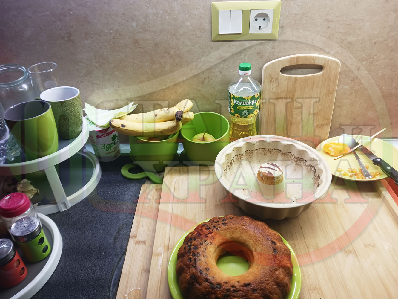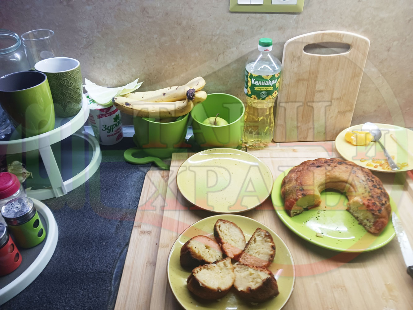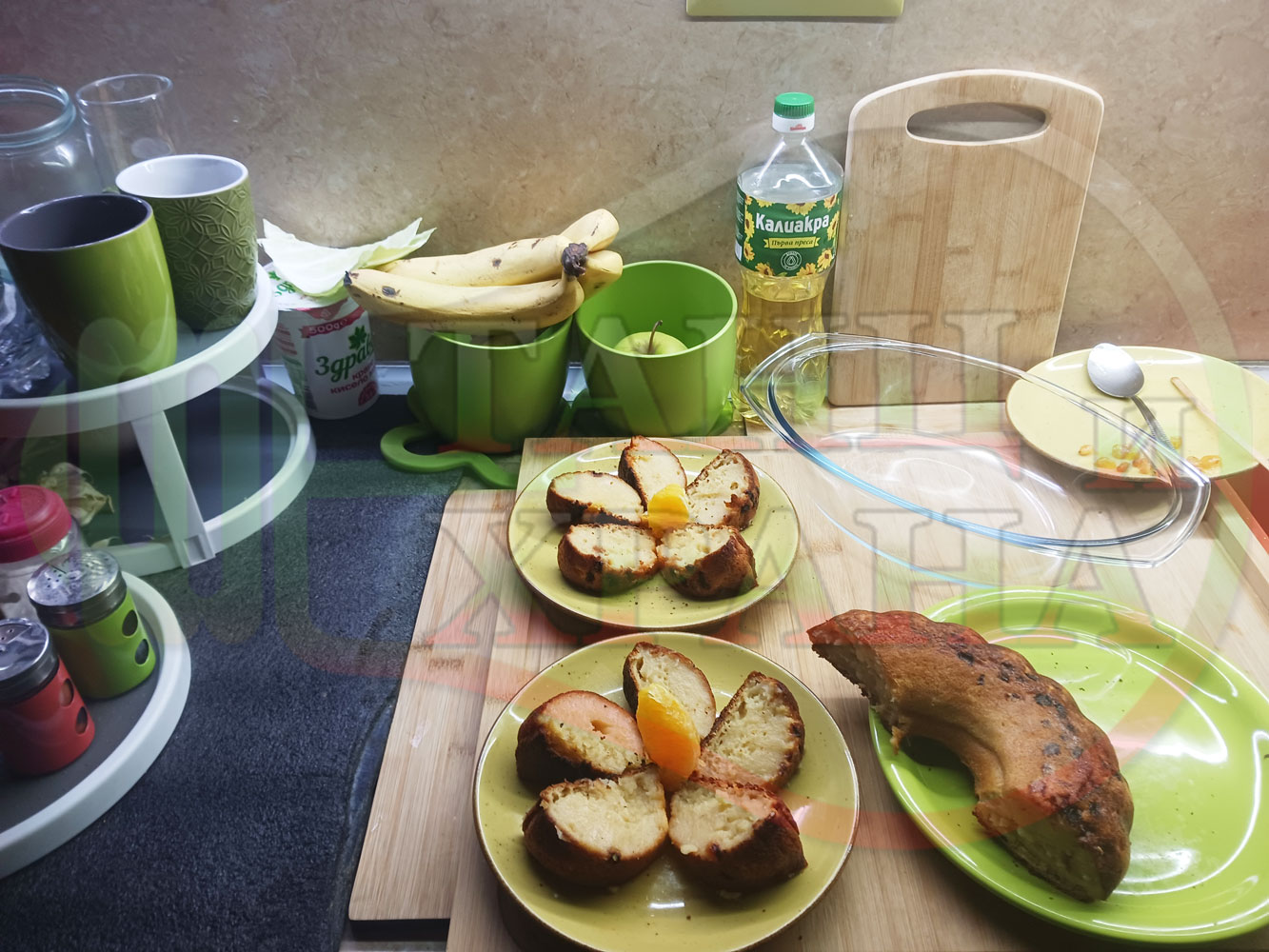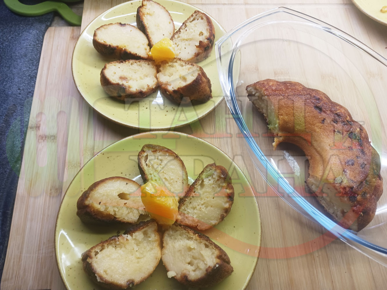 Български портокалов постен кремообразен кекс "Портокаловостафиден" приготвен с пресни портокали, кристална и пудра захар, нишесте праскова, брашно без набухвател и златни стафиди подходящ за постещи хора