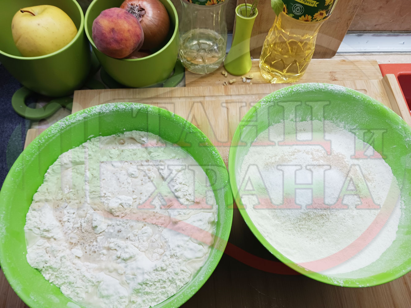 Пресейте брашното в купата и сипете половин пакетче суха мая, захарта, солта и хладка вода от чешмата. Започнете да замесвате тестото от средата на купата и със замесването оформете "топка" докато тестото се отлепи напълно от купата и намали лепкавостта си. Поръсвайте с брашно при необходимост докато замесвате (отлепянето на тестото от купата означава, че е омесено). Намажете купата и тестото с олио и покрийте купата с прозрачен найлонов плик (оставете отвор в единия край на плика за да "диша" тестото докато втасва). Поставете купата на топло място за около 70 минути за да втаса тестото и удвои обема си (времето за втасване зависи от топлината в кухнята).