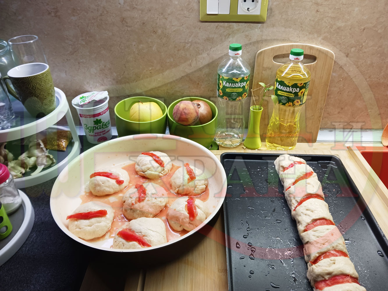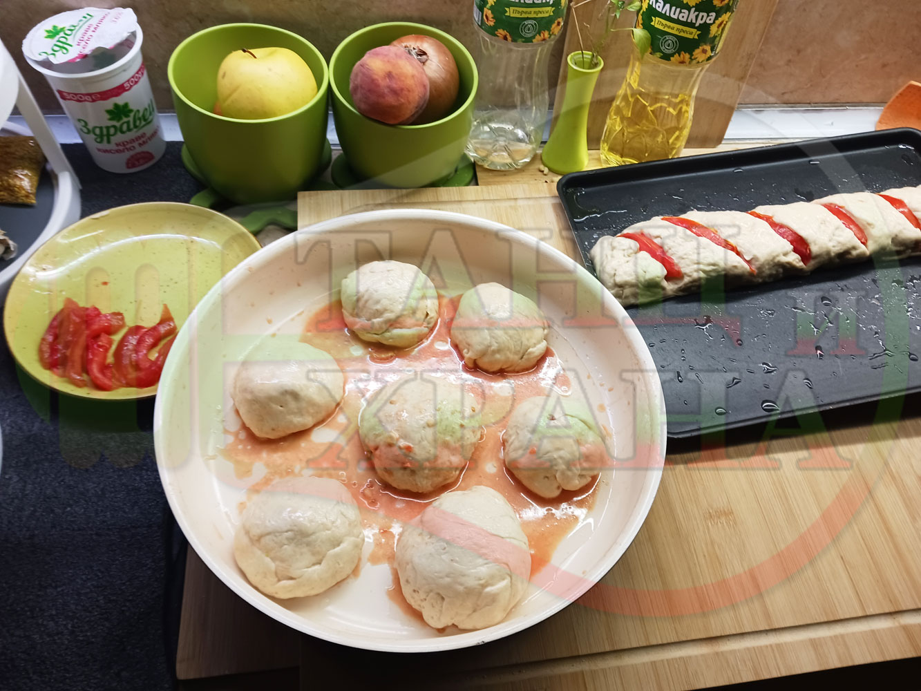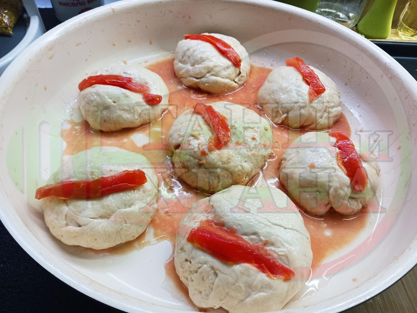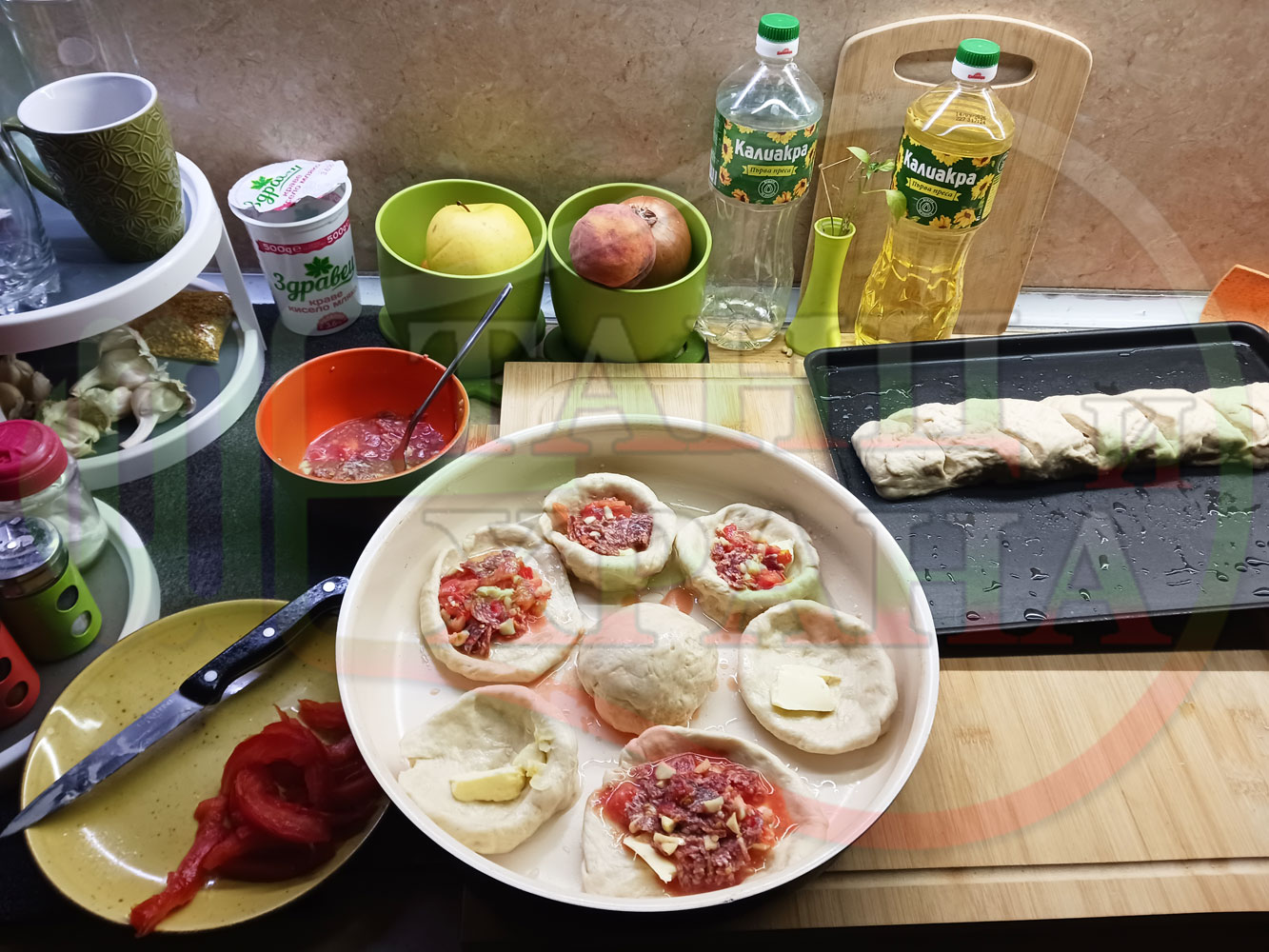 Пълнени питки "Смядовсколуканкови доматеночеснови" запечени на фурна с масло и яйчено доматена плънка от пресни домати, стар чесън, яйца и смядовска луканка омесени със суха мая