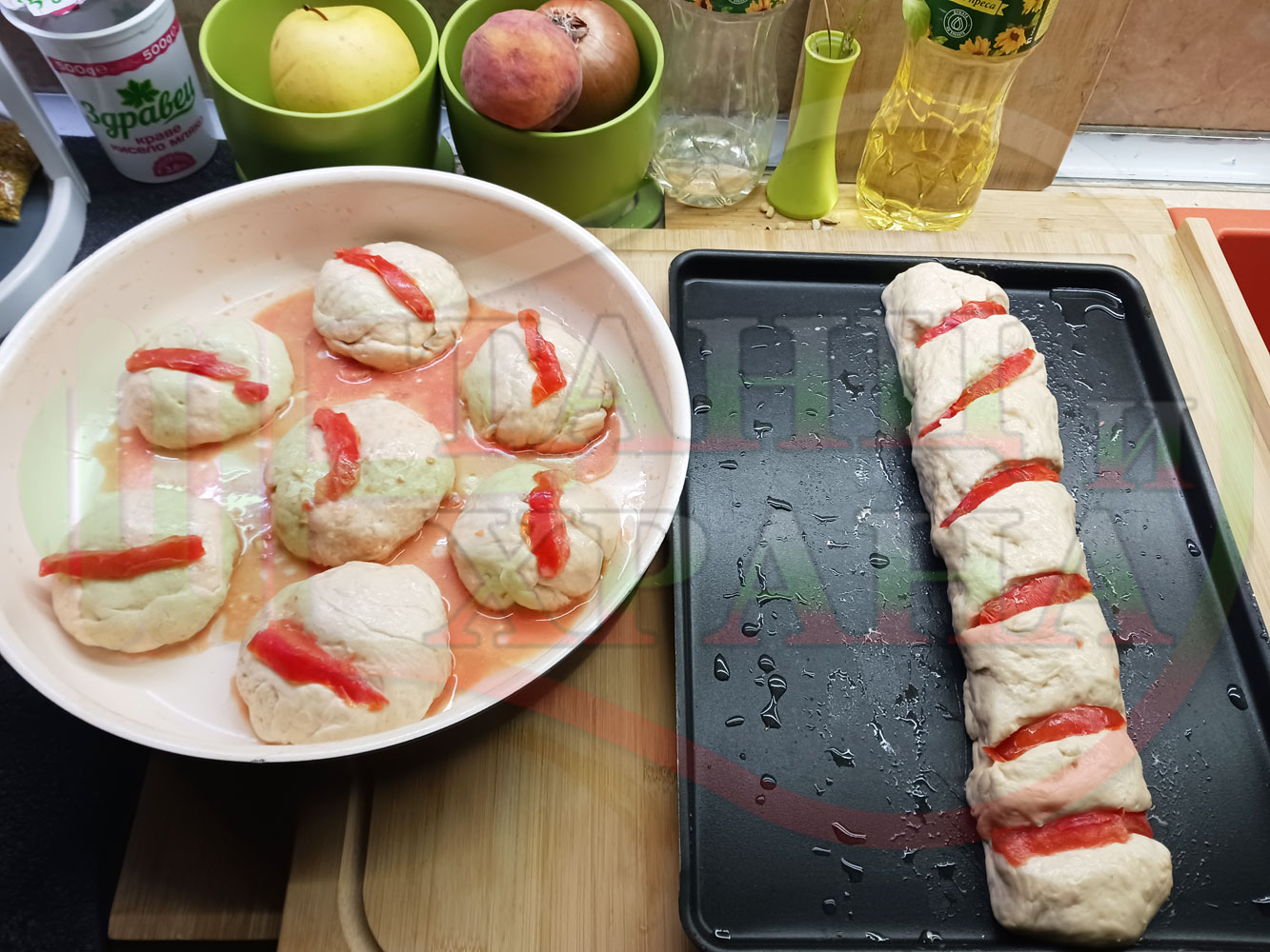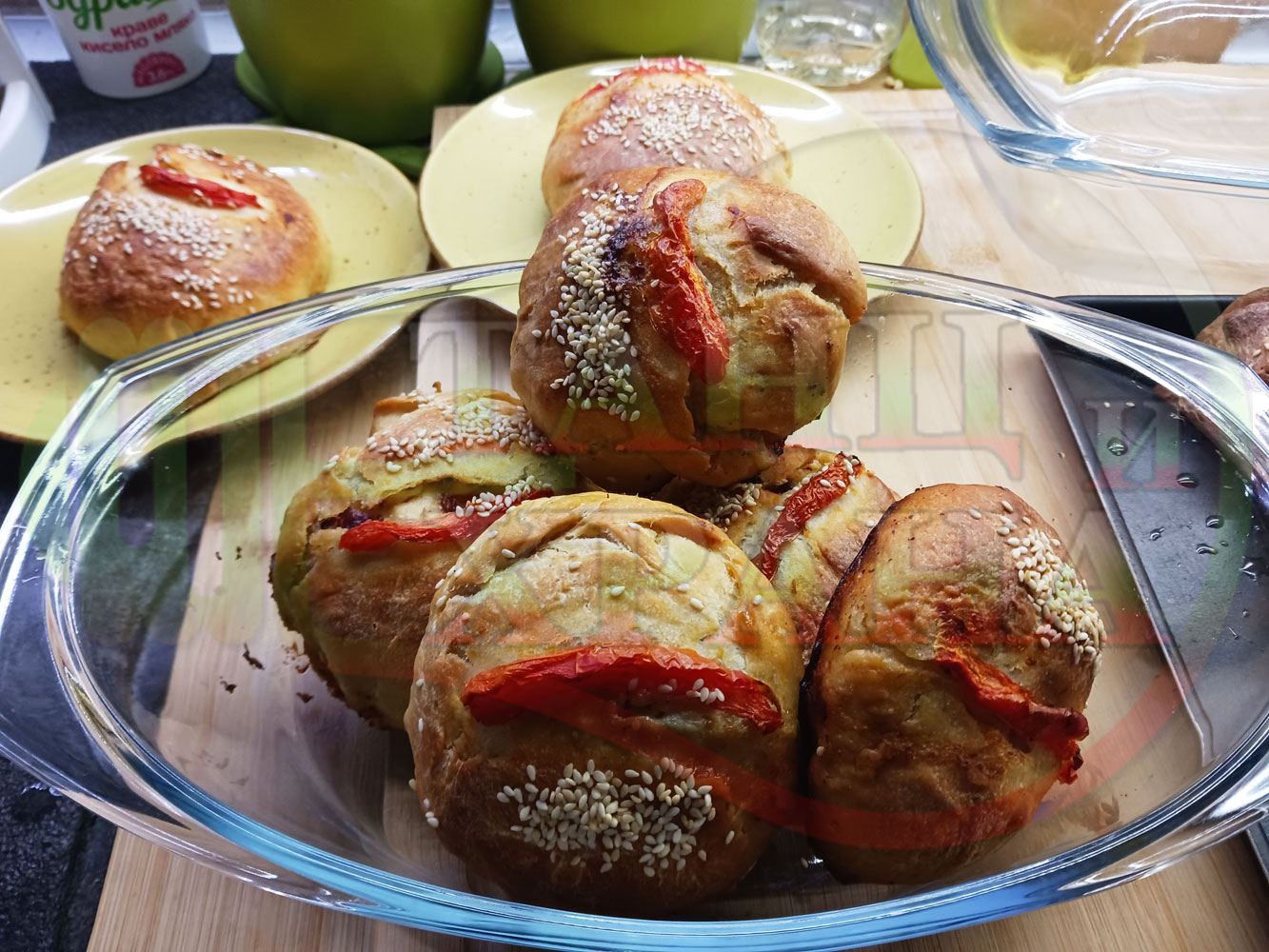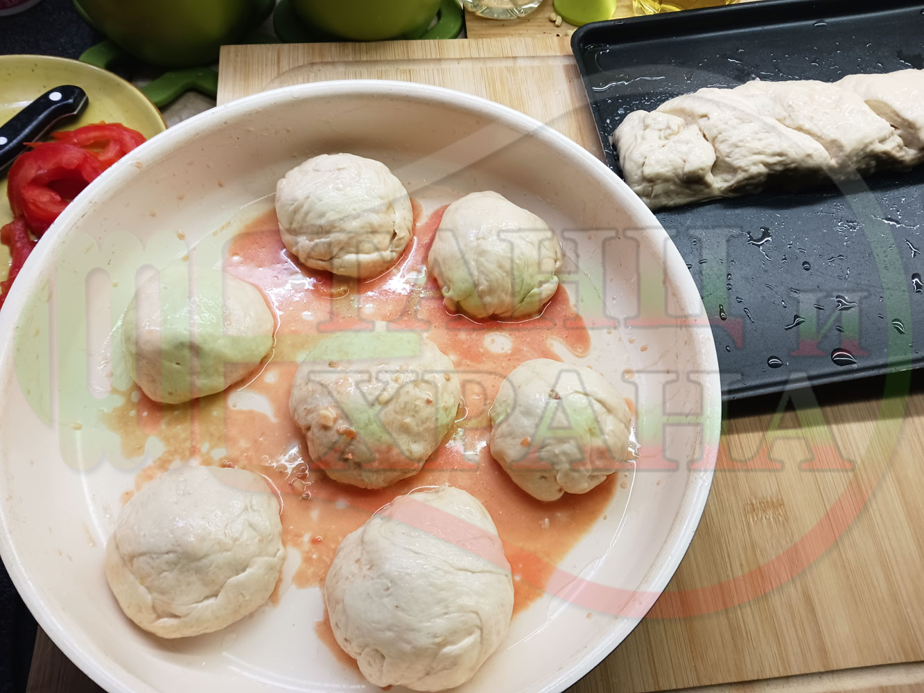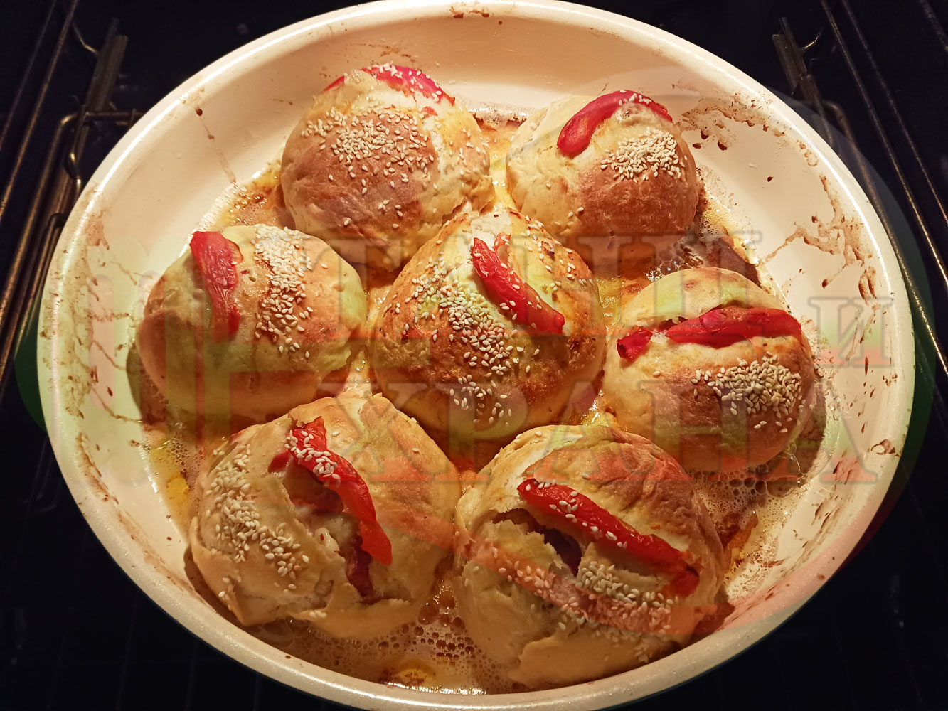 Пълнени питки "Смядовсколуканкови доматеночеснови" запечени на фурна с масло и яйчено доматена плънка от пресни домати, стар чесън, яйца и смядовска луканка омесени със суха мая