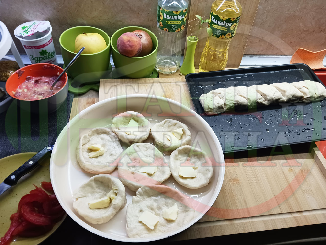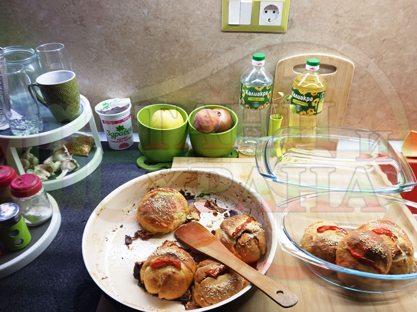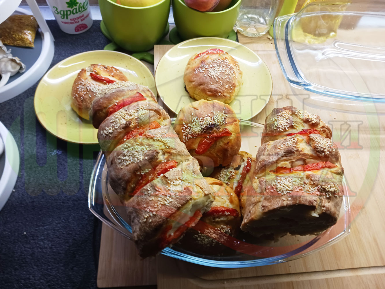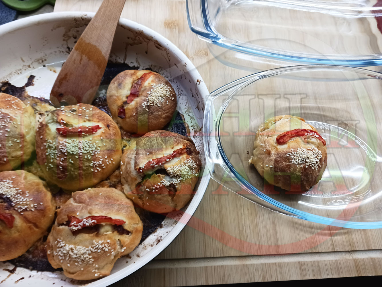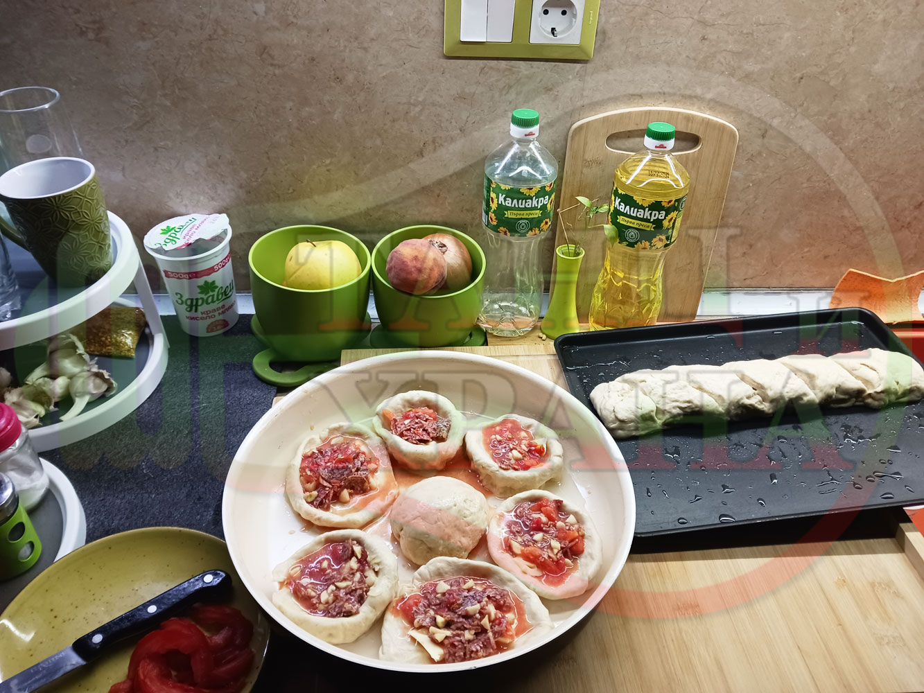 Пълнени питки "Смядовсколуканкови доматеночеснови" запечени на фурна с масло и яйчено доматена плънка от пресни домати, стар чесън, яйца и смядовска луканка омесени със суха мая