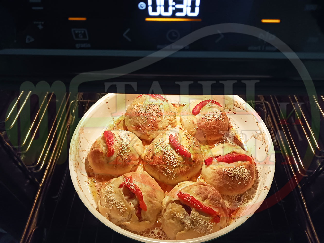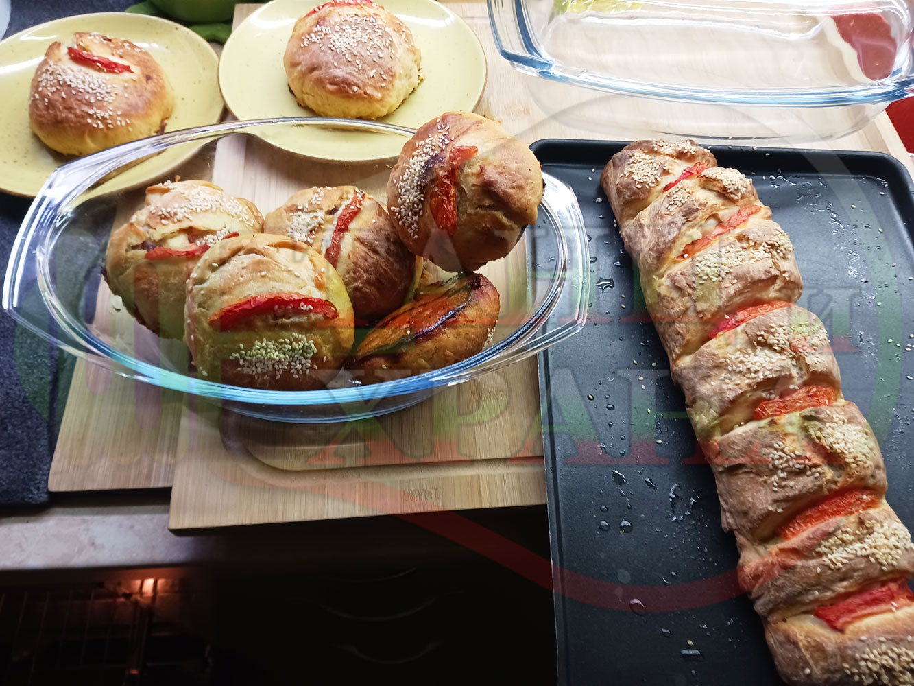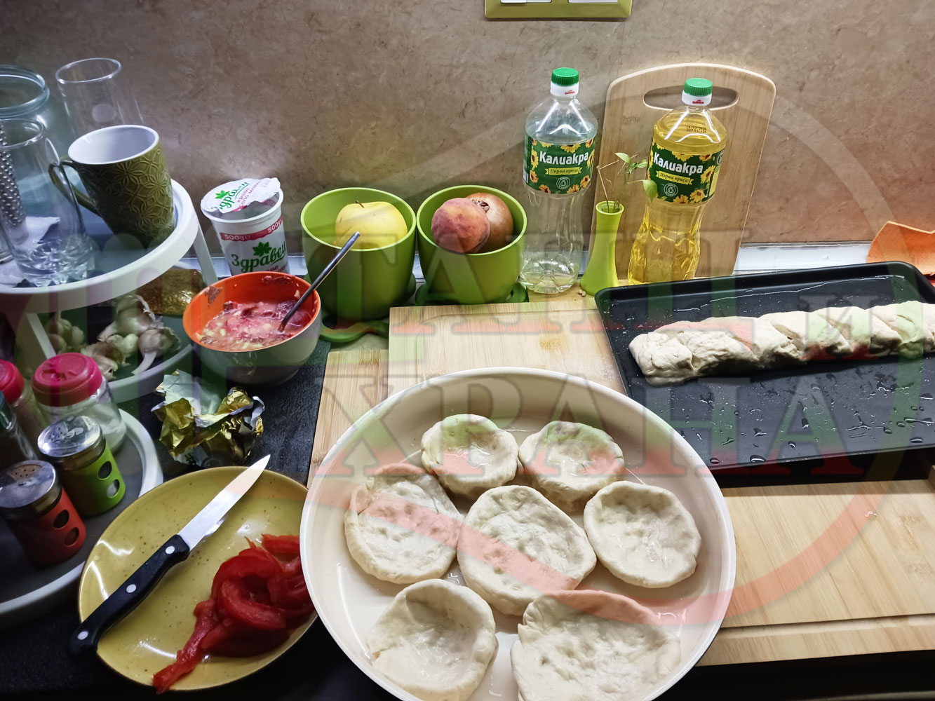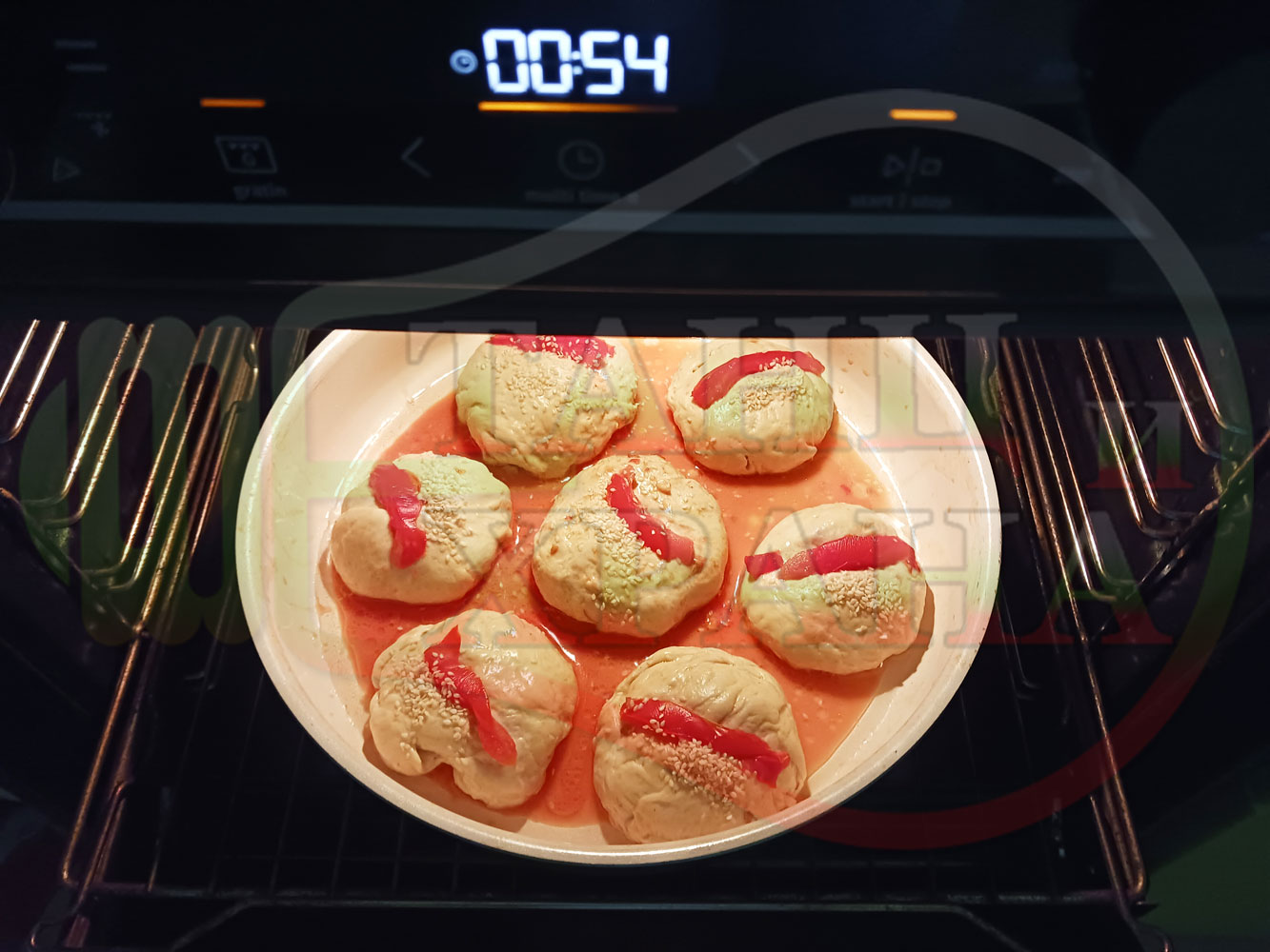 Пълнени питки "Смядовсколуканкови доматеночеснови" запечени на фурна с масло и яйчено доматена плънка от пресни домати, стар чесън, яйца и смядовска луканка омесени със суха мая