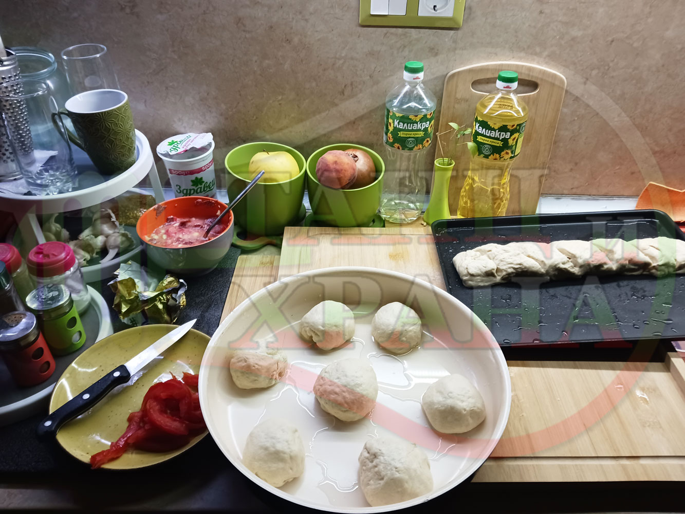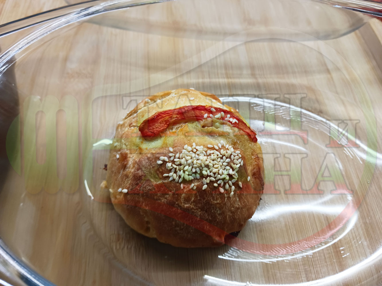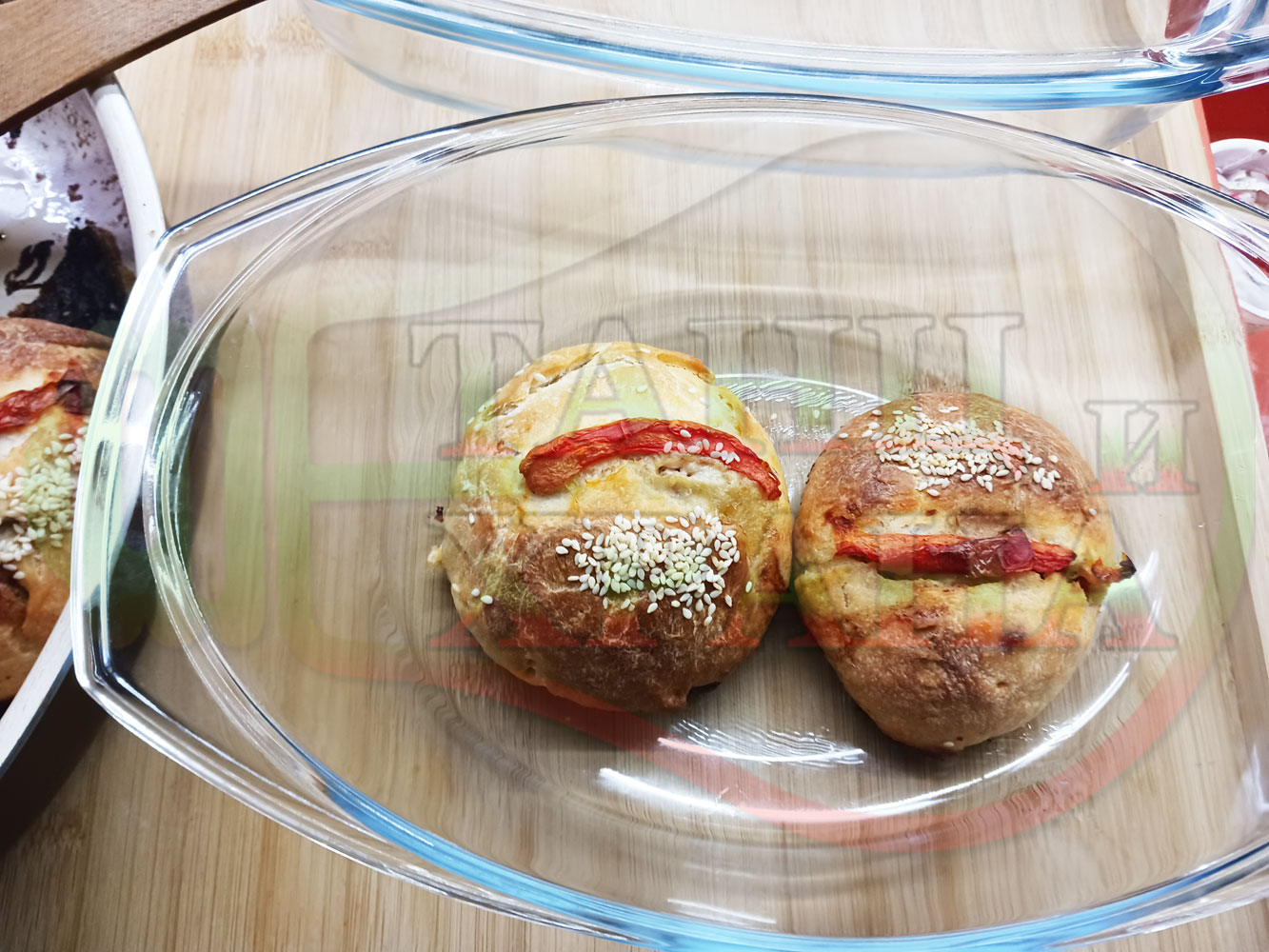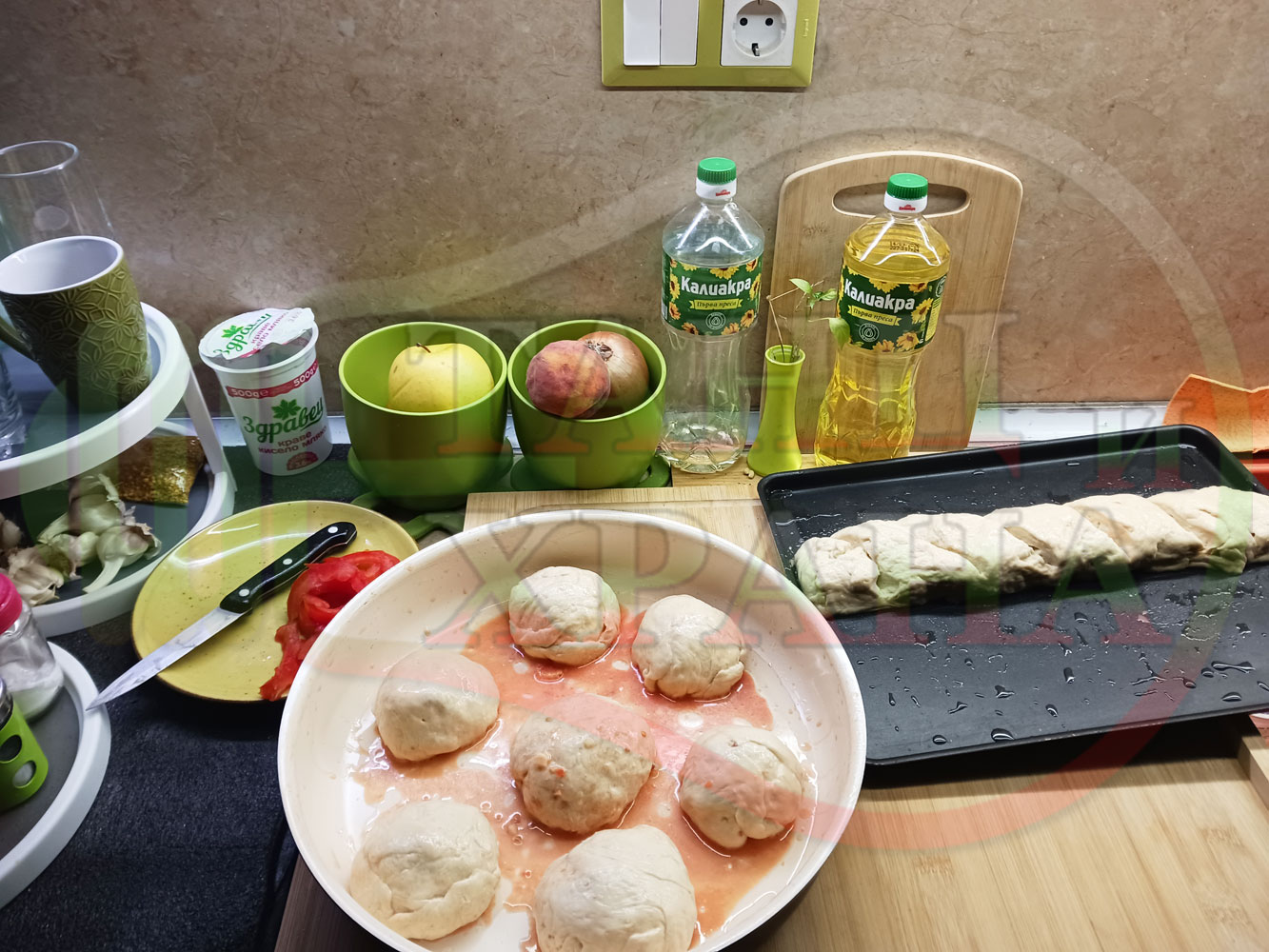 Пълнени питки "Смядовсколуканкови доматеночеснови" запечени на фурна с масло и яйчено доматена плънка от пресни домати, стар чесън, яйца и смядовска луканка омесени със суха мая