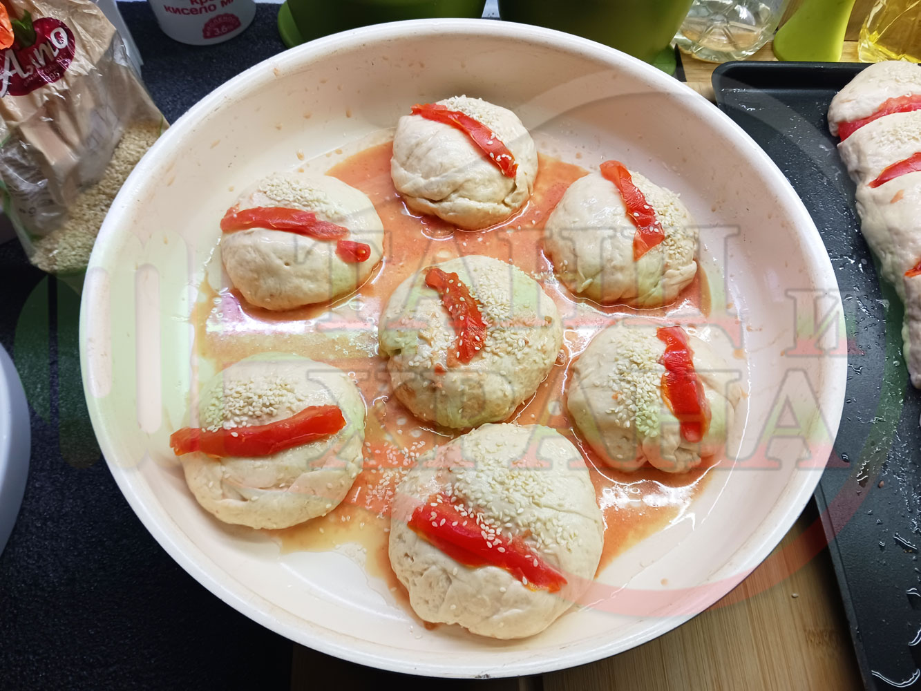 Сипете слънчогледово олио в тава за печене, размажете го равномерно по тавата черз накланяне или с четка и откъснете или отрежете от тестото приблизително еднакти парчета (големината на парчетата и броя са според броя на питките, които искате да оформите). Оформете с въртеливи движения кръгли топки от всяко парче и ги подредете в намазаната със слънчогледово олио тава за печене. Оформете вдлъбнатина в средата на всяка топка, поставете по 1 или няколко тънки парченца масло във вдлъбнатините и разпределете равномерно количество от яйчената плънка (с част от изтеклия сок на плънката намажете питките след като ги затворите). Затворете питките, така че да не изпадне плънката и отново ги оформете на топки (при оформянето на топките част от сока на яйчено доматената плънка изтича и по този начин питките се изпичат в сока и стават по-вкусни без да остават неовкусени с пълнката места в тях). Подредете питките с отстояние между тях за повторното им втасване и поставете по 1 доматена ивичка на всяка питка и ги поръсете със суровия сусам. Покрийте тавата с кърпа, хартия или найлонов плик и я оставете на топло за около 30 минути докато топките втасат повторно и удвоят обема си (при топла кухня не покривайте тавата).