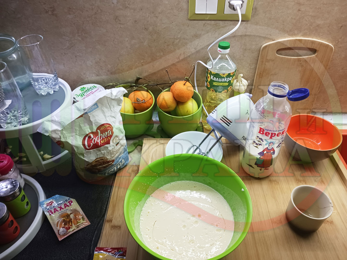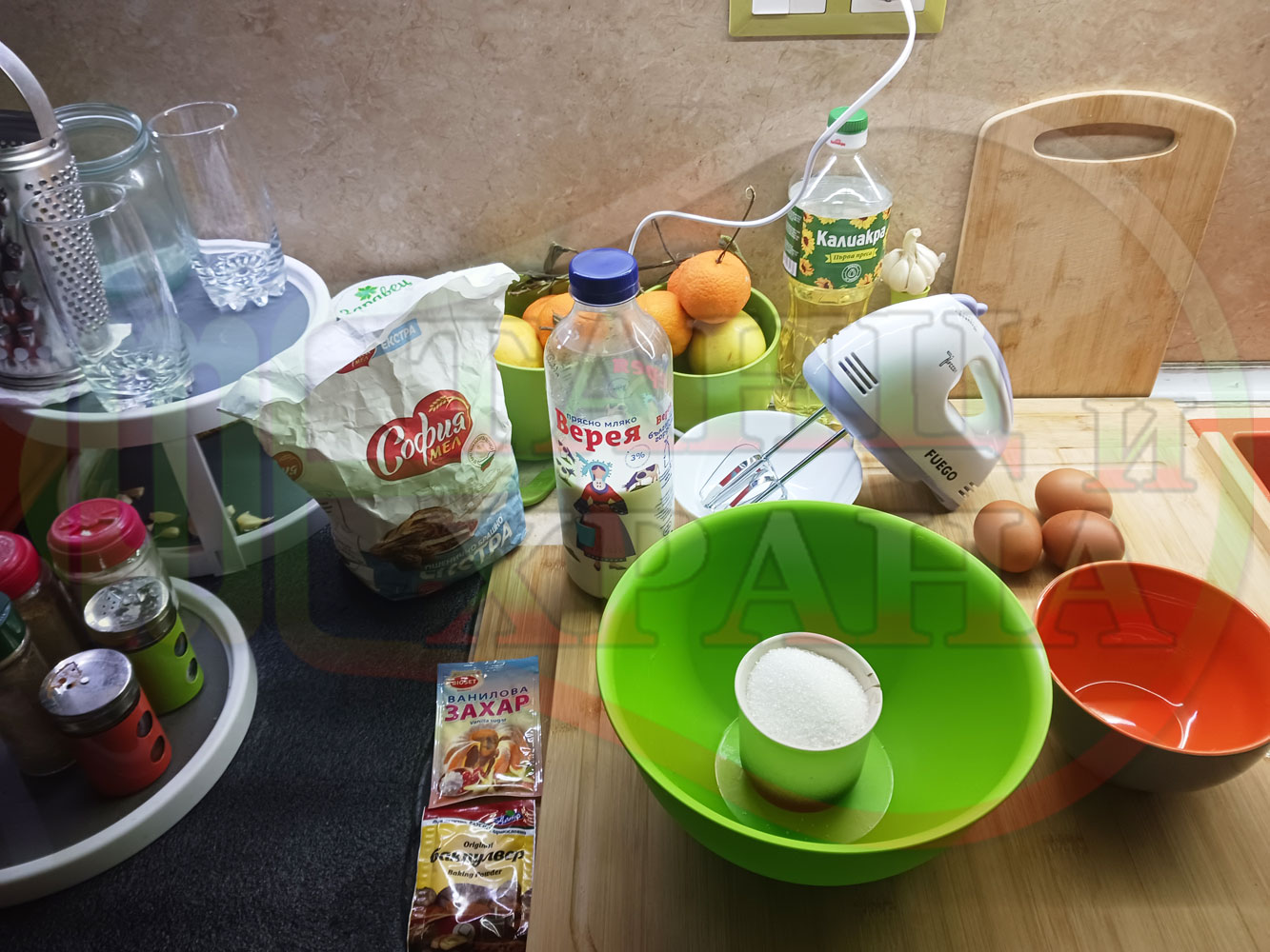 ПРОДУКТИ: Приблизителни количества за мандаринова кексова торта "Мандариновобелтъчна" изпечена на фурна с белтъчен крем и пресни мандарини приготвена с кексово тесто с яйца, брашно с набухвател, слънчогледово олио и прясно мляко
