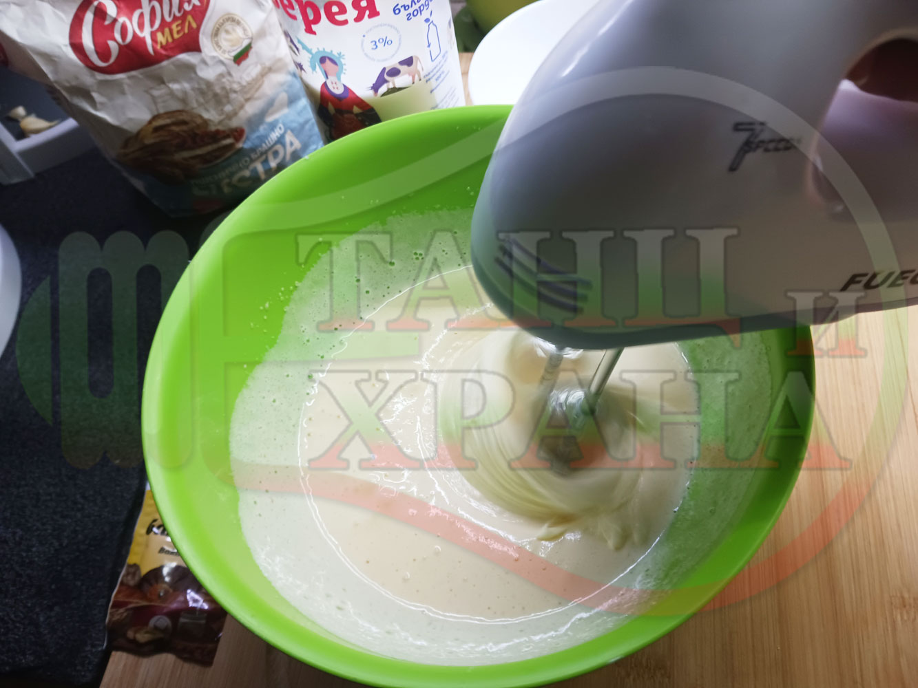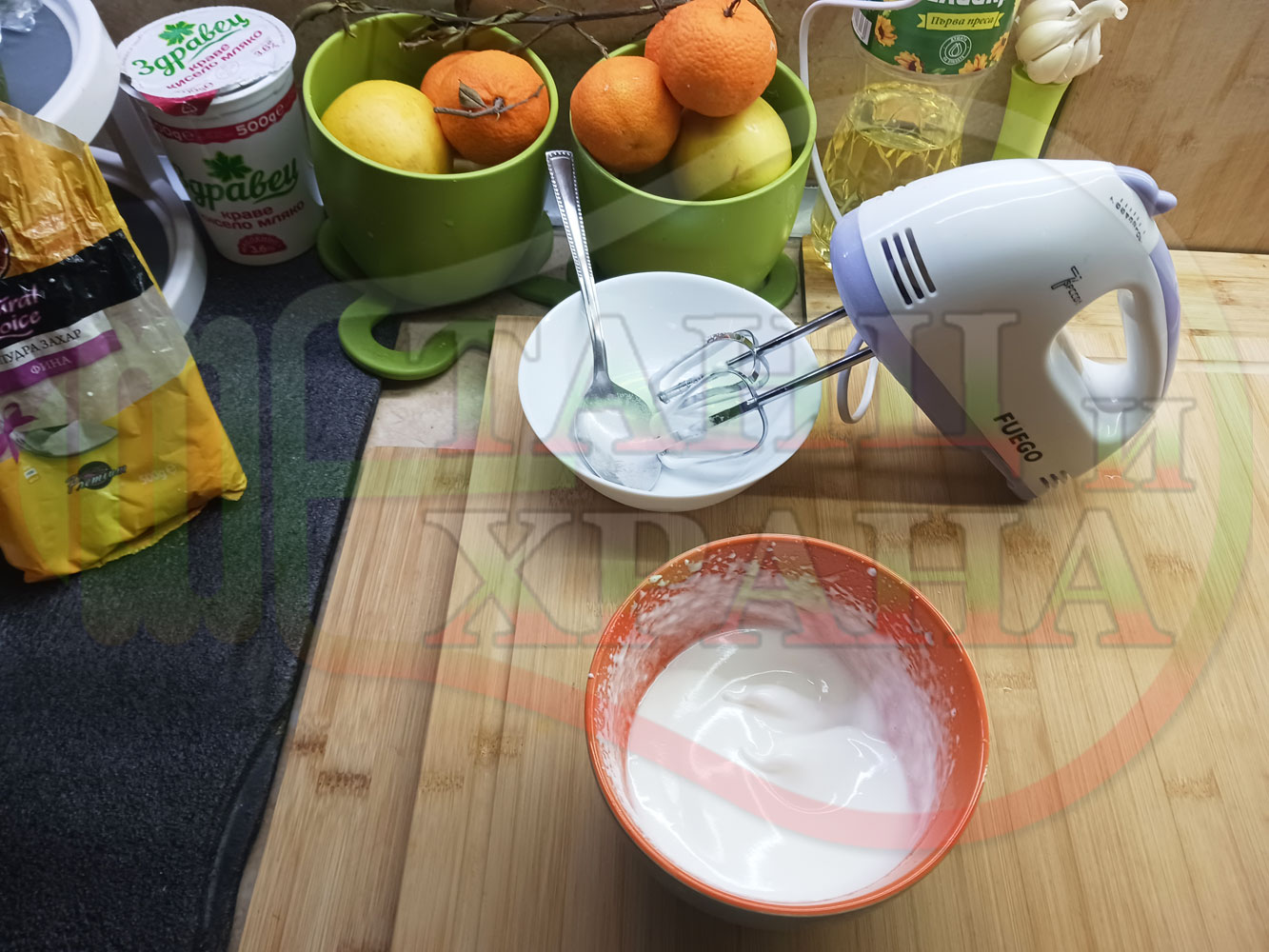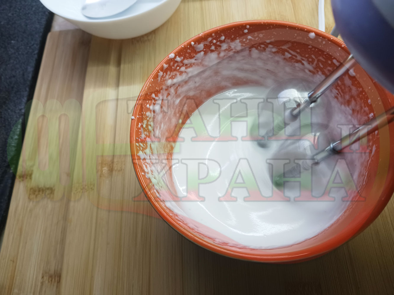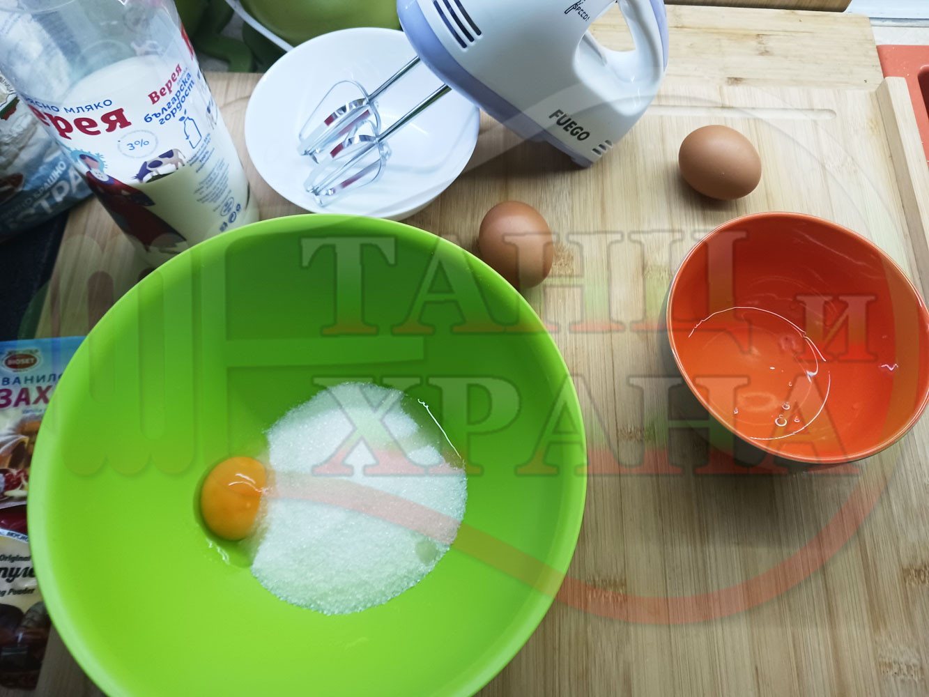 Сипете пудрата захар при заделения белтък от 1-то яйце и го разбийте с миксер до образуване на гъст, белтъчен крем (белтъчният крем не трябва да се разтича).