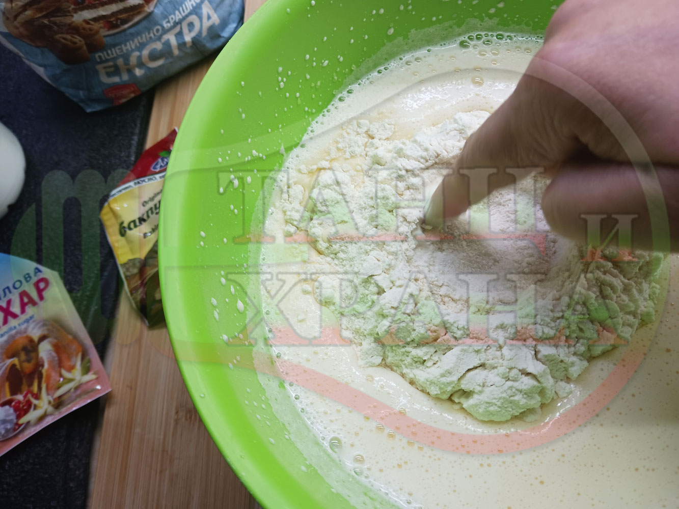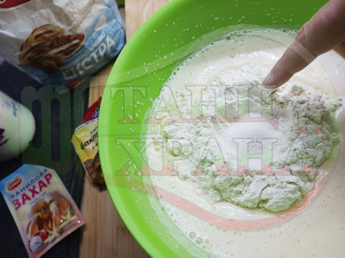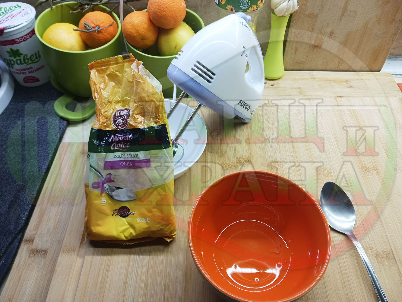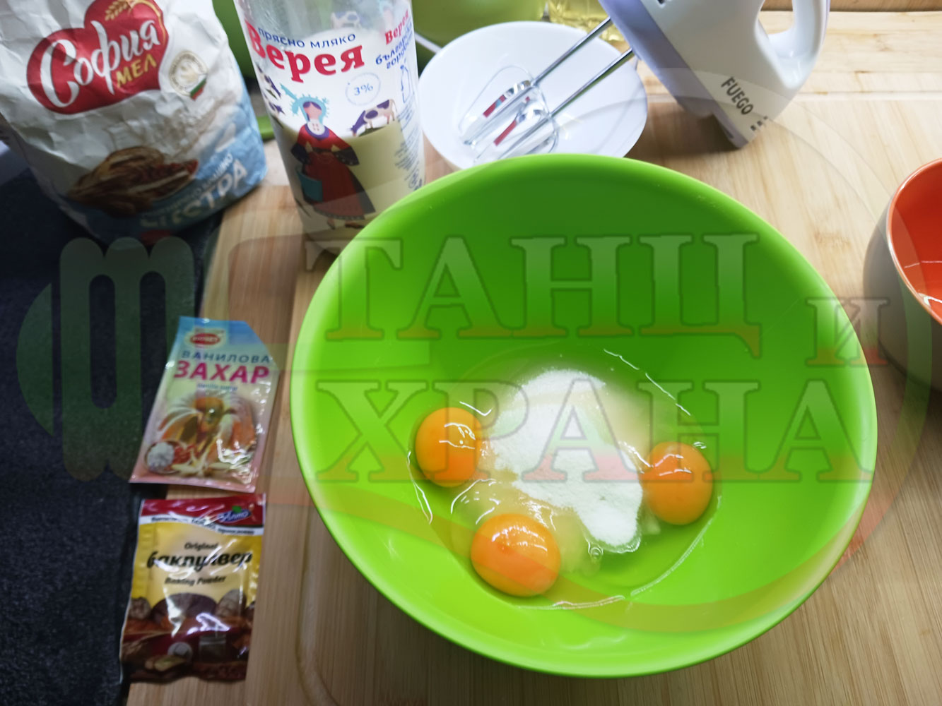 Сипете пудрата захар при заделения белтък от 1-то яйце и го разбийте с миксер до образуване на гъст, белтъчен крем (белтъчният крем не трябва да се разтича).