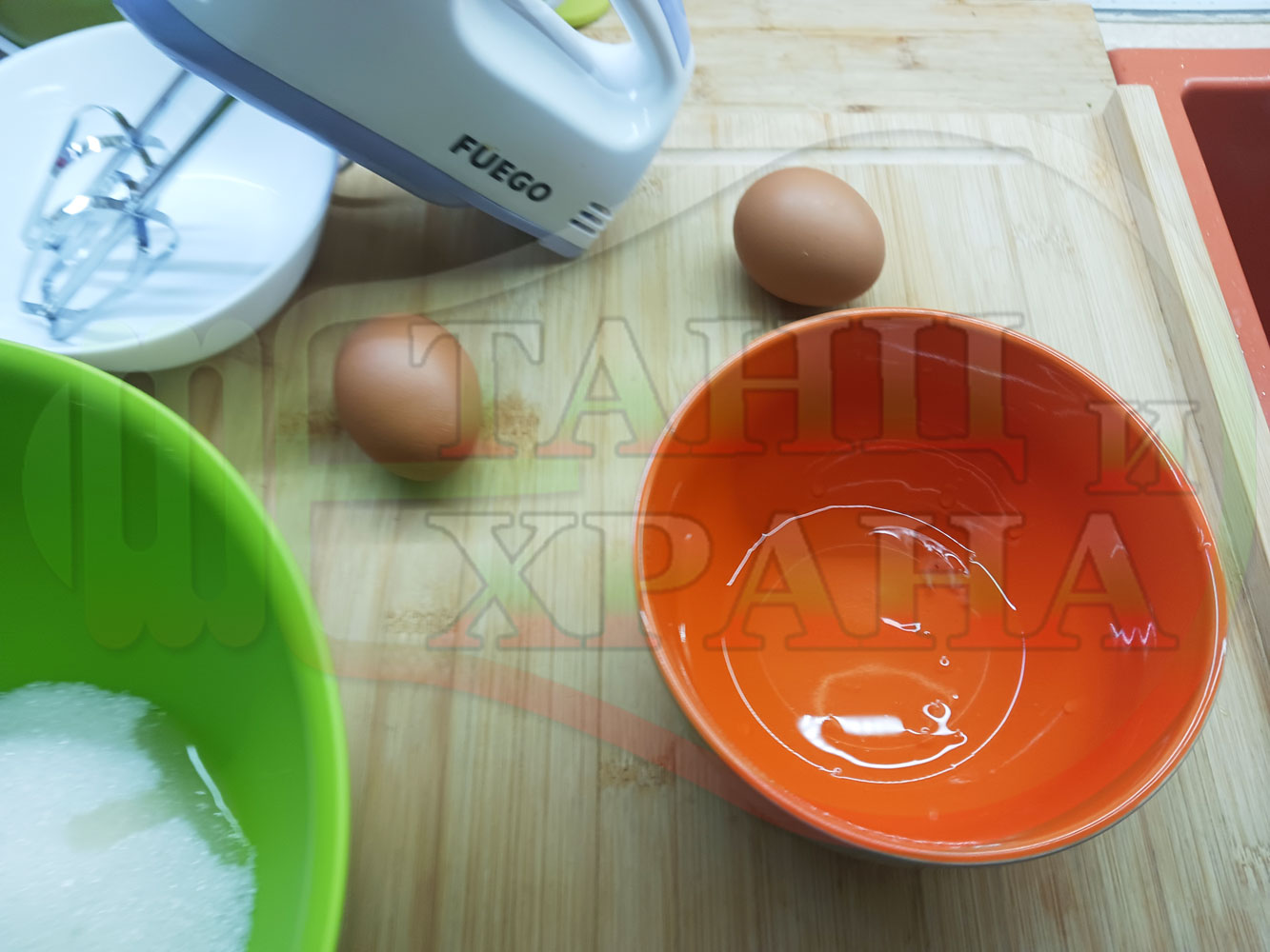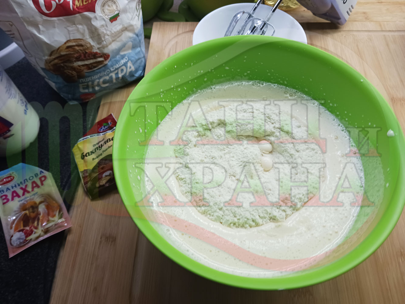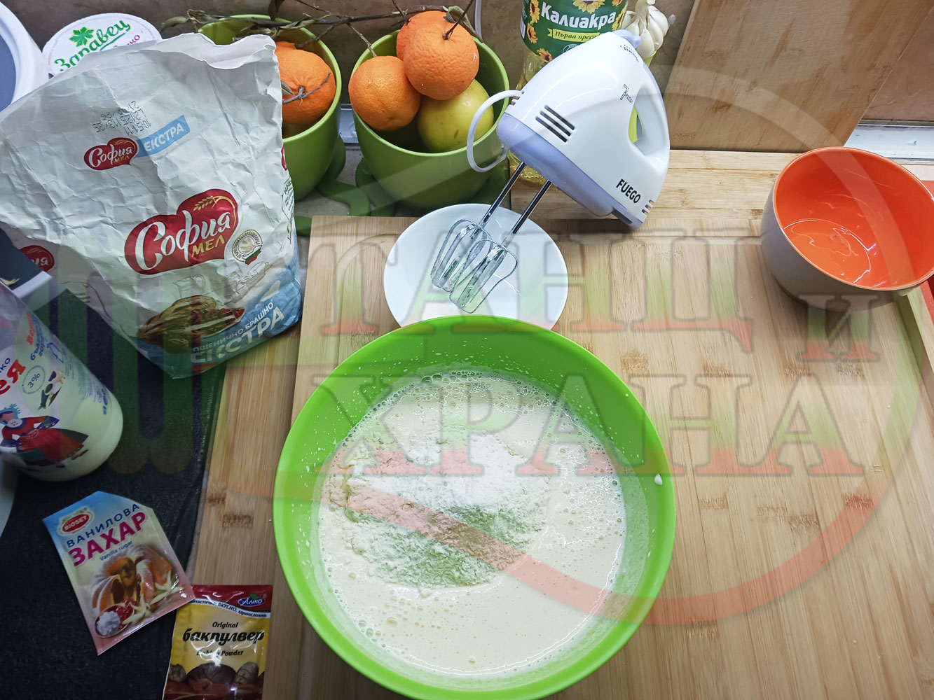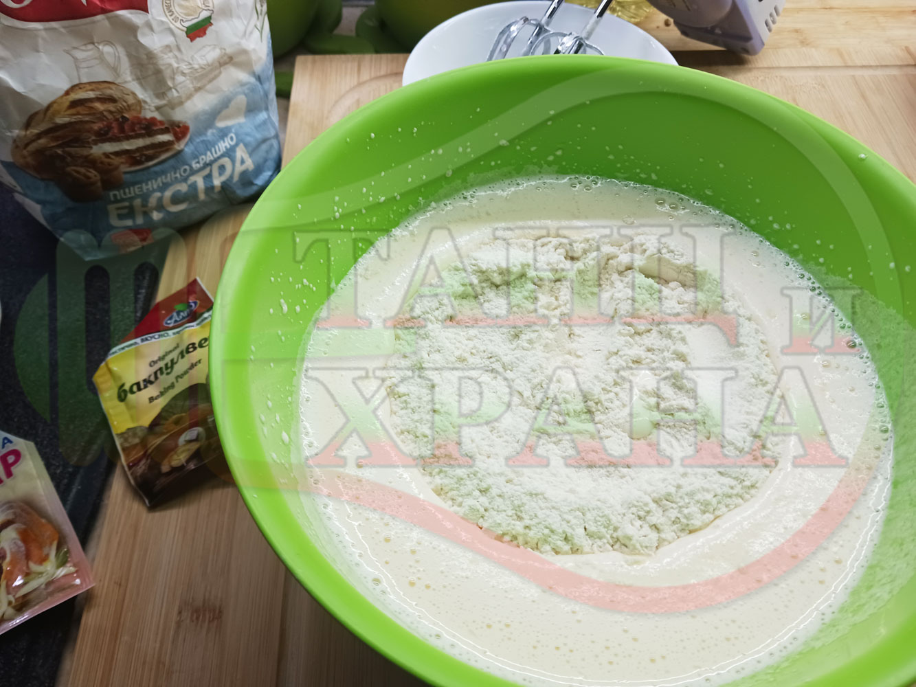 Сипете пудрата захар при заделения белтък от 1-то яйце и го разбийте с миксер до образуване на гъст, белтъчен крем (белтъчният крем не трябва да се разтича).