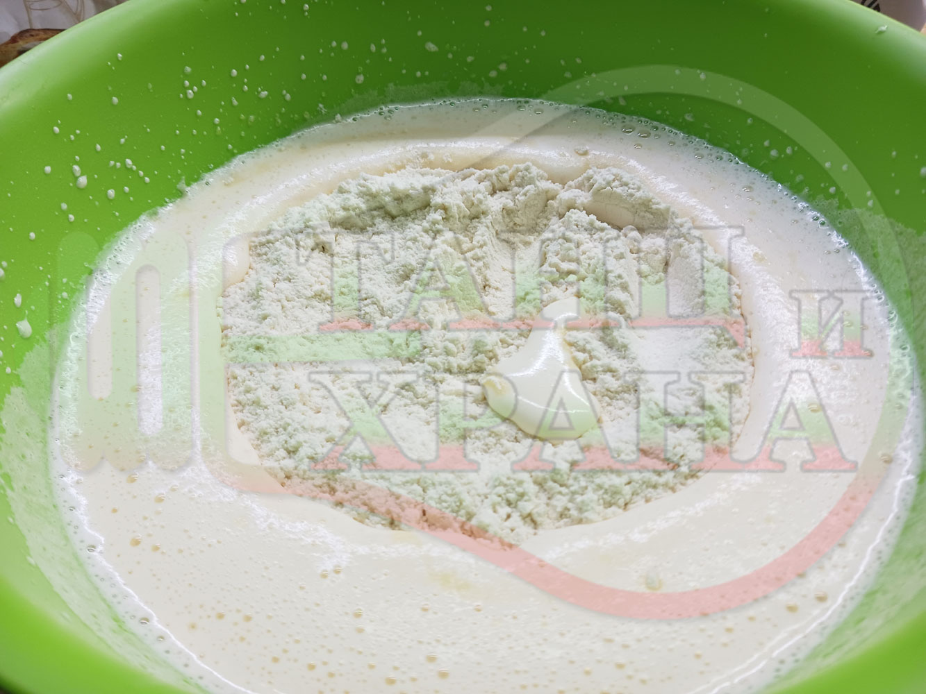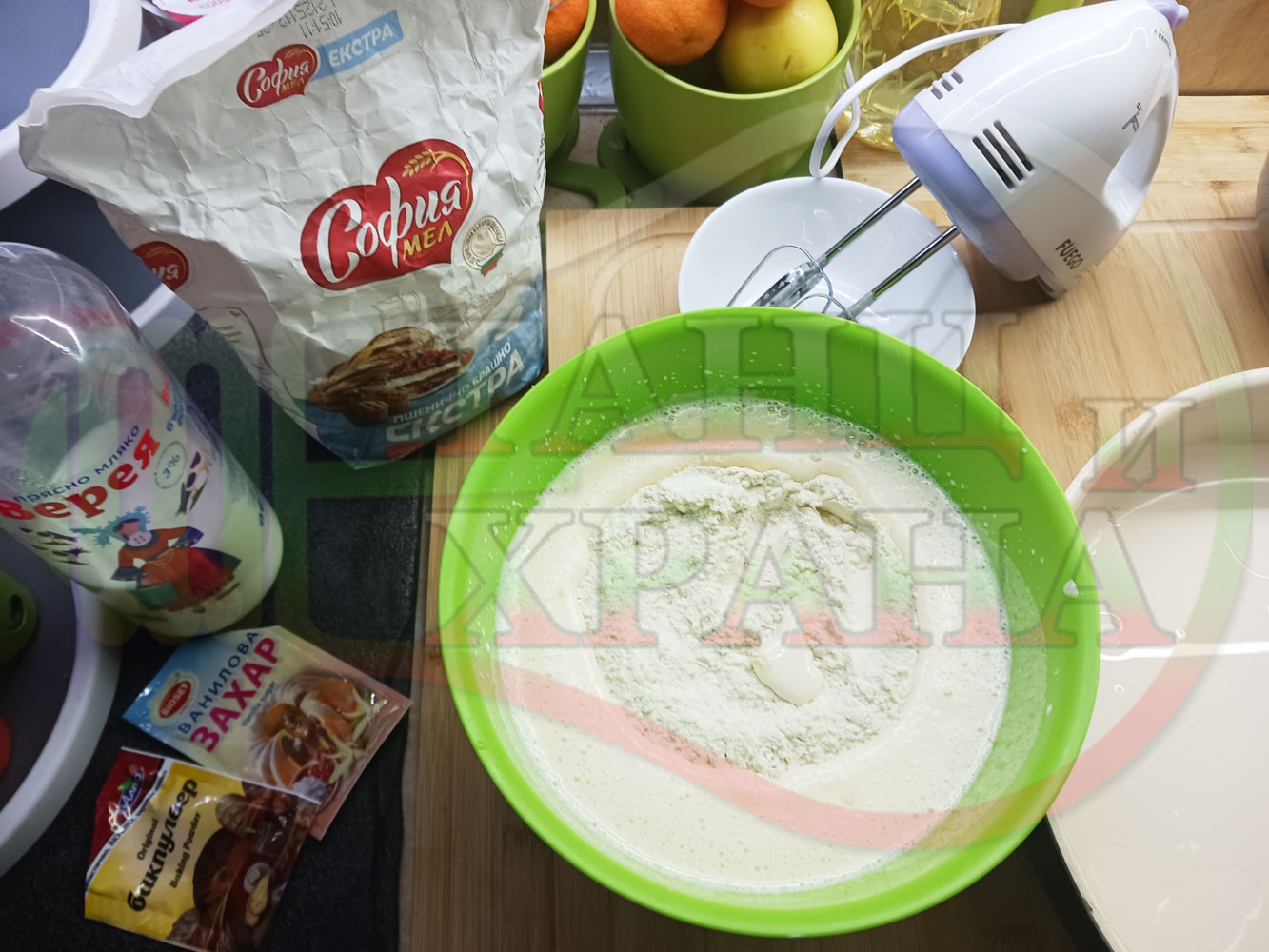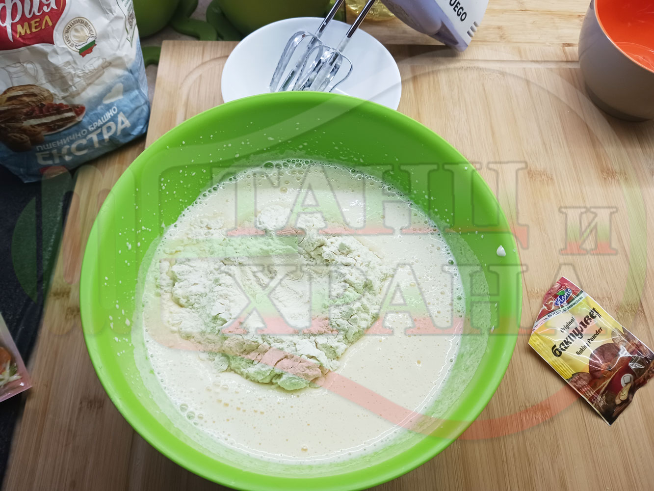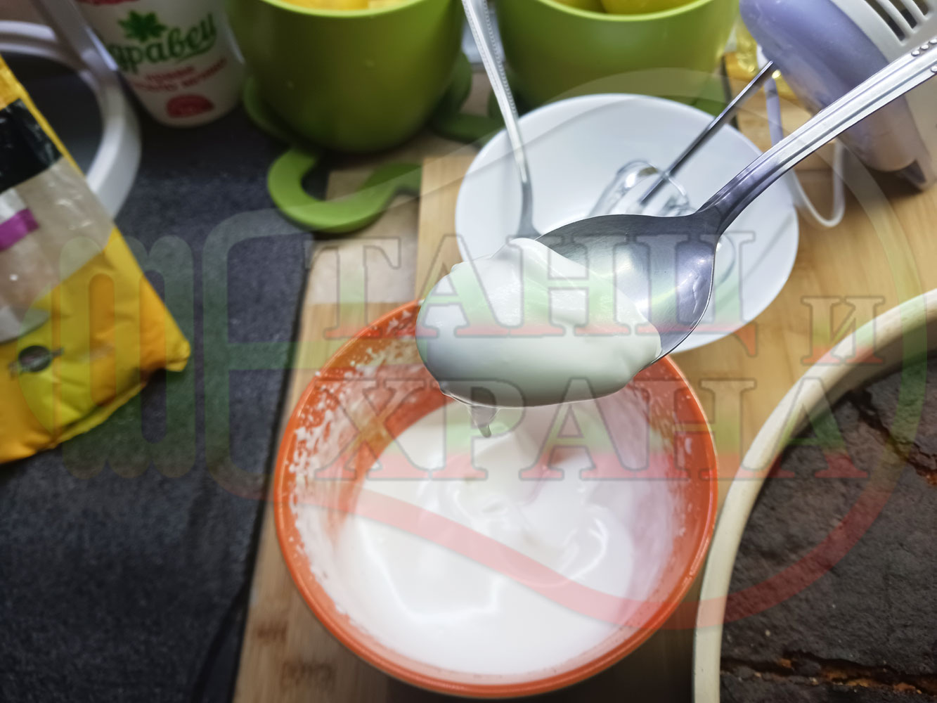 Сипете пудрата захар при заделения белтък от 1-то яйце и го разбийте с миксер до образуване на гъст, белтъчен крем (белтъчният крем не трябва да се разтича).