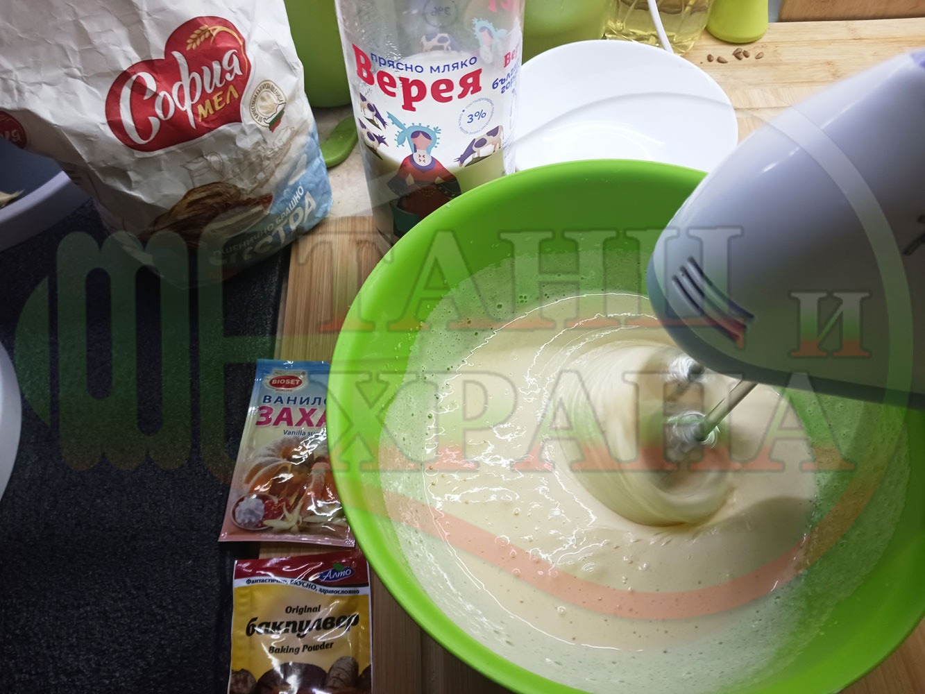 Сипете захарта и ваниловата захар в дълбока купа и добавете 2 цели яйца и 1 жълтък (запазете белтъка за белтъчния крем). Разбийте захарта с яйцата и жълтъка с миксер и сипете слънчогледовото олио и прясното мляко. Отново разбийте с миксера до образуване на пухкава кремообразна и средно гъста смес. Сипете брашното в яйчено млечната захарна смес и направете малко "кладенче" в брашното. Сипете бакпулвера в кладенчето и леко го разбъркайте в брашното за да се смеси напълно с брашното. След като сте смесили бакпулвера с брашното, започнете да разбивате с миксера на по-ниска скорост до образуване на средно гъсто кексово, хомогенизирано тесто (кексовото тесто при изсипване се "дипли" и на снимките се вижка каква трябва да е гъстотата).