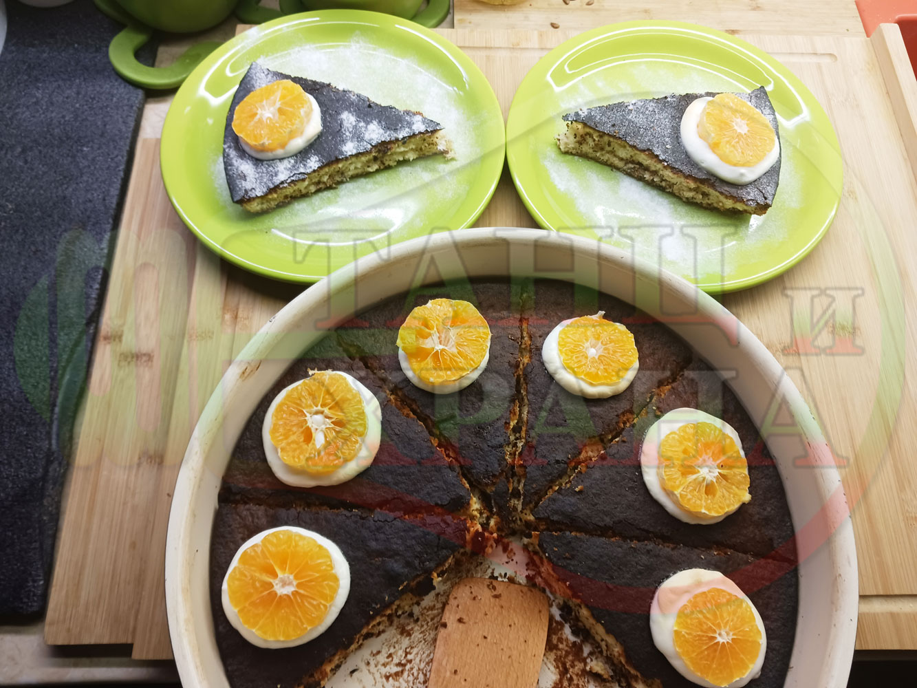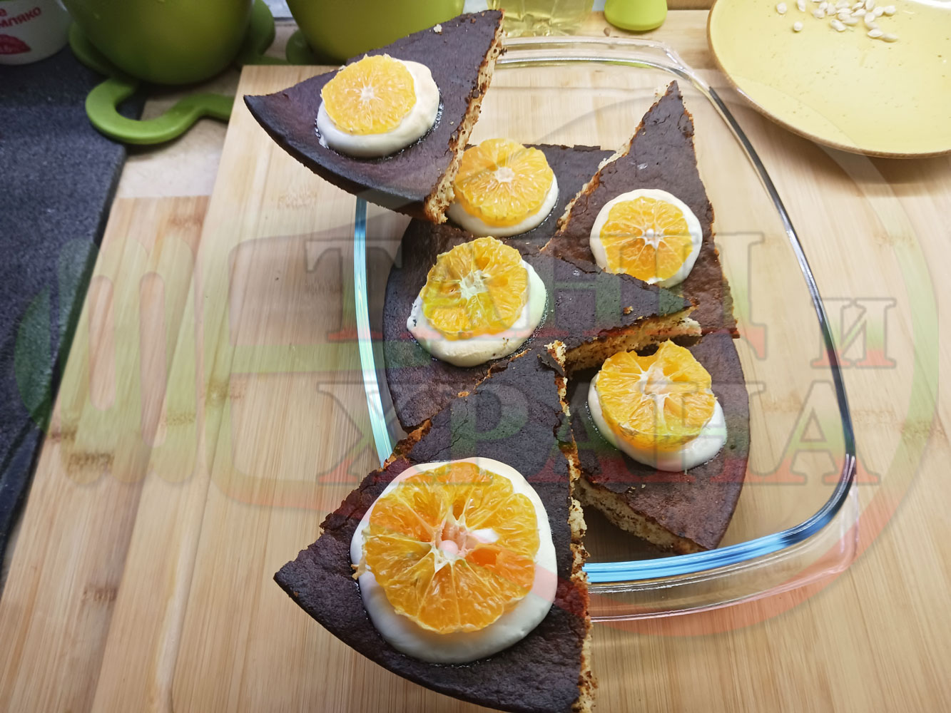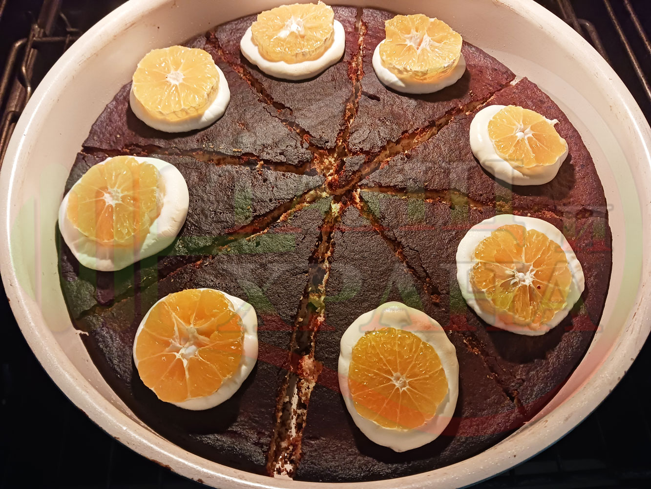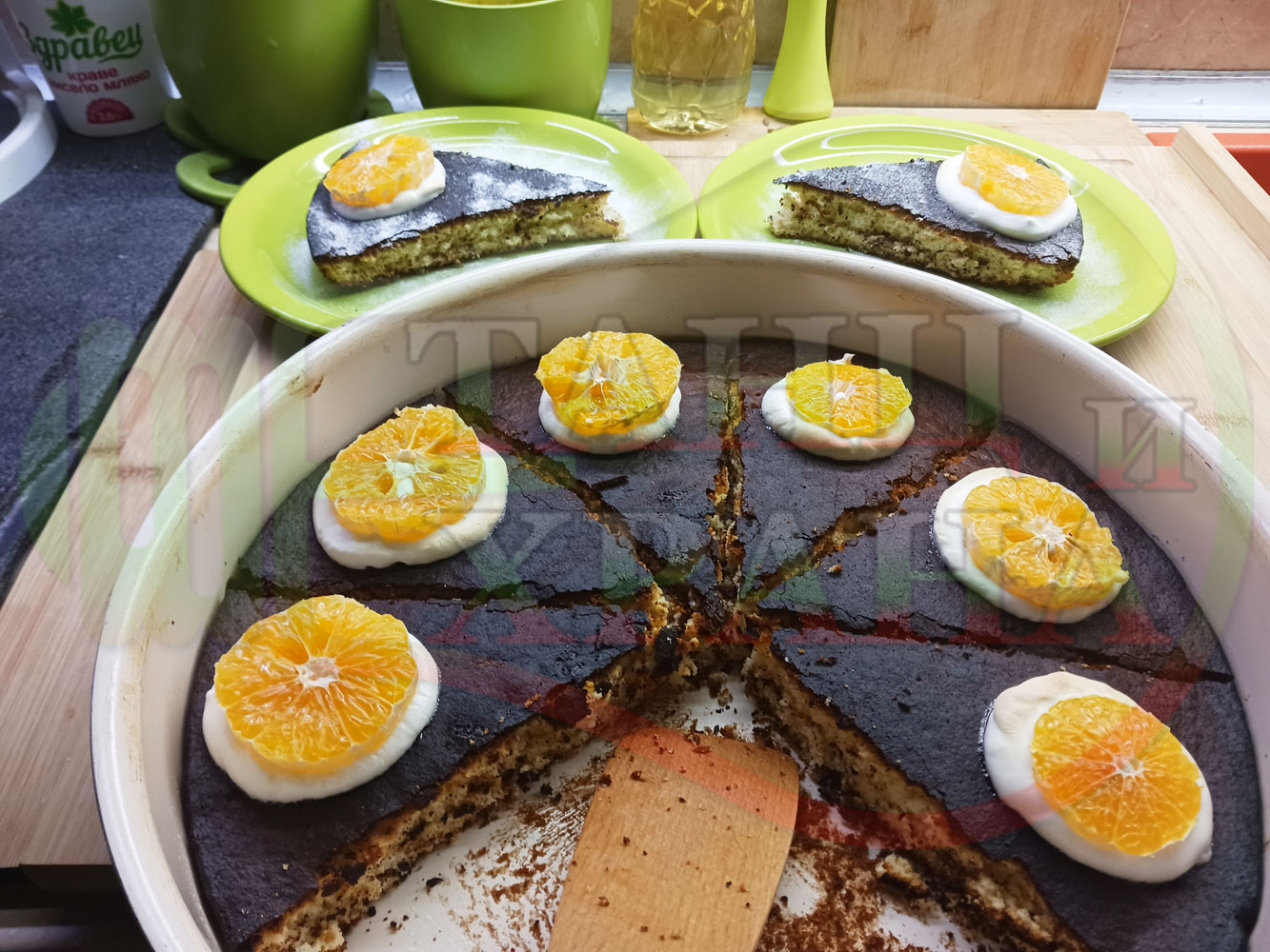 Мандаринова кексова торта "Мандариновобелтъчна" изпечена на фурна с белтъчен крем и пресни мандарини приготвена с кексово тесто с яйца, брашно с набухвател, слънчогледово олио и прясно мляко
