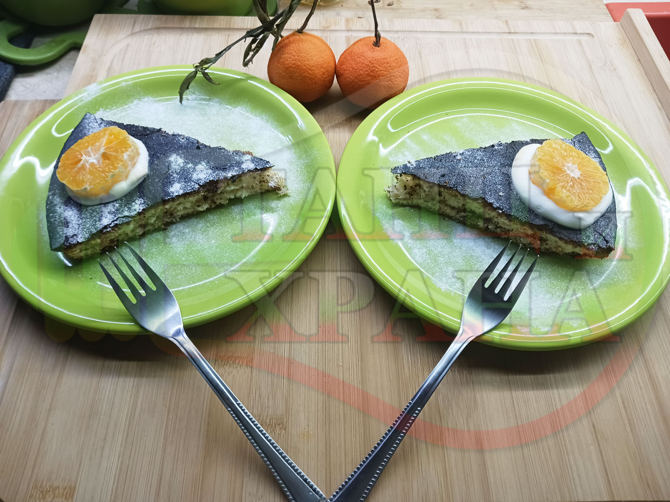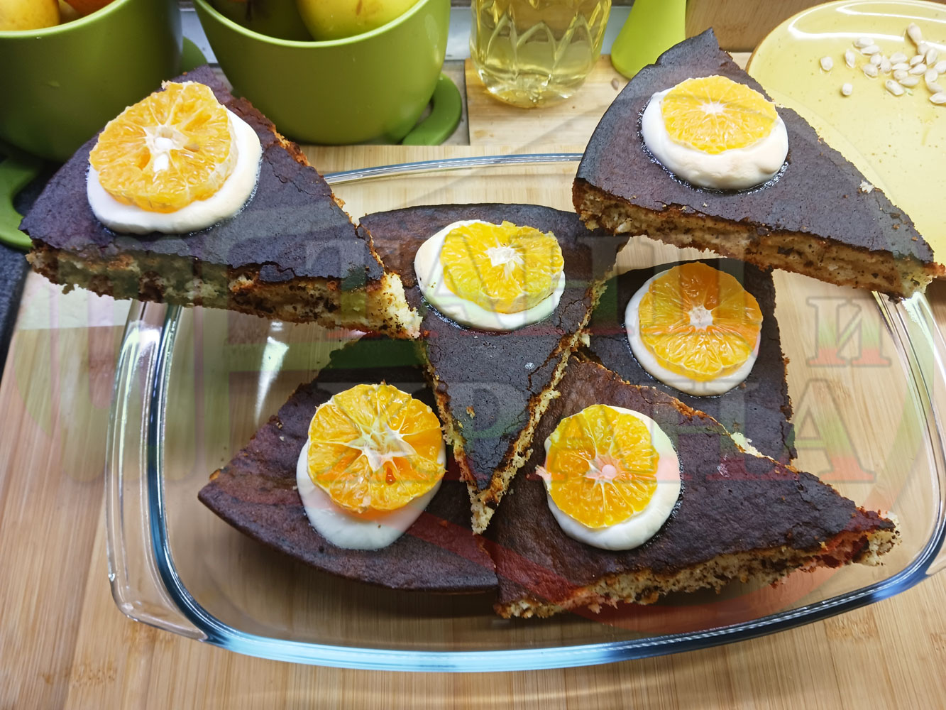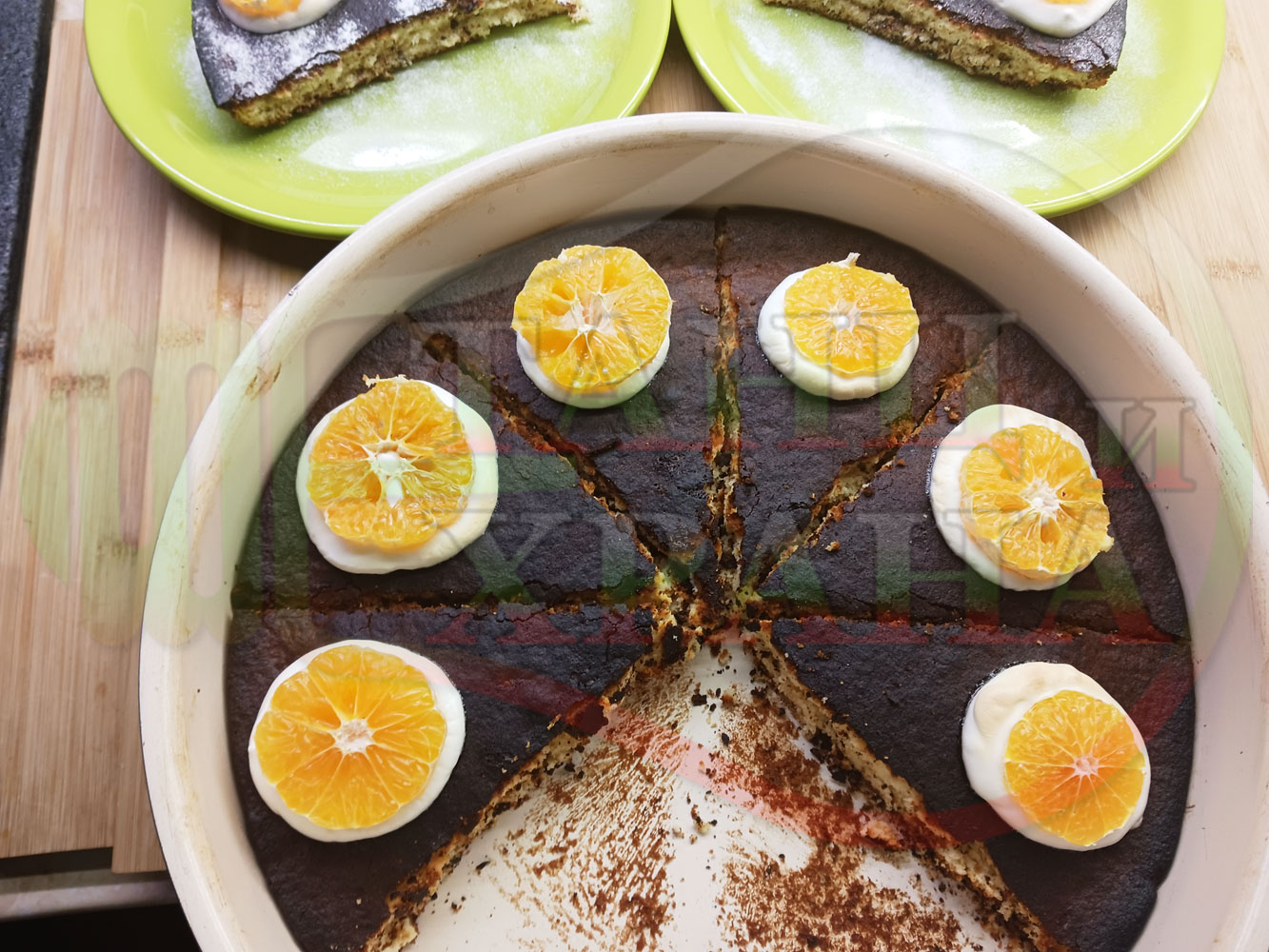 Мандаринова кексова торта "Мандариновобелтъчна" изпечена на фурна с белтъчен крем и пресни мандарини приготвена с кексово тесто с яйца, брашно с набухвател, слънчогледово олио и прясно мляко