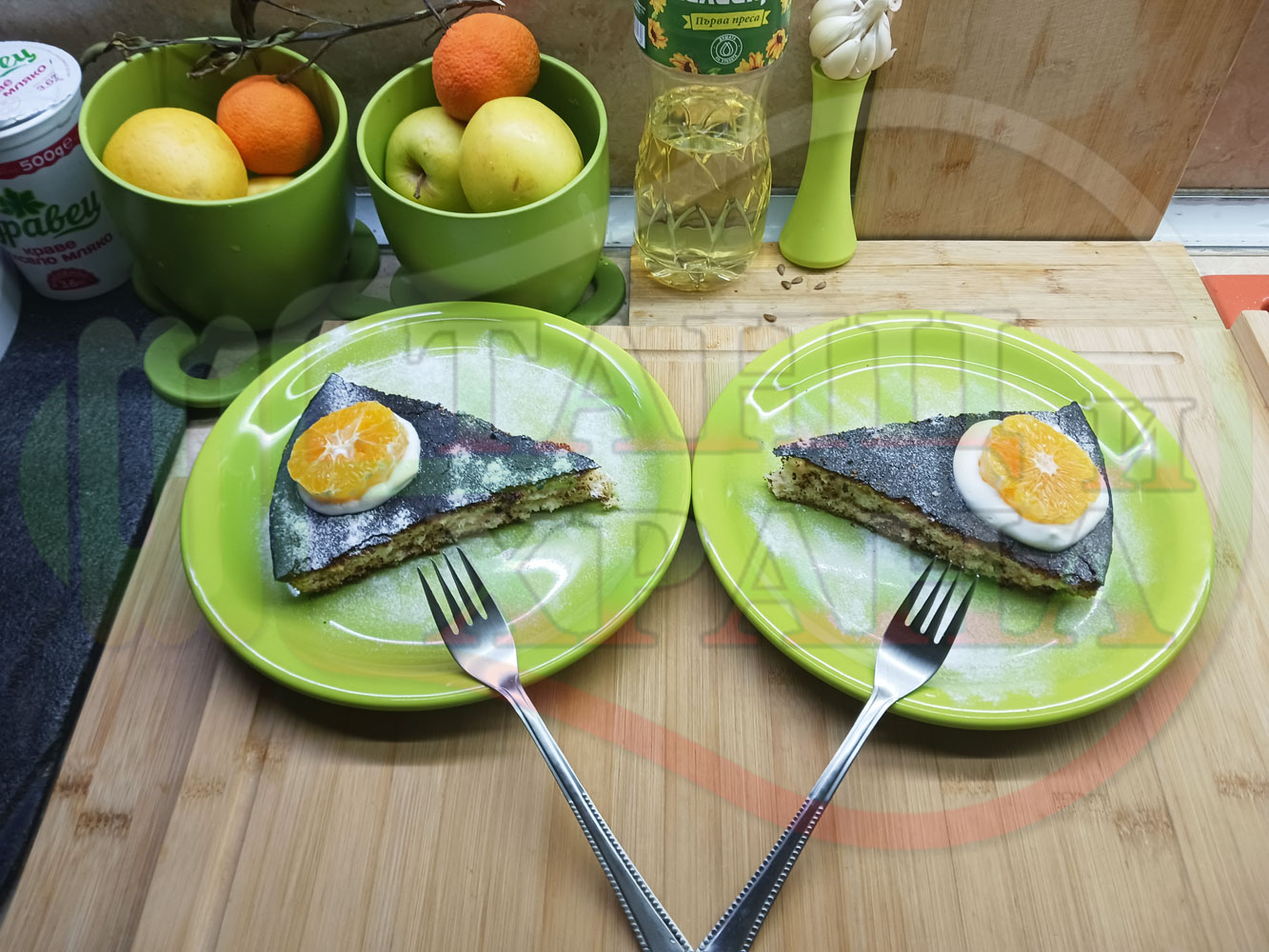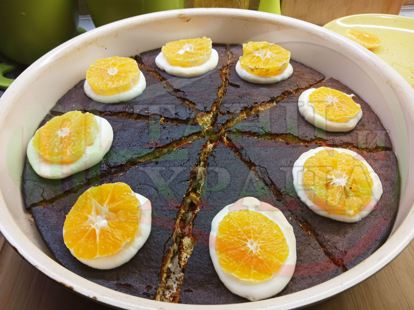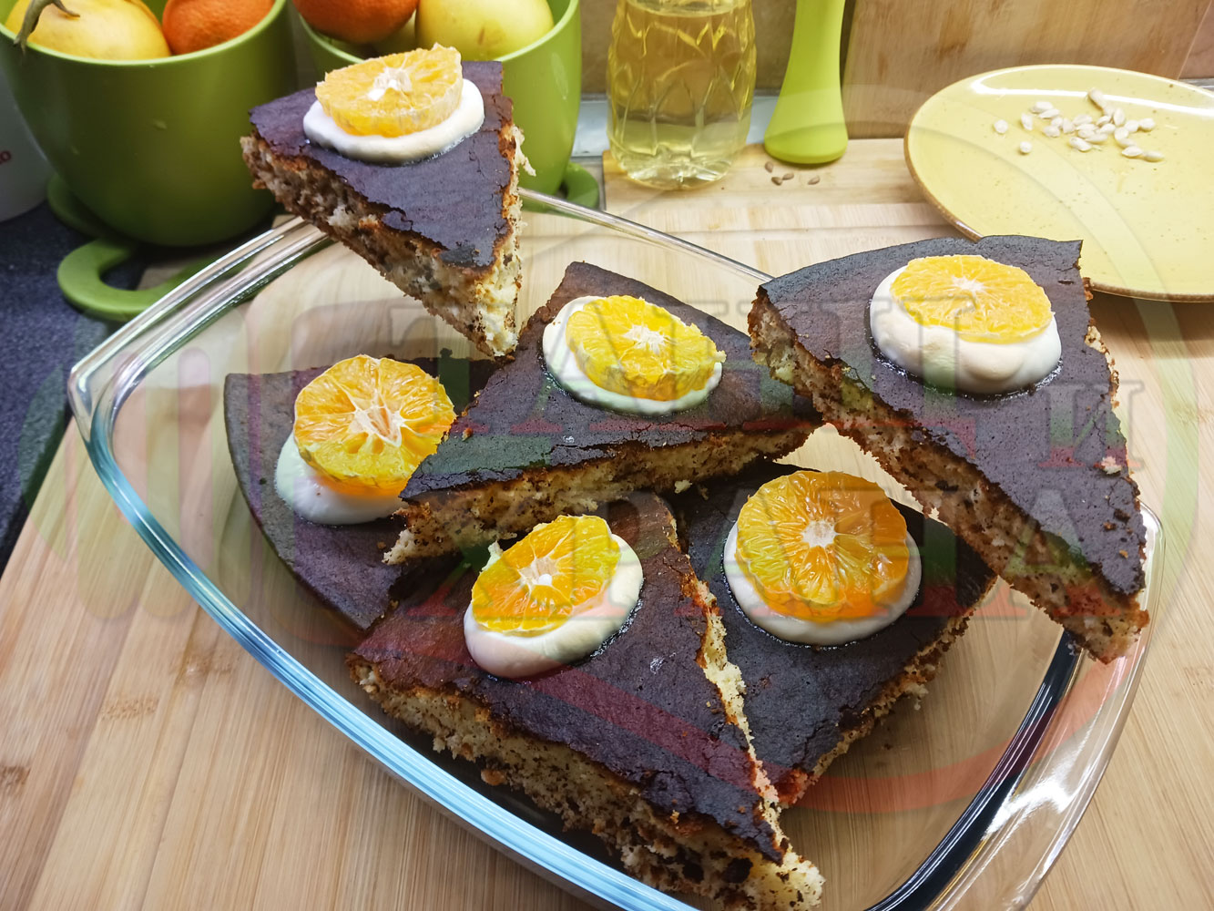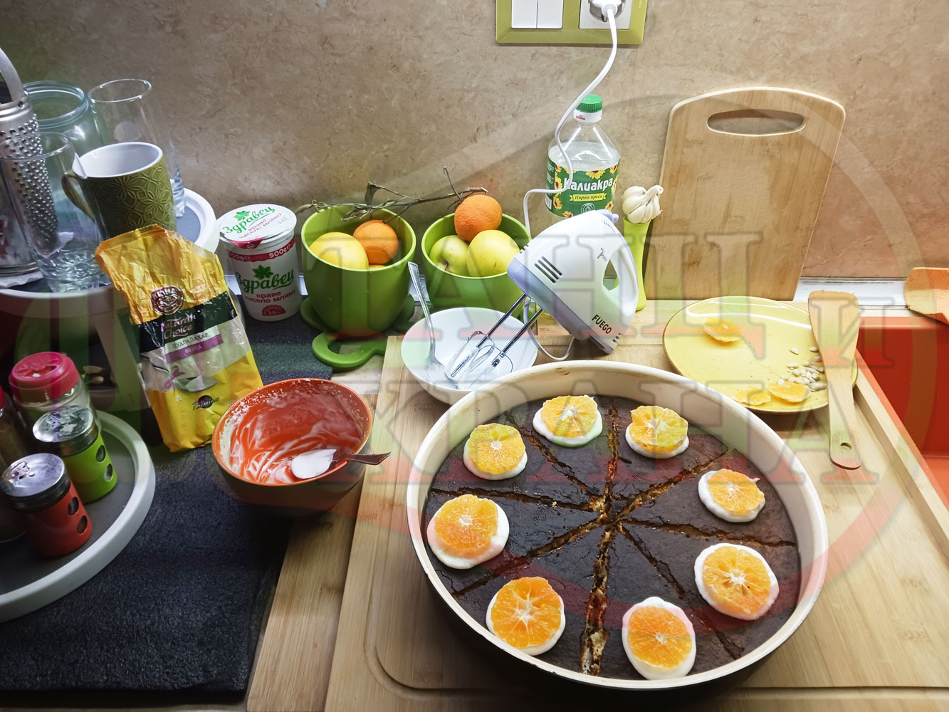 Мандаринова кексова торта "Мандариновобелтъчна" изпечена на фурна с белтъчен крем и пресни мандарини приготвена с кексово тесто с яйца, брашно с набухвател, слънчогледово олио и прясно мляко
