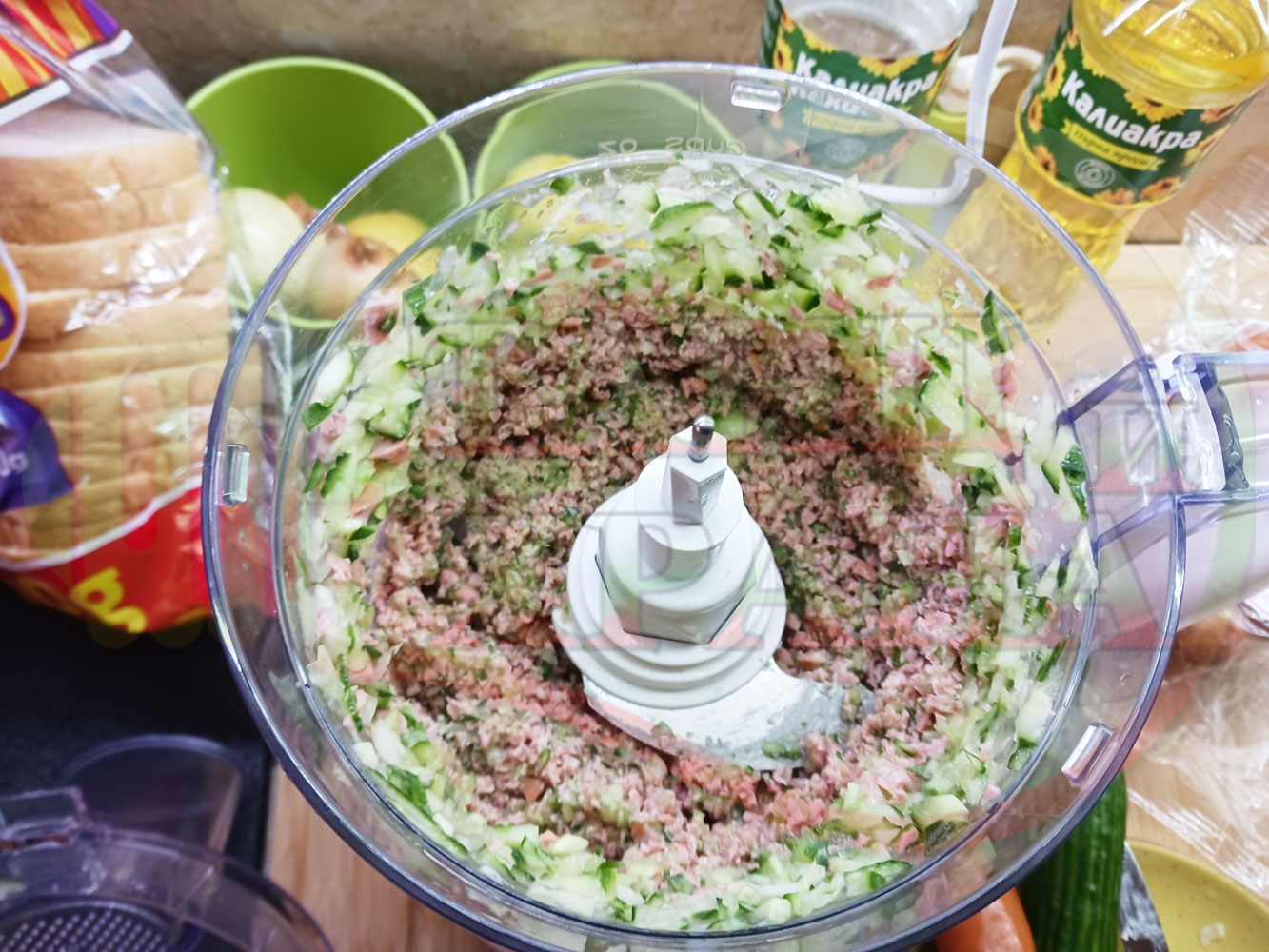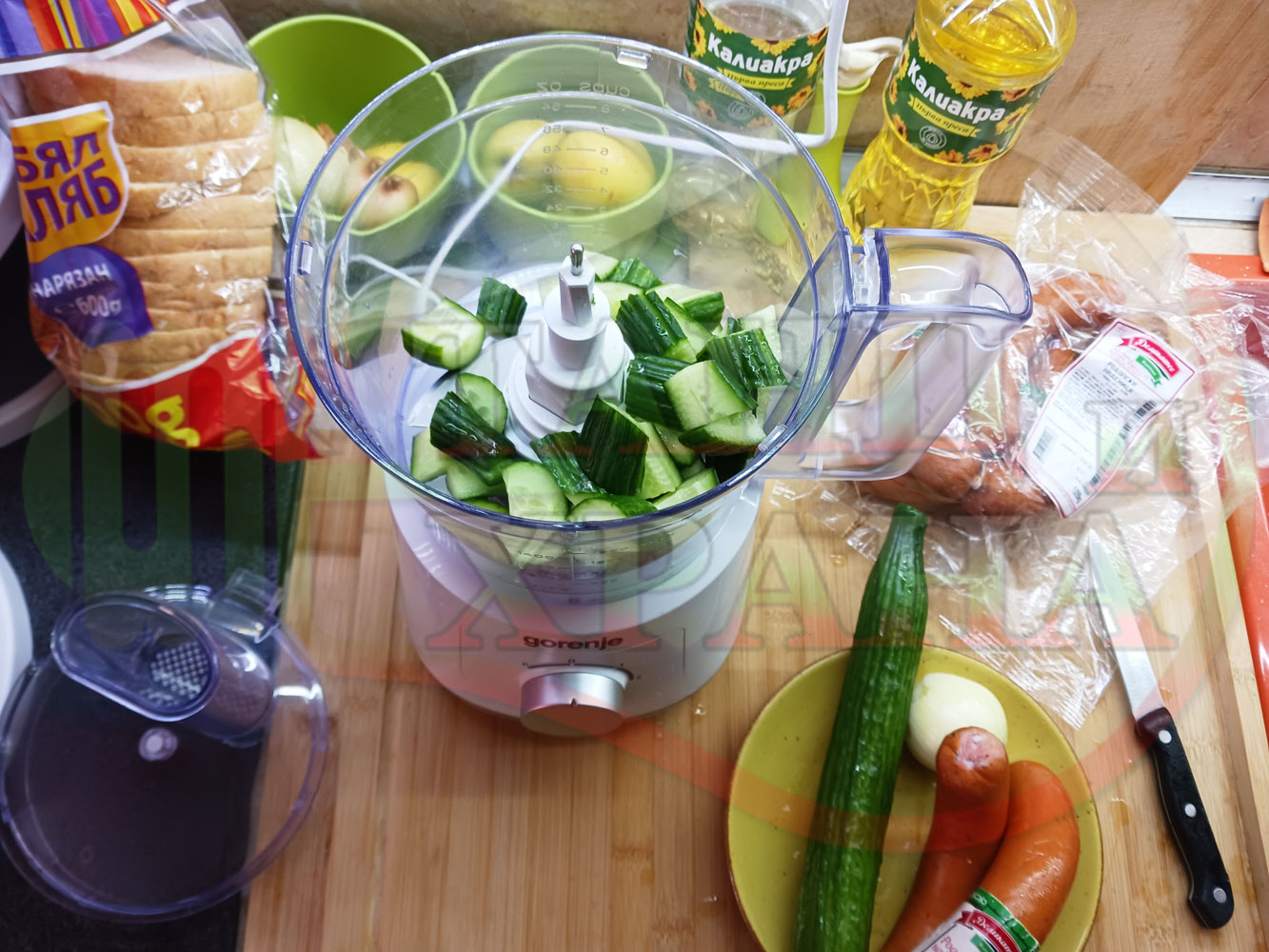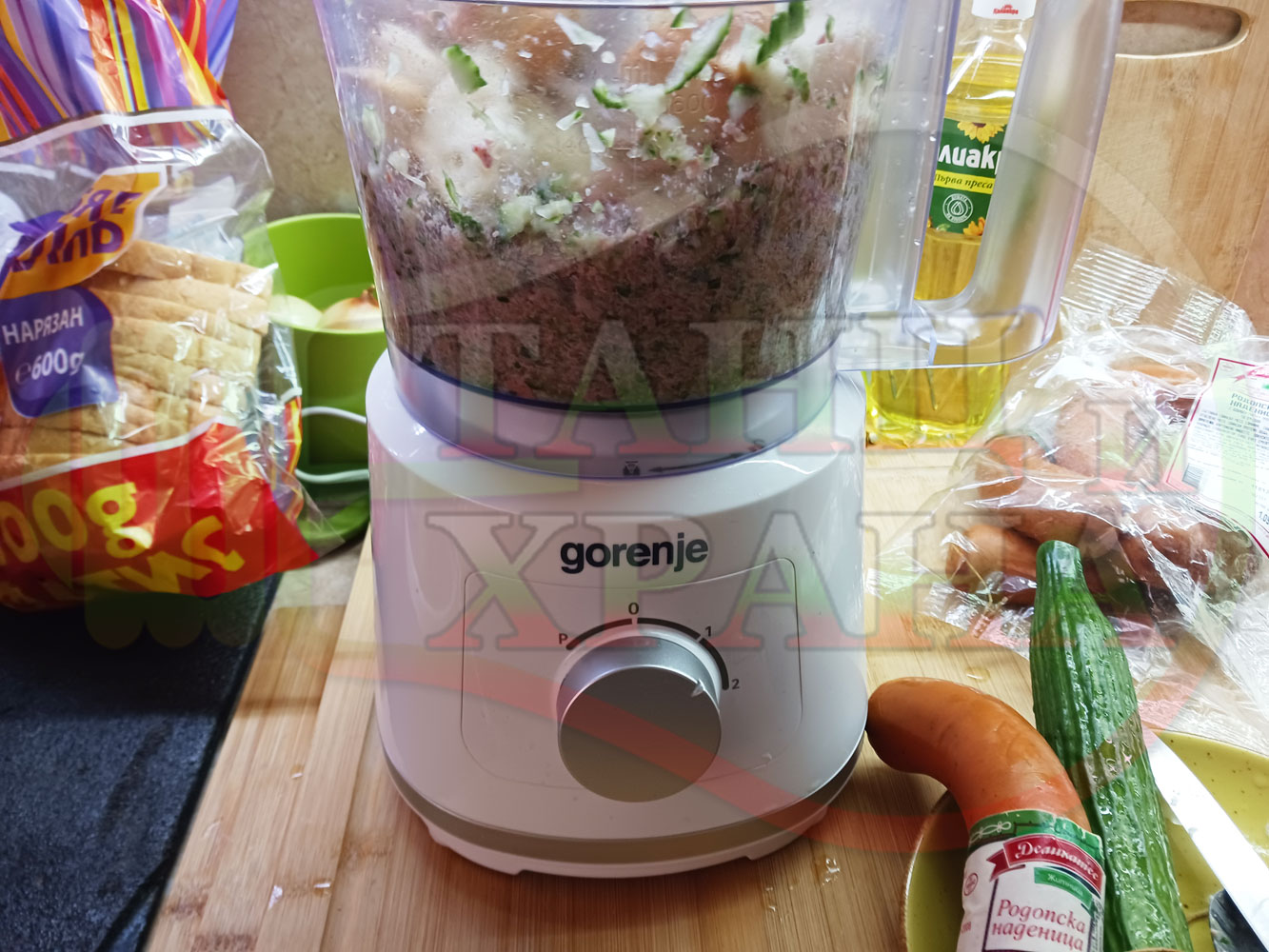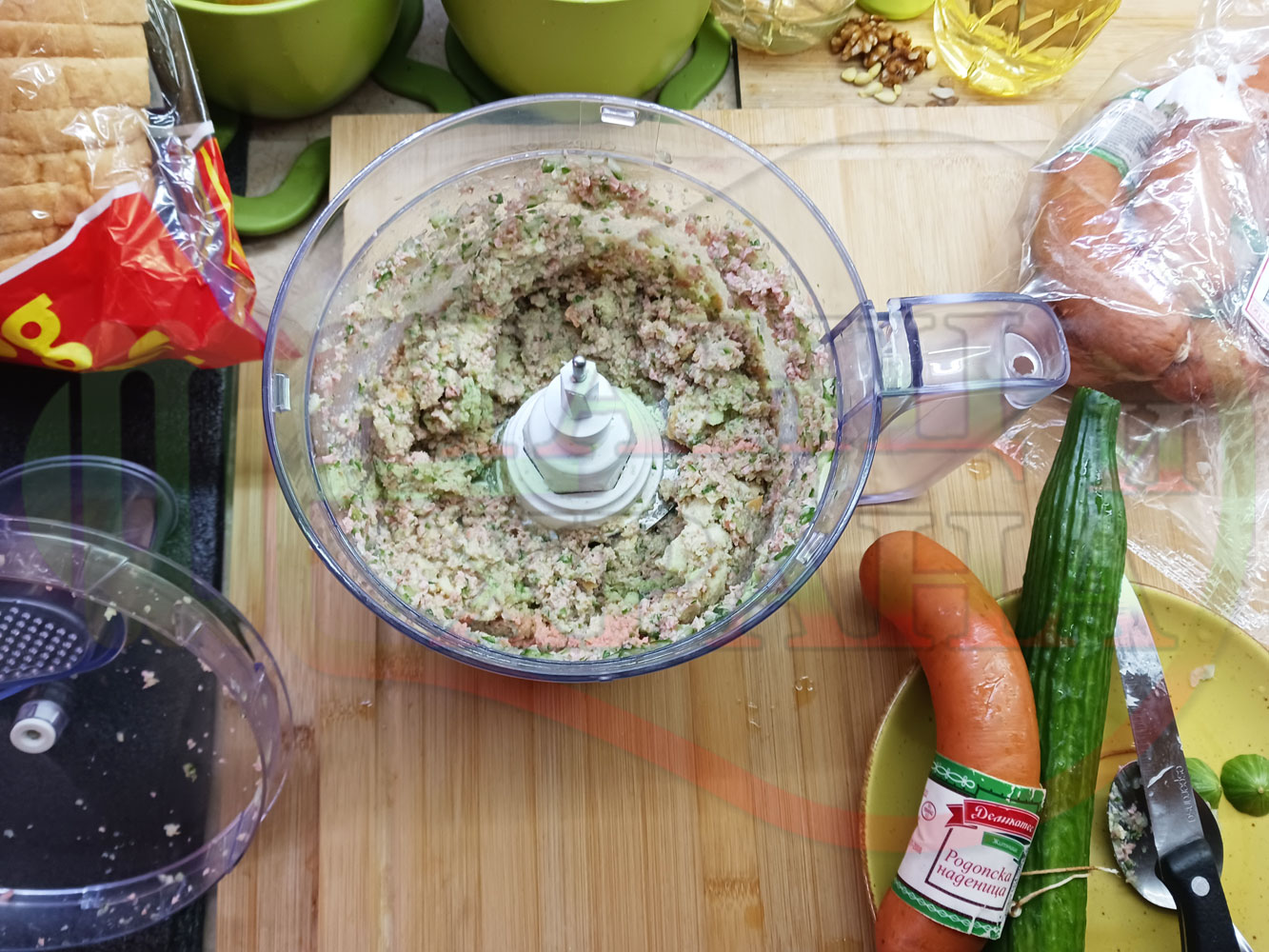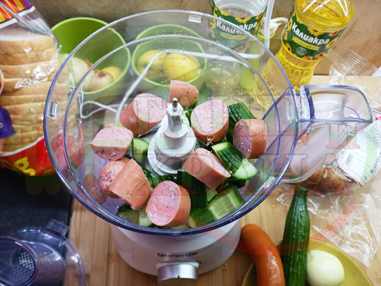 Измийте краставицата, нарежете я на едро без да я белите и я сипете в чопър заедно с измитата, обелена от ципата и нарязана на едро родопска наденица. Обелете, измийте и нарежете кромид лука на едро и го сипете в чопъра (заделете вътрешната част от кромид лука за украса). Разбийте с чопъра продуктите за да прецените степента на консистенцията между продуктите, добавете начупения на едро хляб и отново разбийте с чопъра до образуване на средно гъсто, хомогенизирано тесто с хляб (блат с хляб (преценете количеството на хляба според консистенцията, която зависи от големината и водното съдържание на краставицата, вида на наденицата и големината и вида на филиите хляб)).