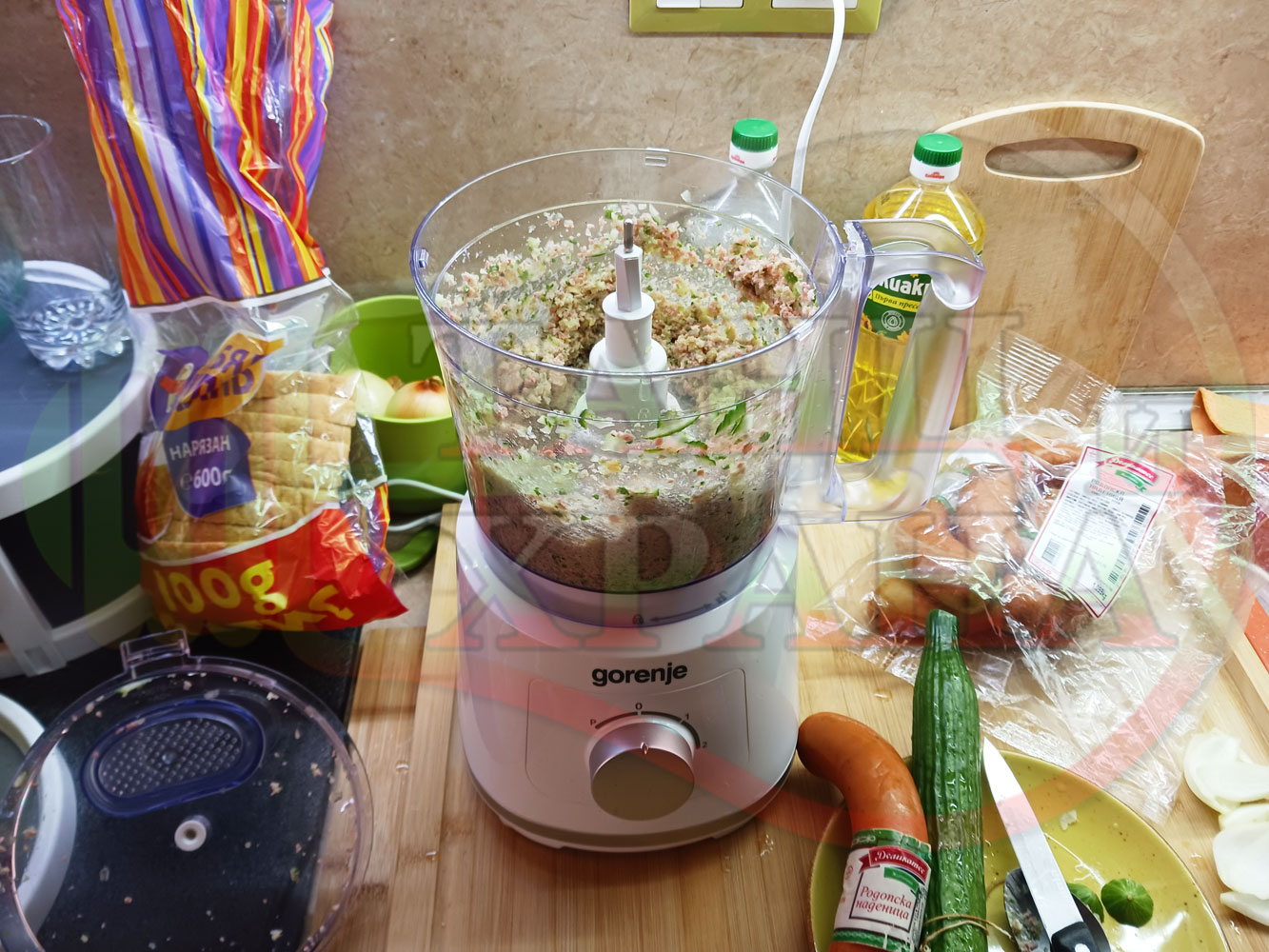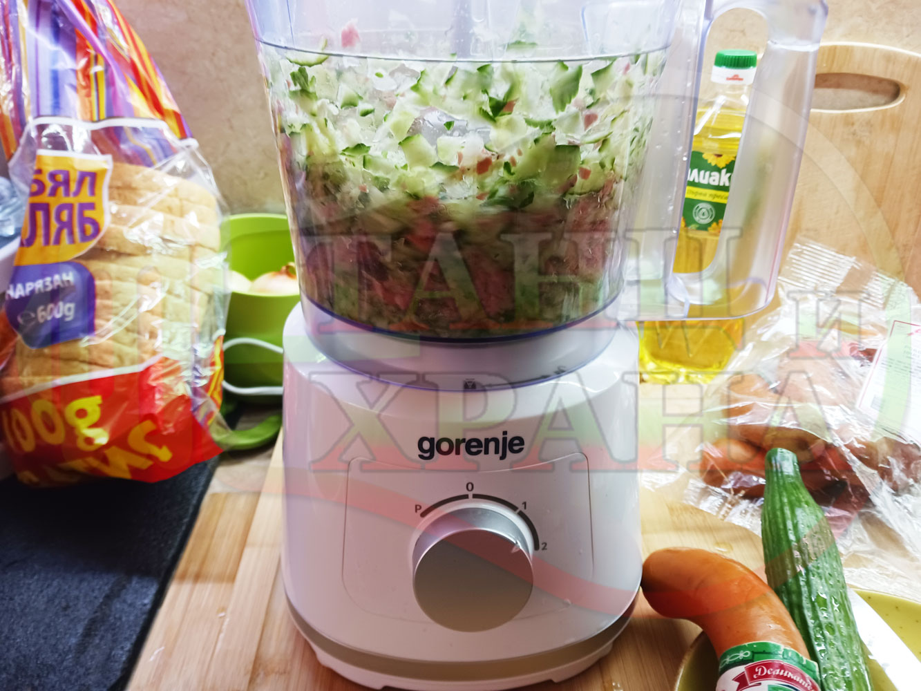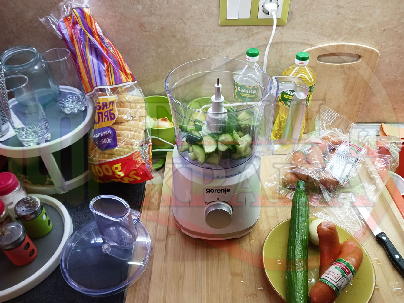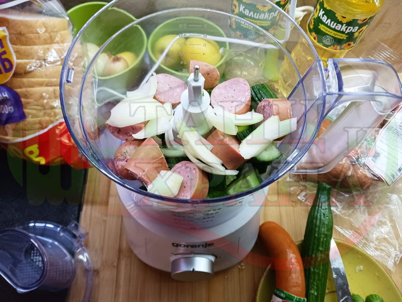 Измийте краставицата, нарежете я на едро без да я белите и я сипете в чопър заедно с измитата, обелена от ципата и нарязана на едро родопска наденица. Обелете, измийте и нарежете кромид лука на едро и го сипете в чопъра (заделете вътрешната част от кромид лука за украса). Разбийте с чопъра продуктите за да прецените степента на консистенцията между продуктите, добавете начупения на едро хляб и отново разбийте с чопъра до образуване на средно гъсто, хомогенизирано тесто с хляб (блат с хляб (преценете количеството на хляба според консистенцията, която зависи от големината и водното съдържание на краставицата, вида на наденицата и големината и вида на филиите хляб)).