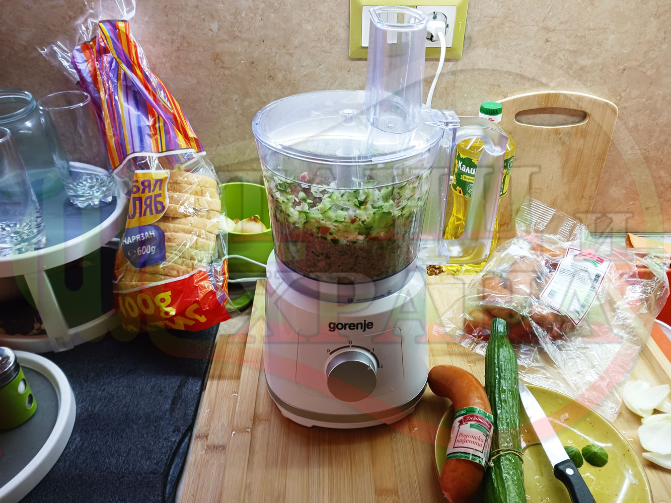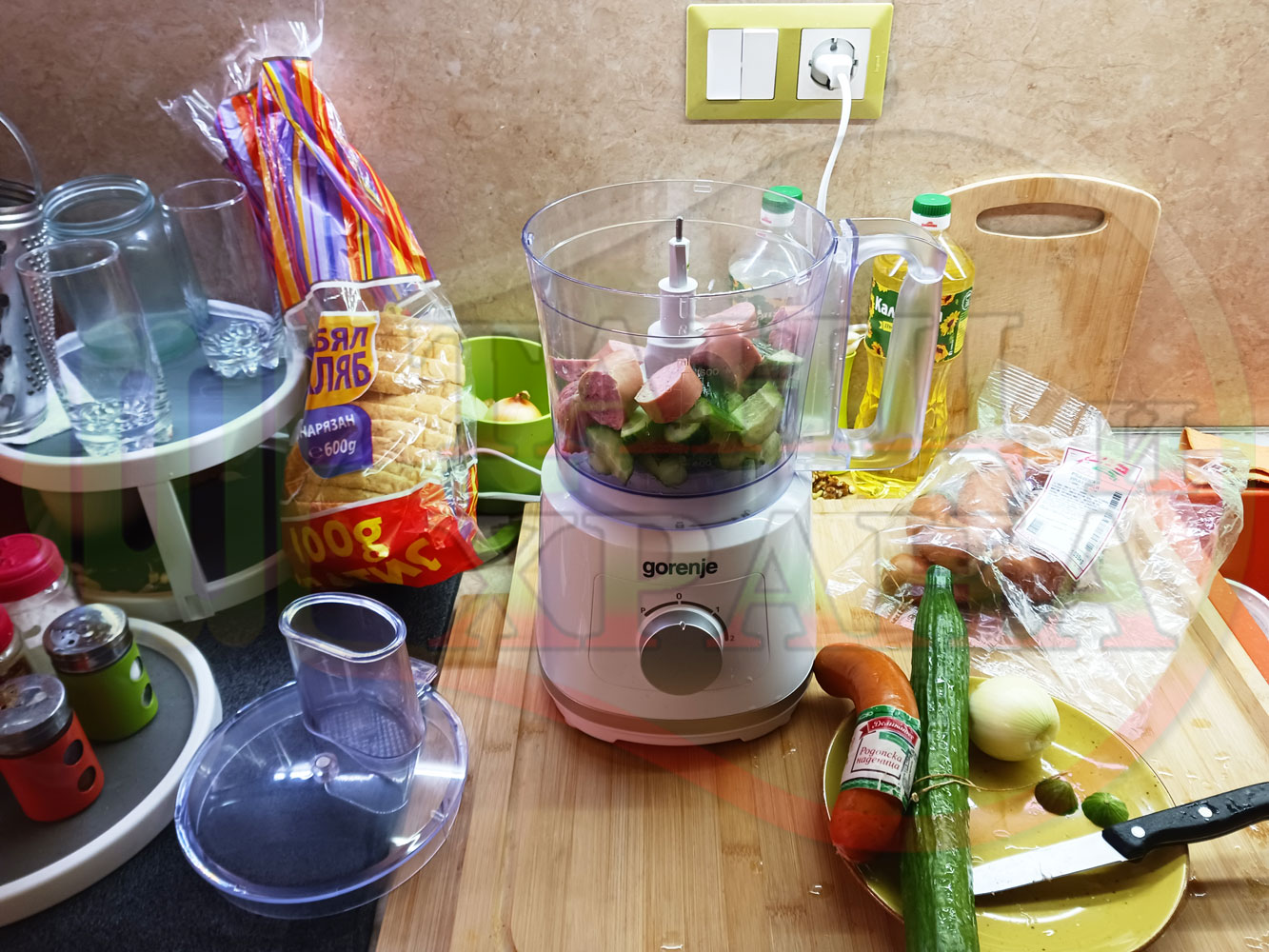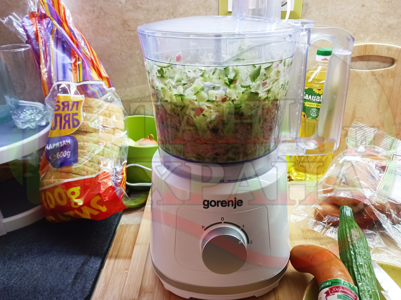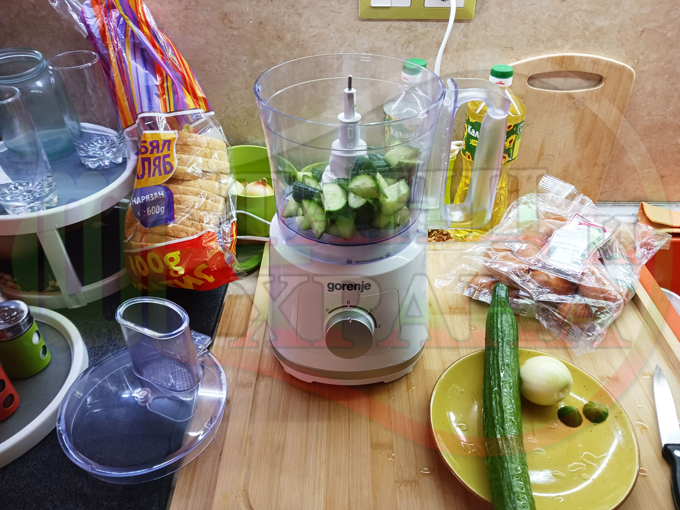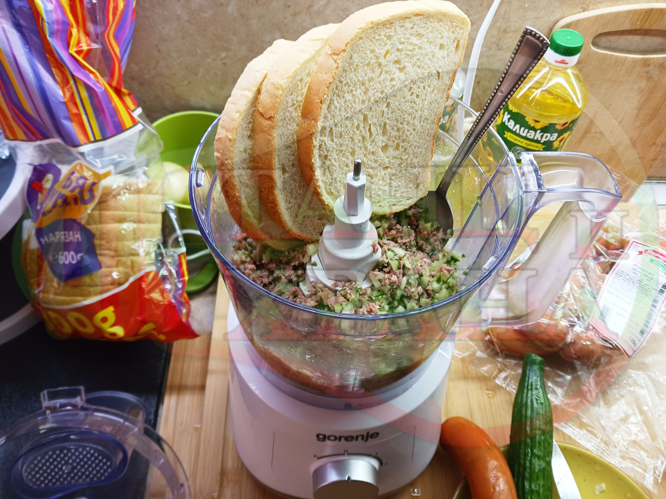Измийте краставицата, нарежете я на едро без да я белите и я сипете в чопър заедно с измитата, обелена от ципата и нарязана на едро родопска наденица. Обелете, измийте и нарежете кромид лука на едро и го сипете в чопъра (заделете вътрешната част от кромид лука за украса). Разбийте с чопъра продуктите за да прецените степента на консистенцията между продуктите, добавете начупения на едро хляб и отново разбийте с чопъра до образуване на средно гъсто, хомогенизирано тесто с хляб (блат с хляб (преценете количеството на хляба според консистенцията, която зависи от големината и водното съдържание на краставицата, вида на наденицата и големината и вида на филиите хляб)).