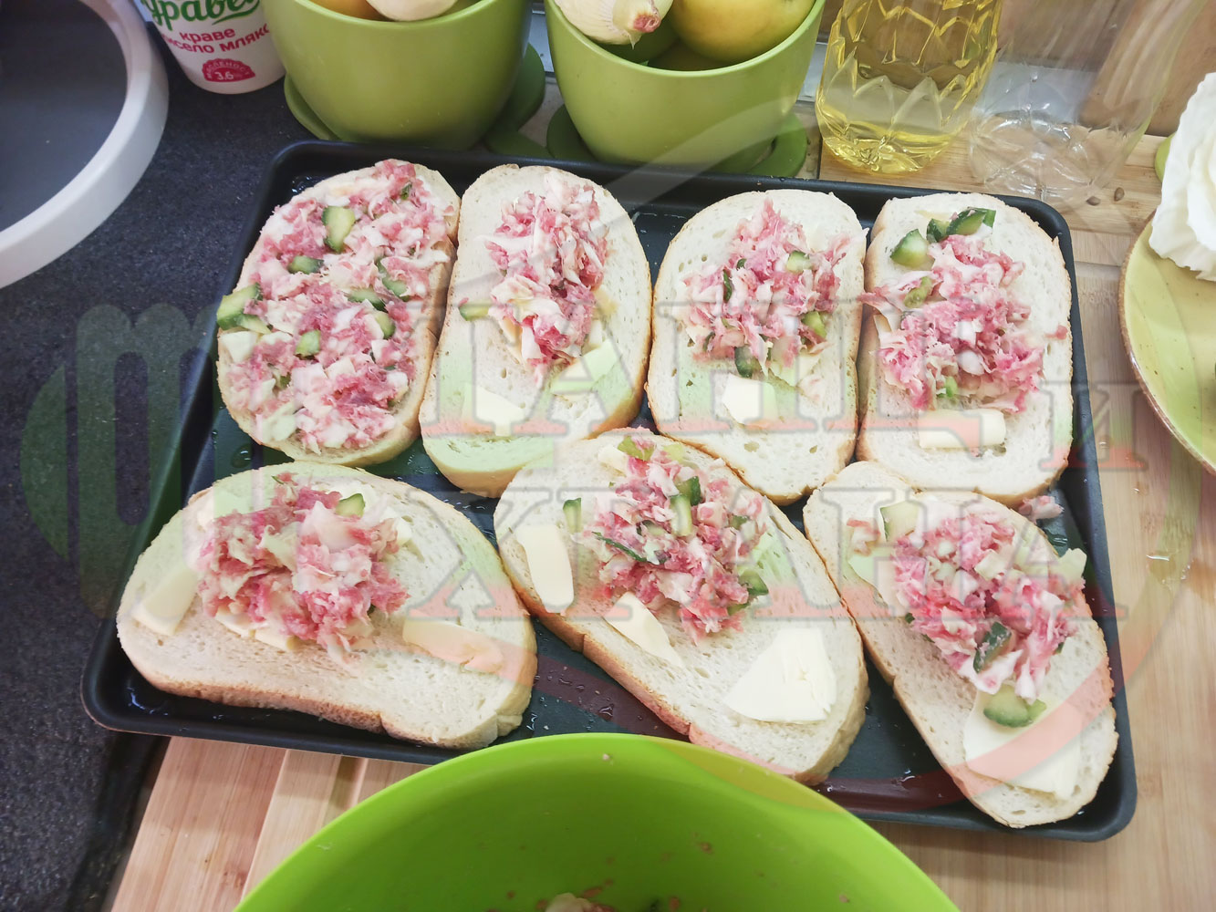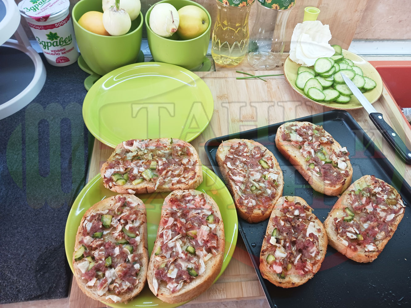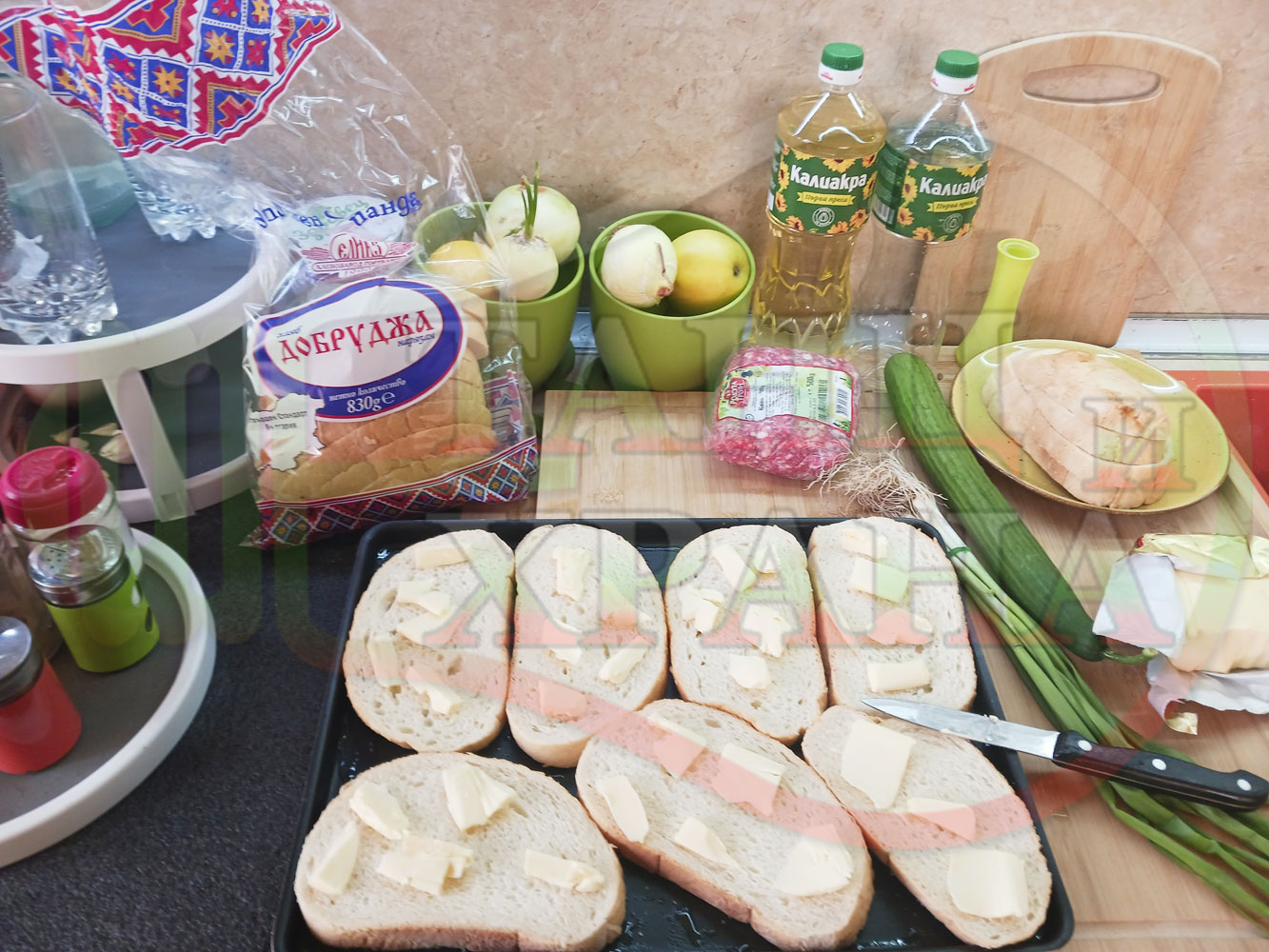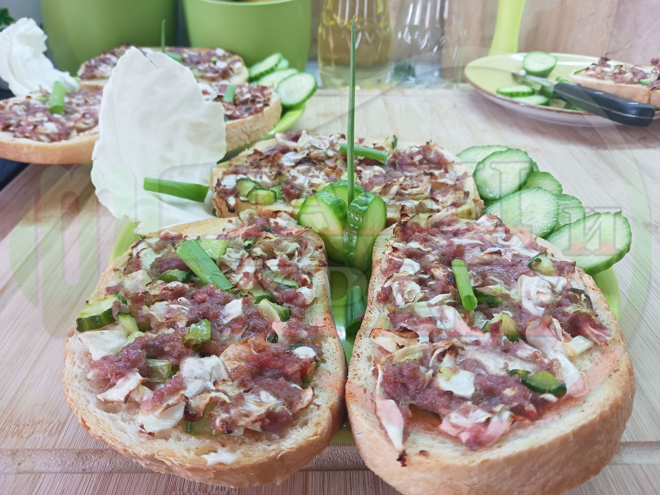 Български филийки "Каймяни зелевокраставични" приготвени с домашно овкусена кайма с краставици, прясно зеле, зелен лук и черен пипер намазани и запечени на фурна с краве масло