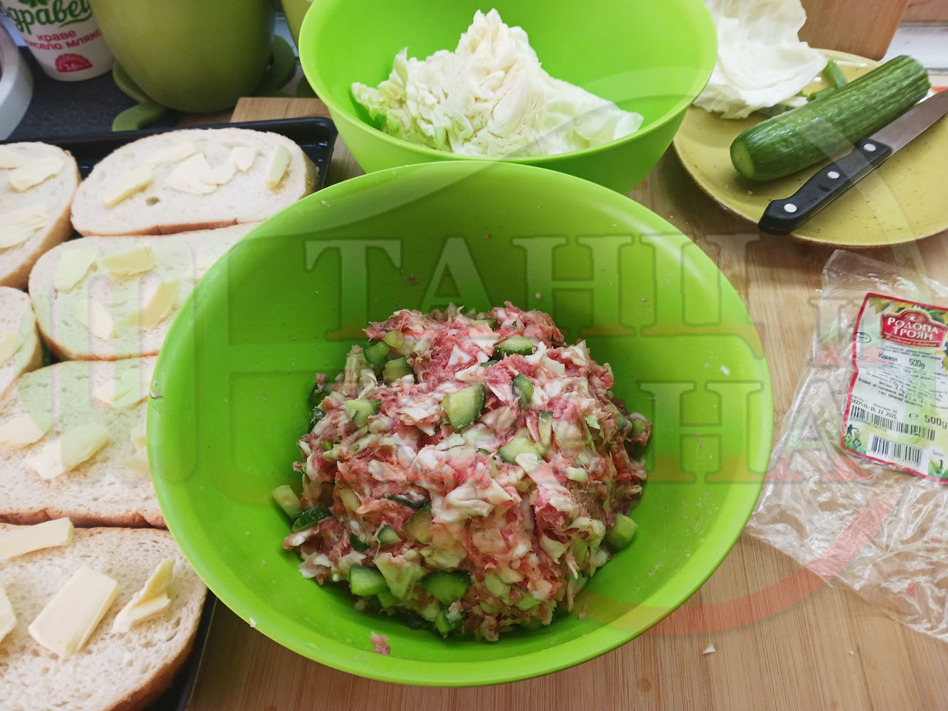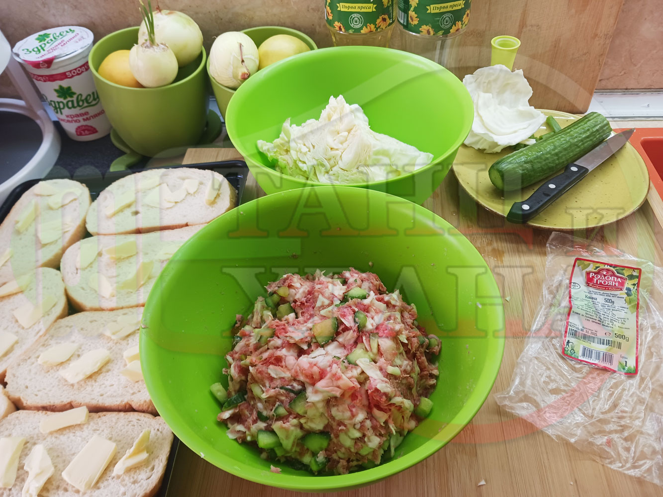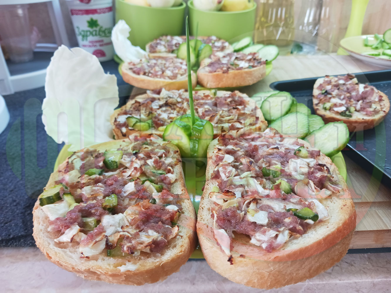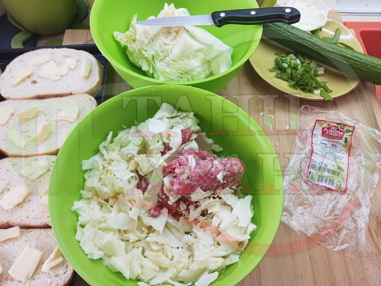 Български филийки "Каймяни зелевокраставични" приготвени с домашно овкусена кайма с краставици, прясно зеле, зелен лук и черен пипер намазани и запечени на фурна с краве масло