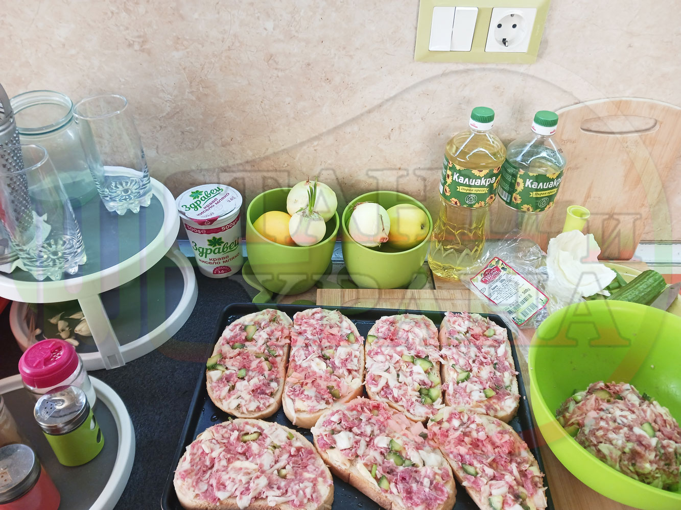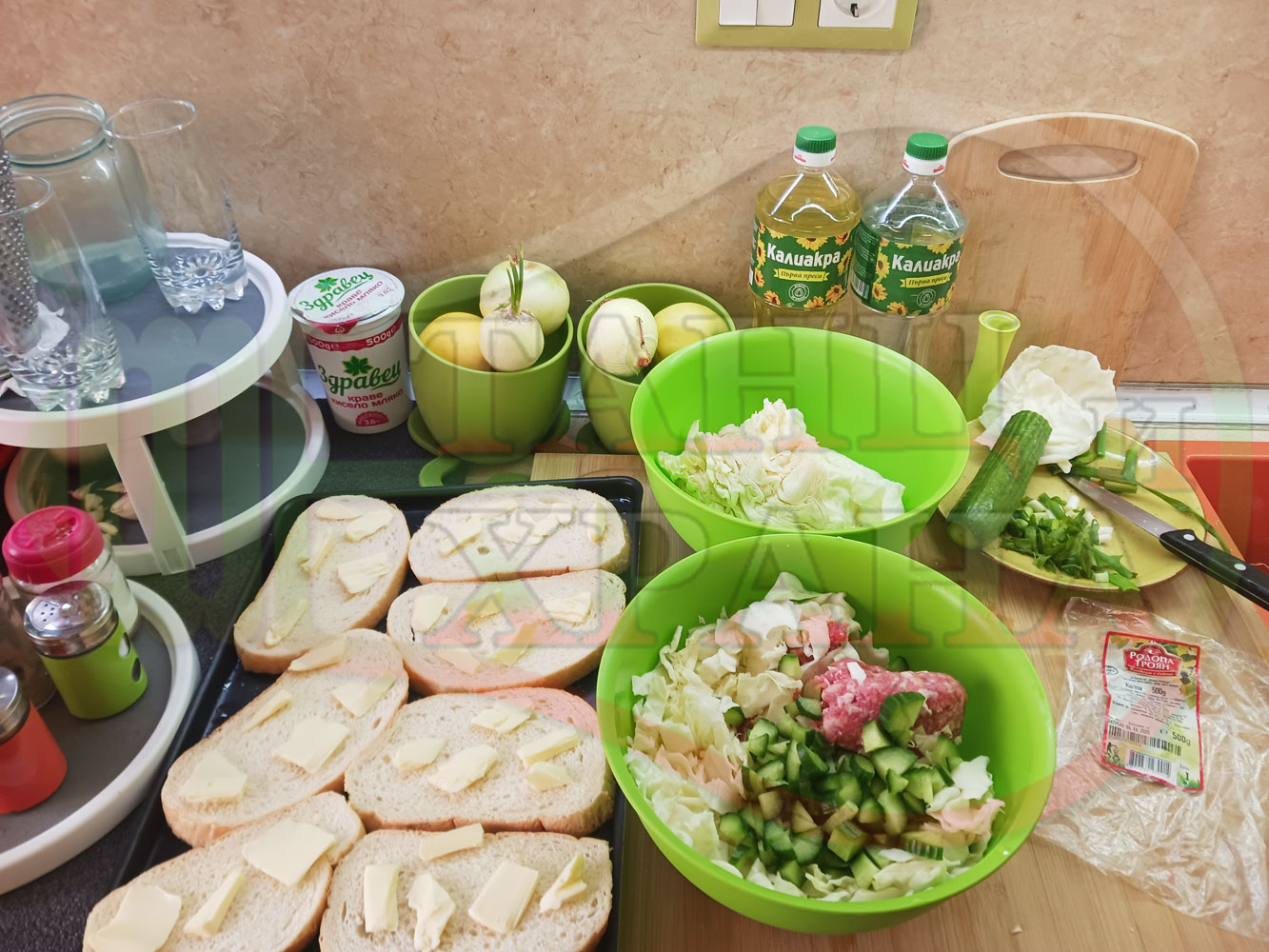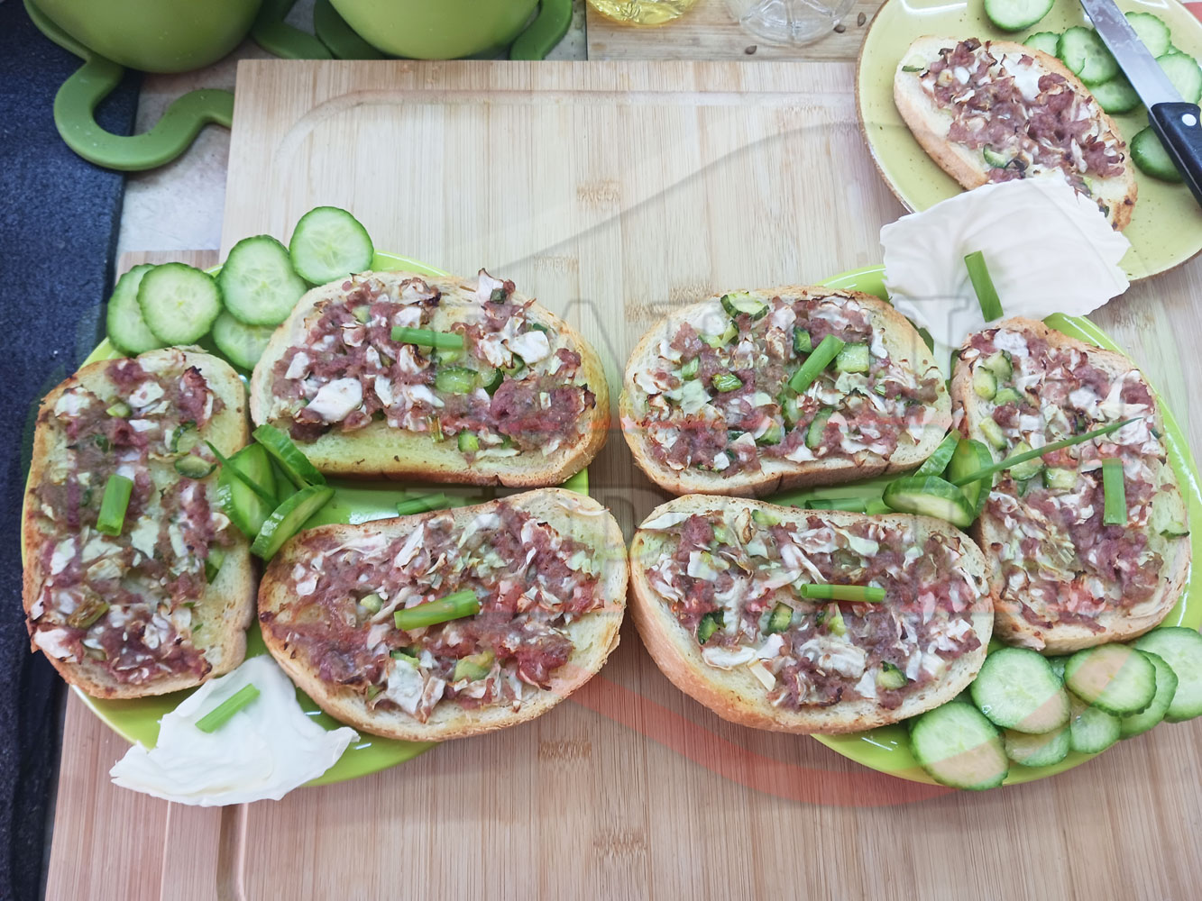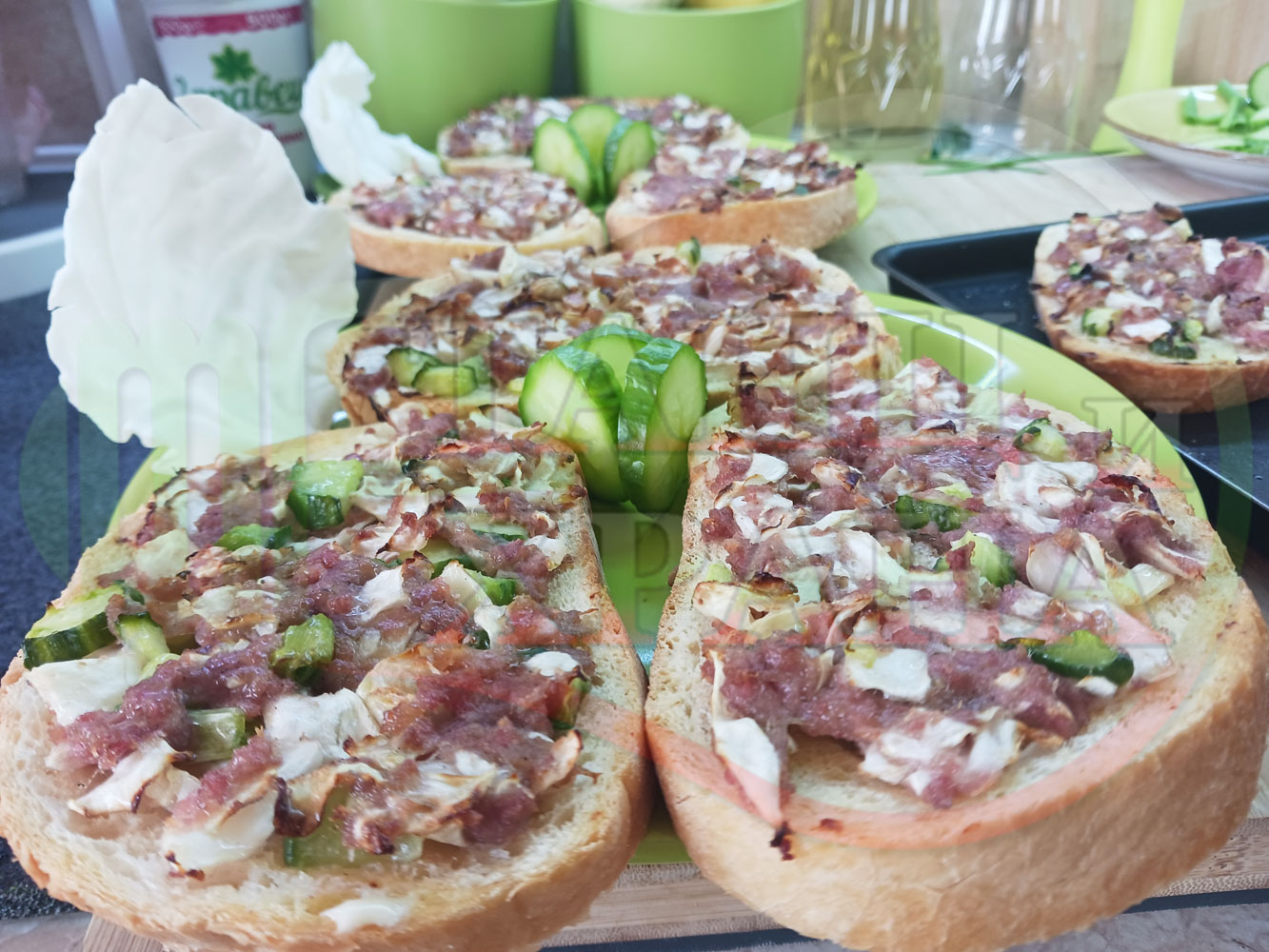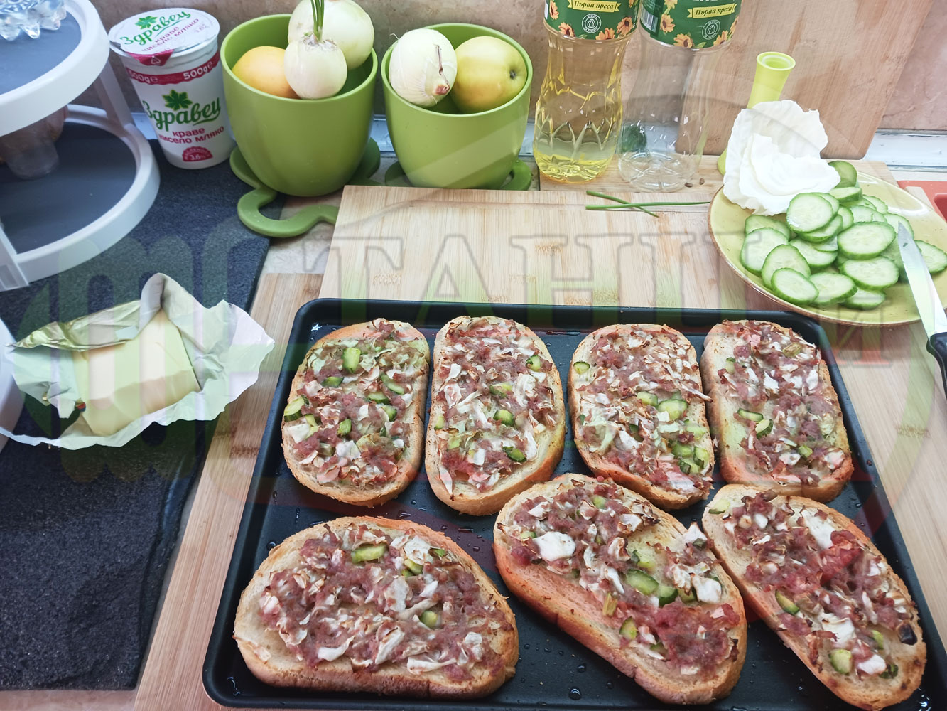 Български филийки "Каймяни зелевокраставични" приготвени с домашно овкусена кайма с краставици, прясно зеле, зелен лук и черен пипер намазани и запечени на фурна с краве масло