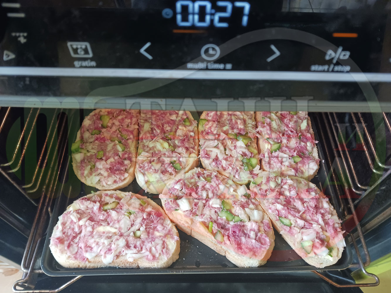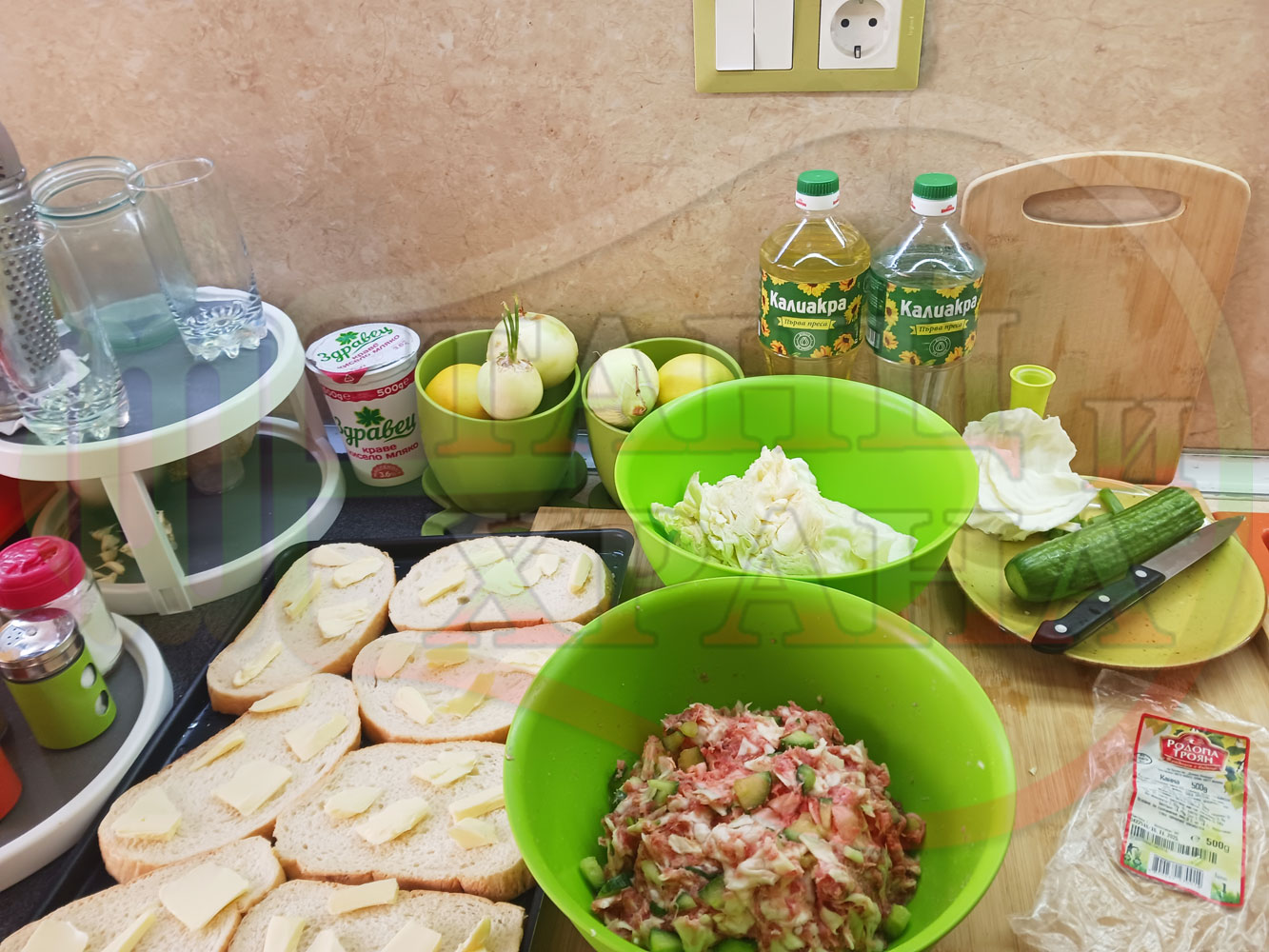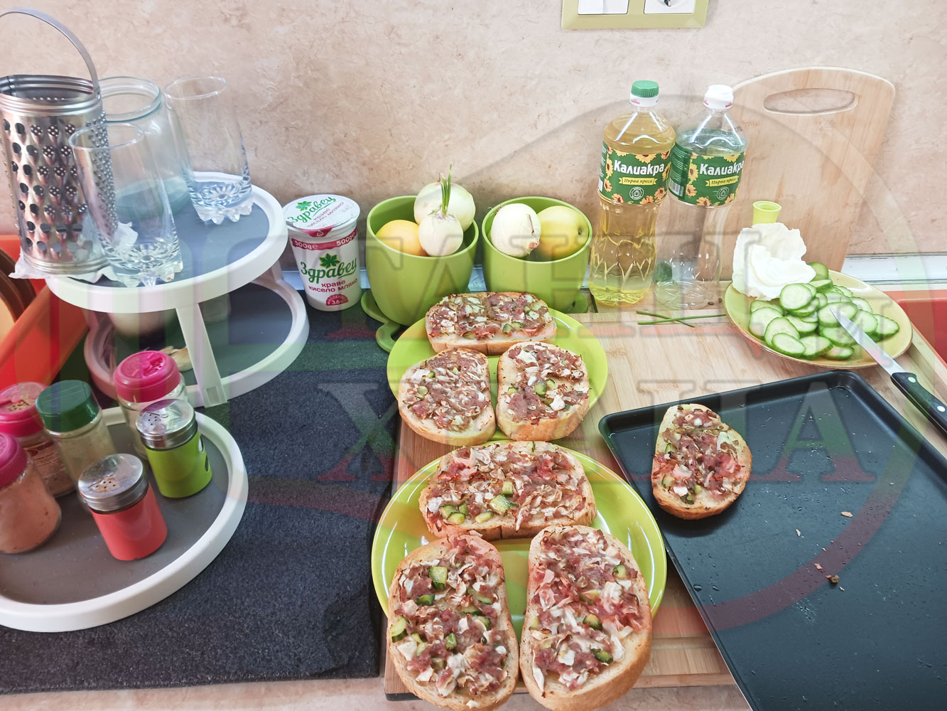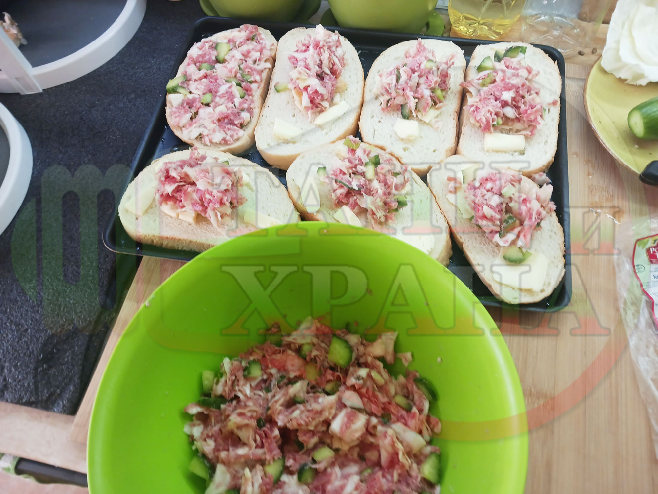 Български филийки "Каймяни зелевокраставични" приготвени с домашно овкусена кайма с краставици, прясно зеле, зелен лук и черен пипер намазани и запечени на фурна с краве масло