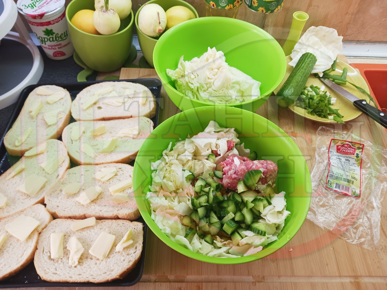 ПРОДУКТИ: Приблизителни количества за български филийки "Каймяни зелевокраставични" приготвени с домашно овкусена кайма с краставици, прясно зеле, зелен лук и черен пипер намазани и запечени на фурна с краве масло