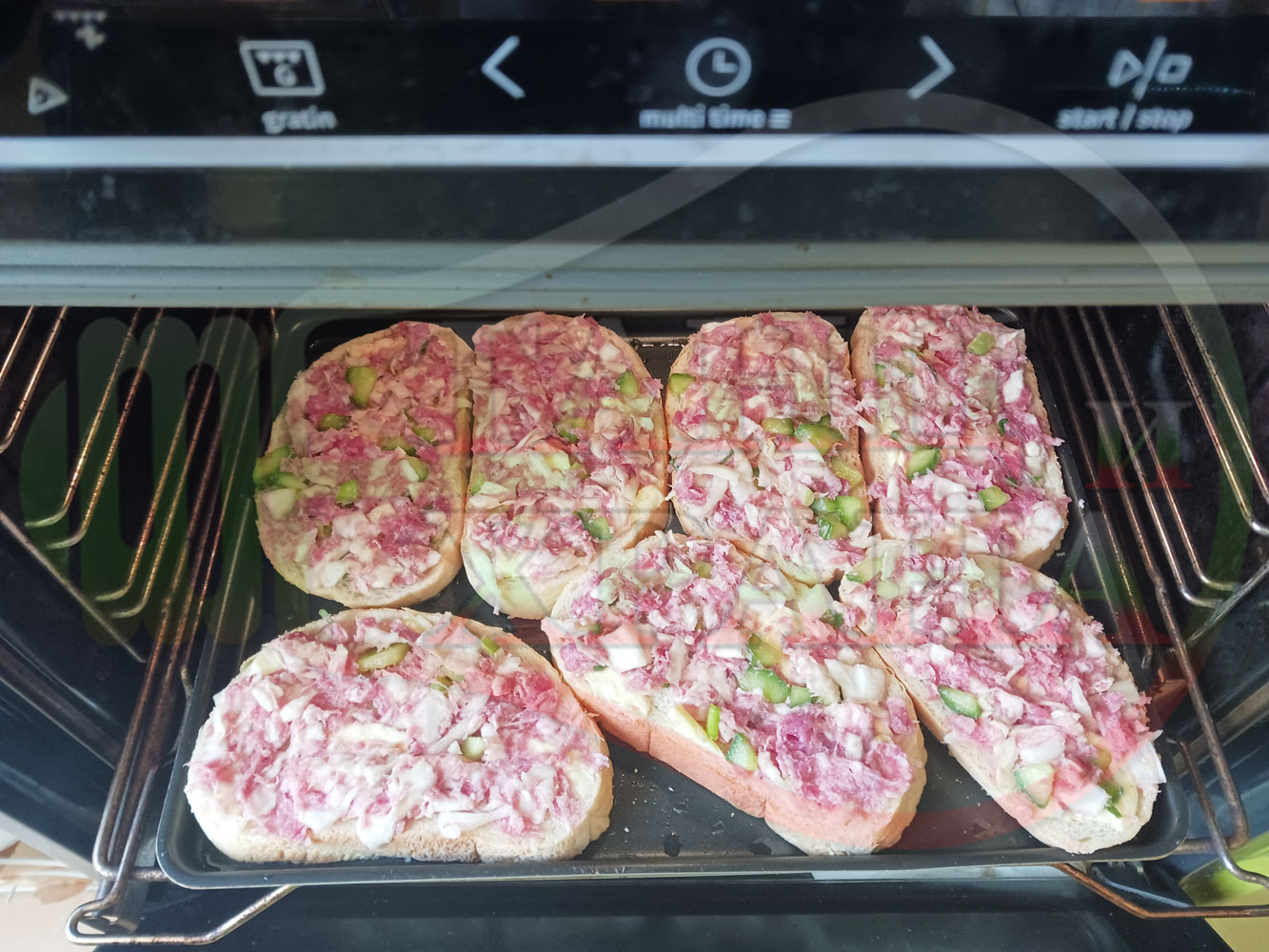 Подредете филийките в намазана със слънчогледово олио тънка тава за печене и ги намажете с масло (може да не размазвате маслото напълно). Разпределете равномерно количество от домашно овкусената кайма върху намазаните с масло филийки и я разстелете, така че да обхване коричките на филиите.