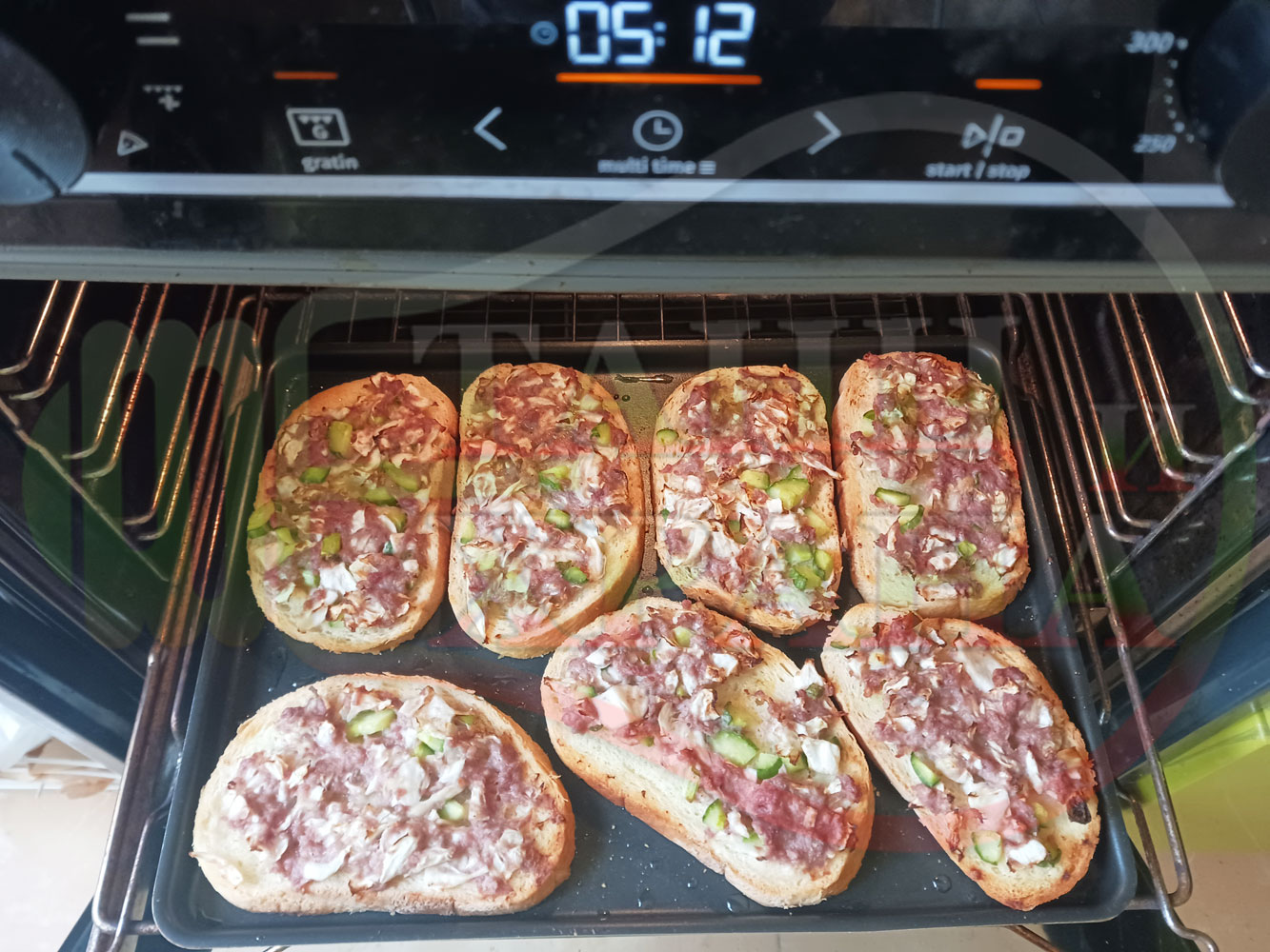 Поставете тавата с подредените и намазани филийки в предварително загрятата фурна (загрейте я за поне 5 минути). Запечете на фурна без вентилатор на 180 градуса за около 25 минути.