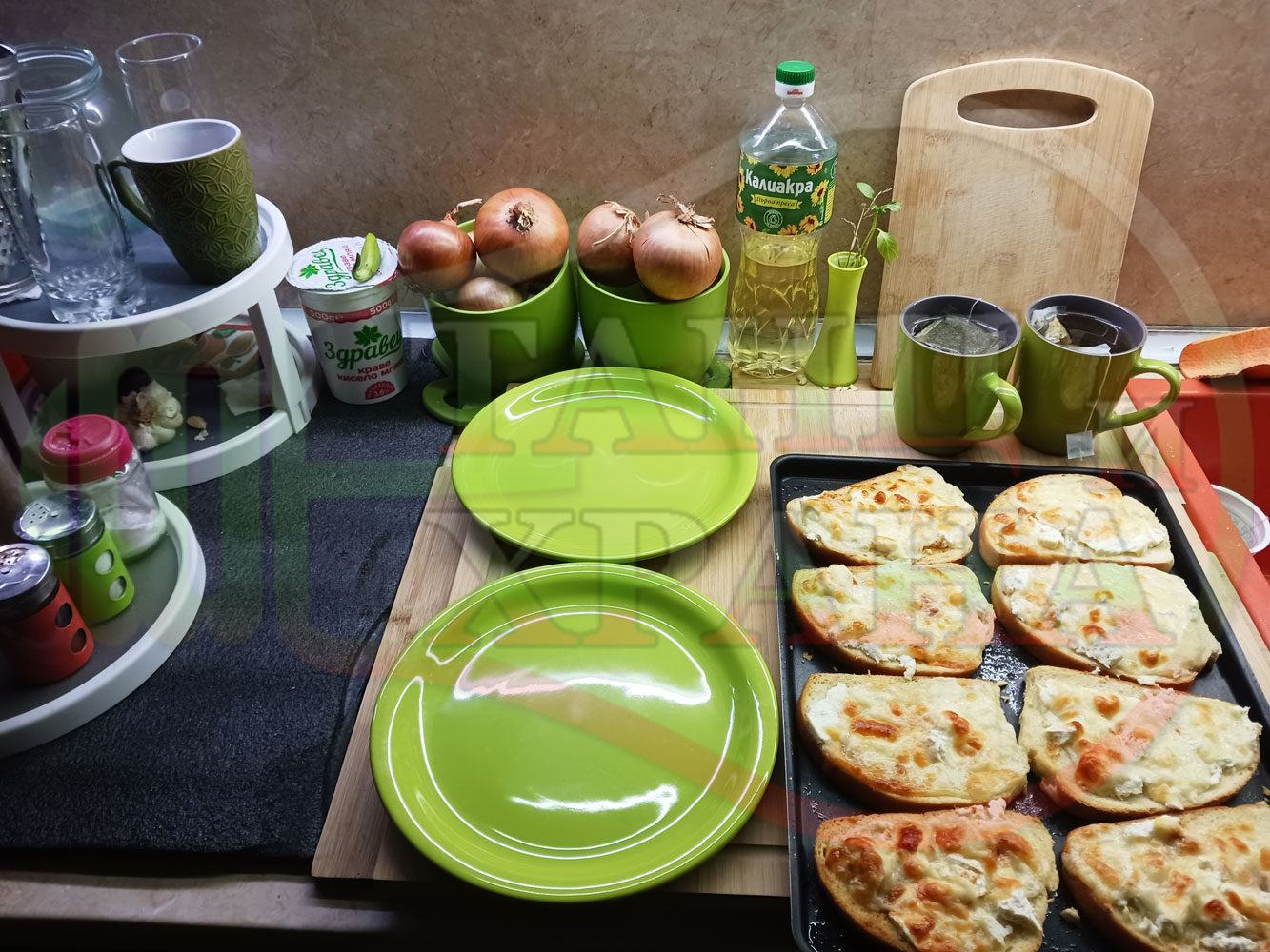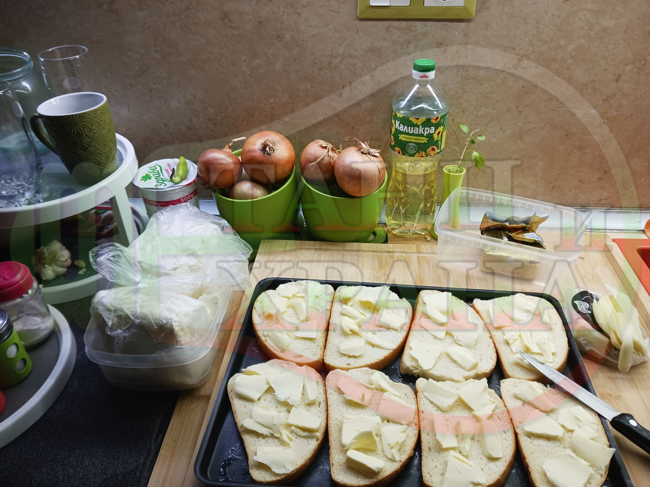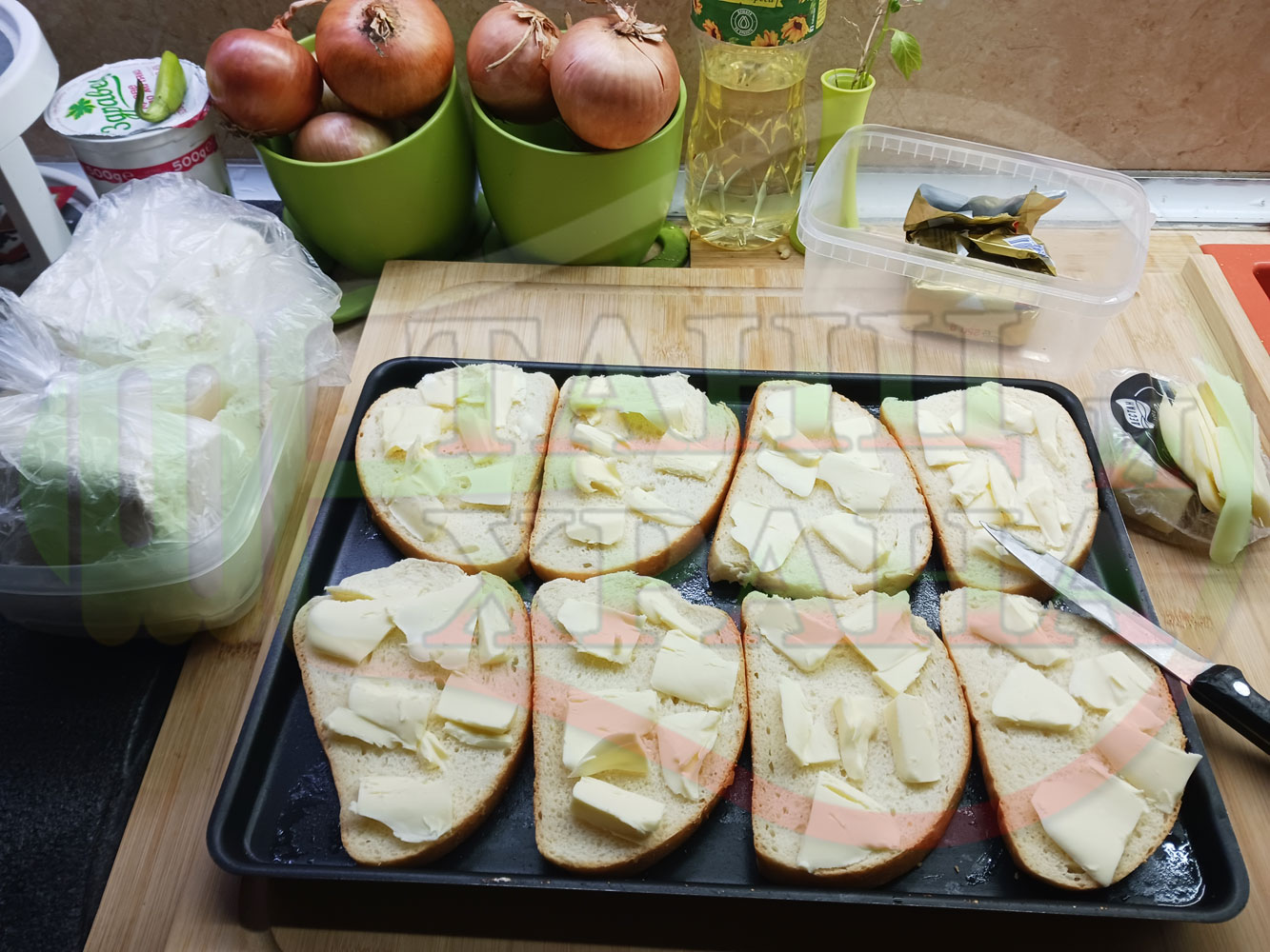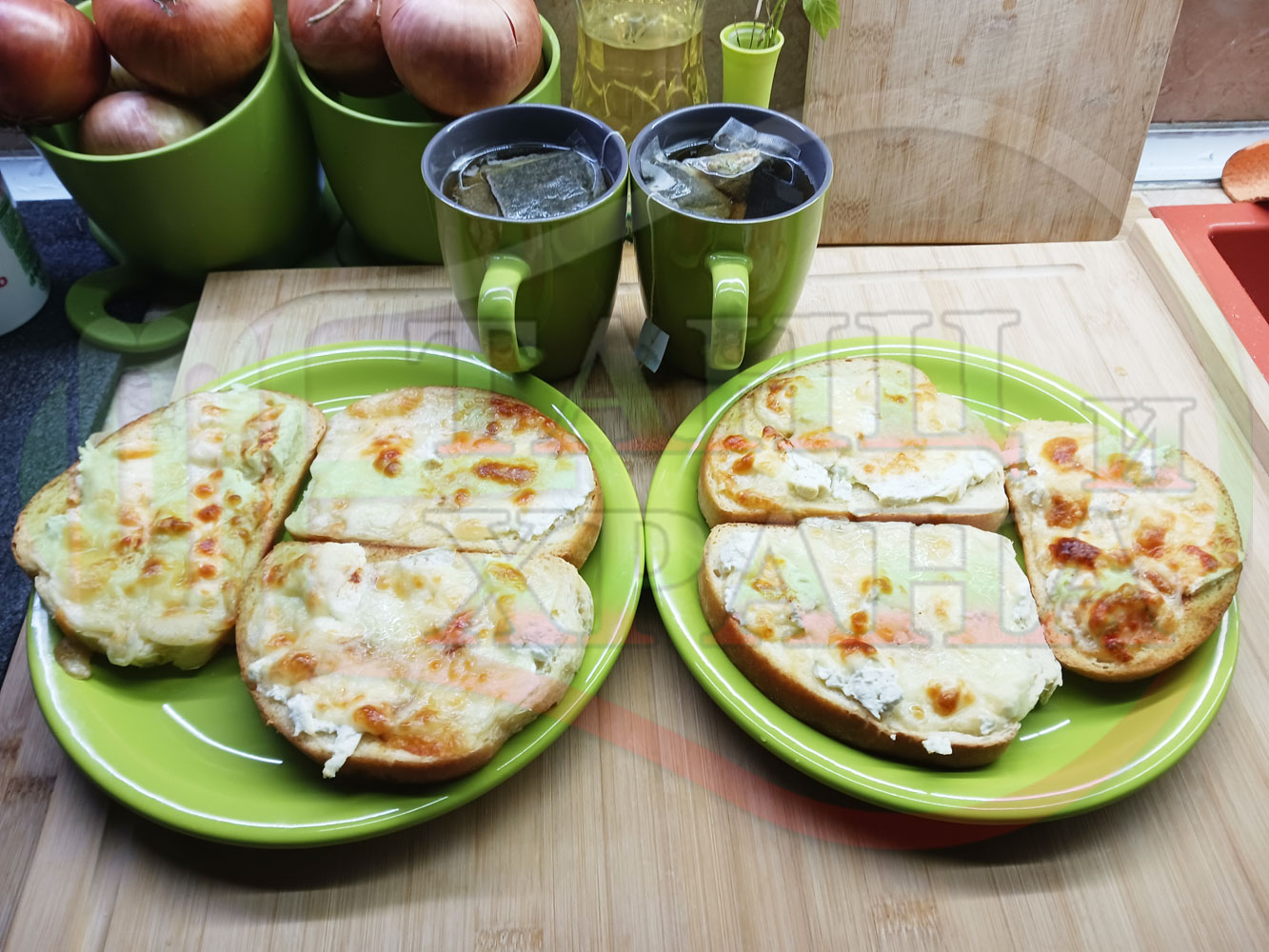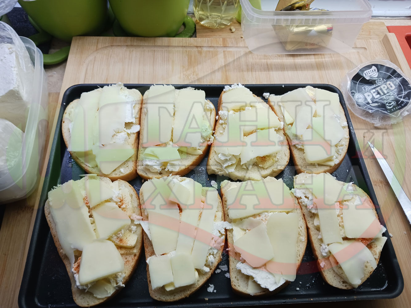 Български филийки "Кашкавалени червеносладкопиперени с БГсирене" запечени на фурна с краве масло, краве бяло сирене (българско, саламурено), червен сладък пипер и млечен кашкавал