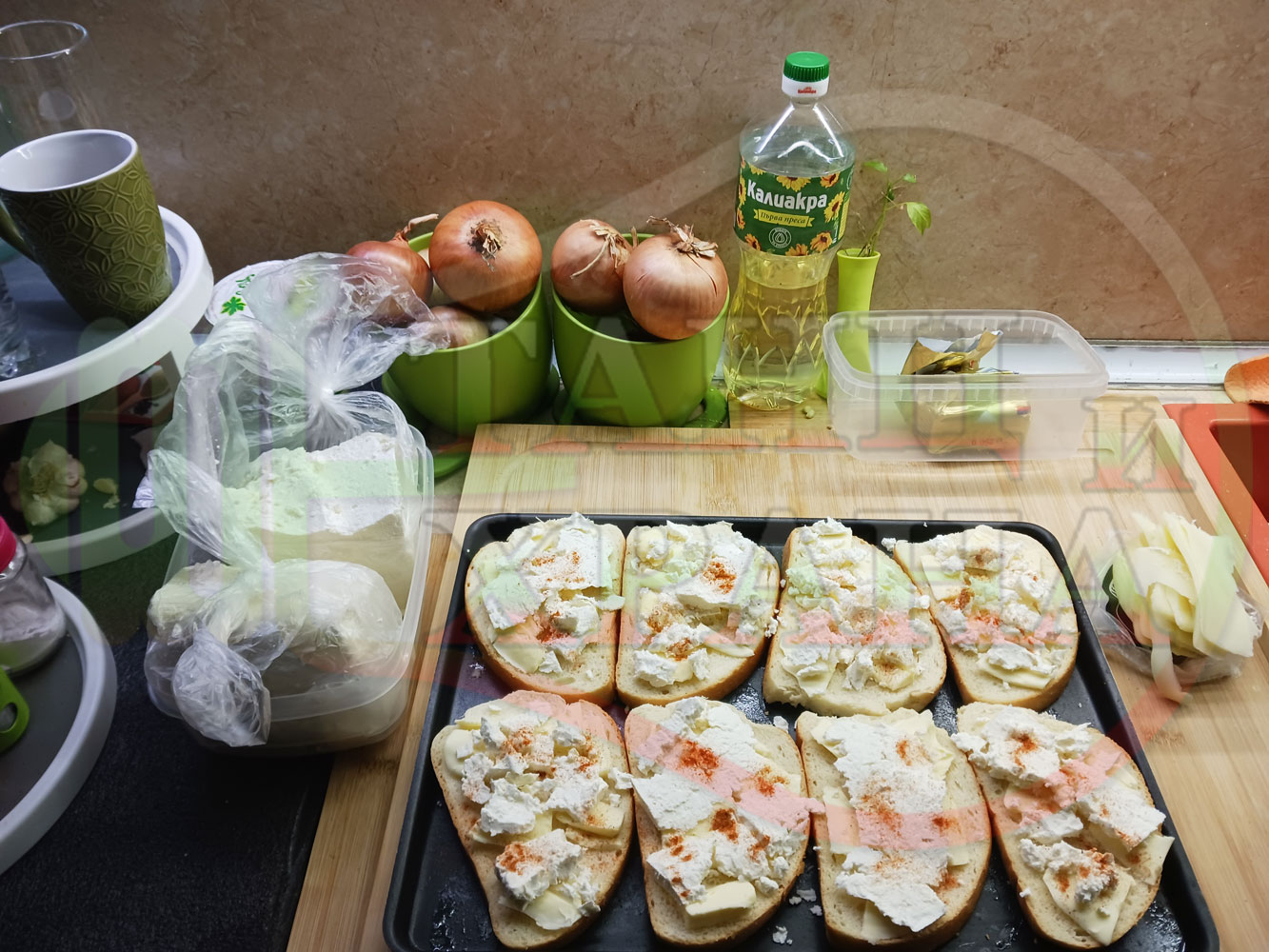 Сипете слънчогледовото олио в тънка тава за печене и го размажете равномерно по тавата чрез накланяне или с четка. Подредете филийките хляб в тавата, намажете ги с масло и разпределете равномерно количество от нарязаното краве бяло сирене на различни по големина парченца (пълното размазване на маслото по филийките не е строго задължително). Поръсете червен сладък пипер върху сиренето и добавете равномерно количество от нарязания кашкавал върху всяка филийка.