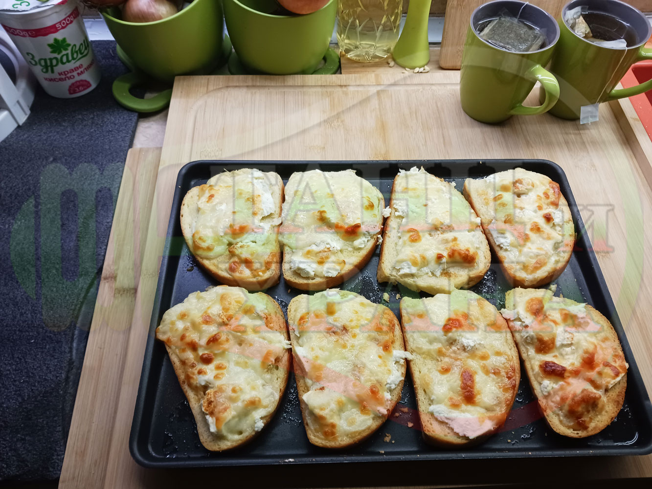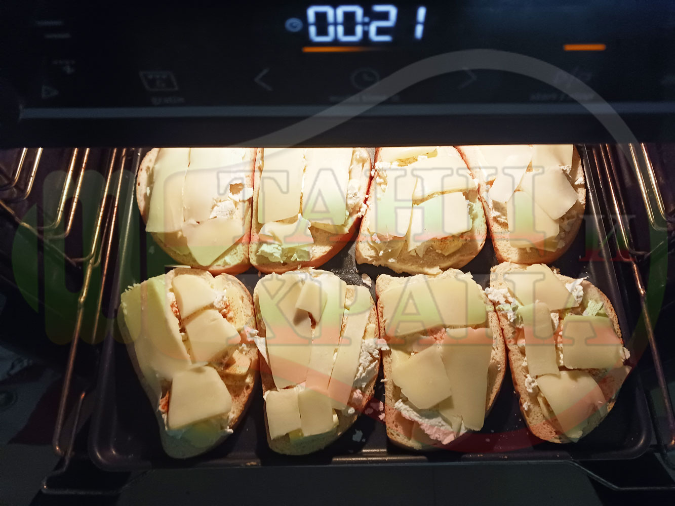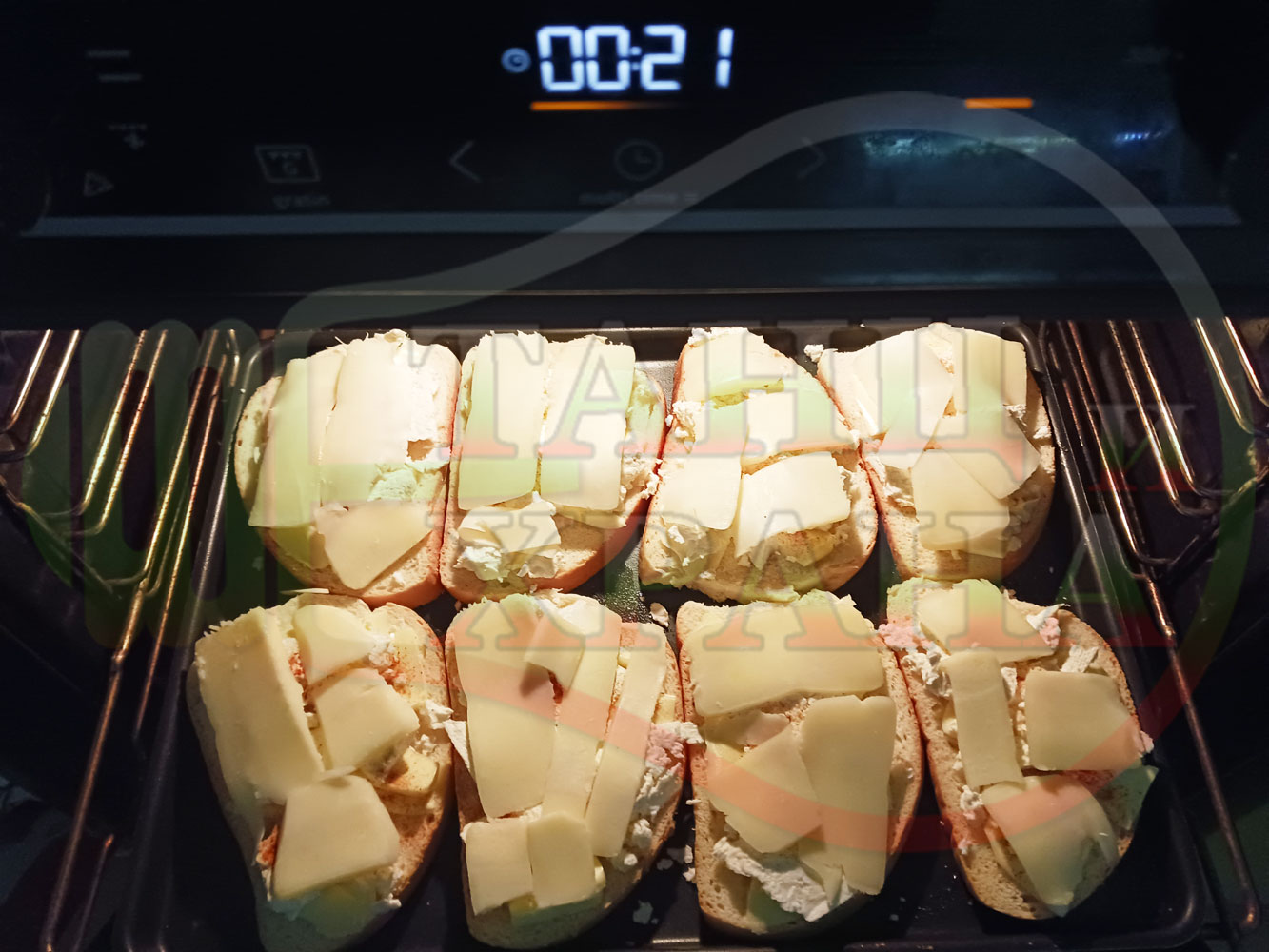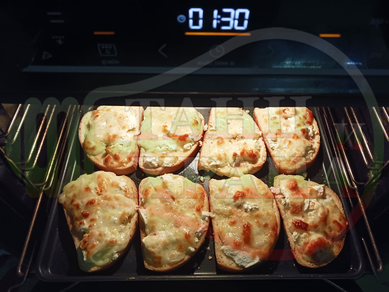 Поставете тавата с подредените филийки в предварително загрятата фурна (загрейте я за поне 5 минути. Запечете на фурна без вентилатор на 180 градуса за около 20 минути.