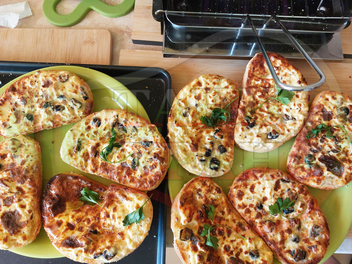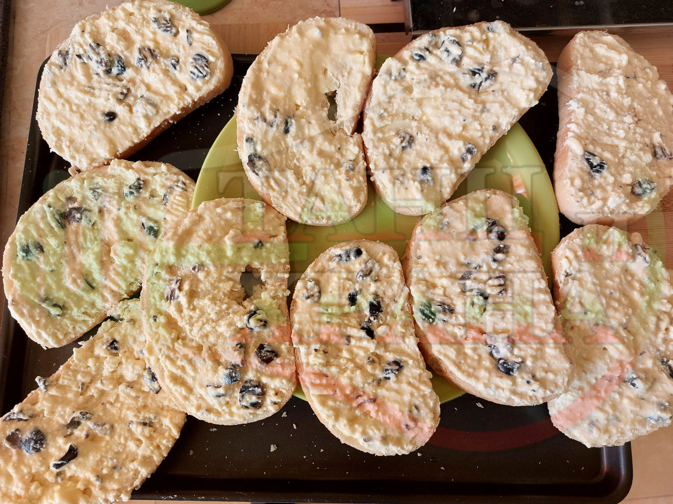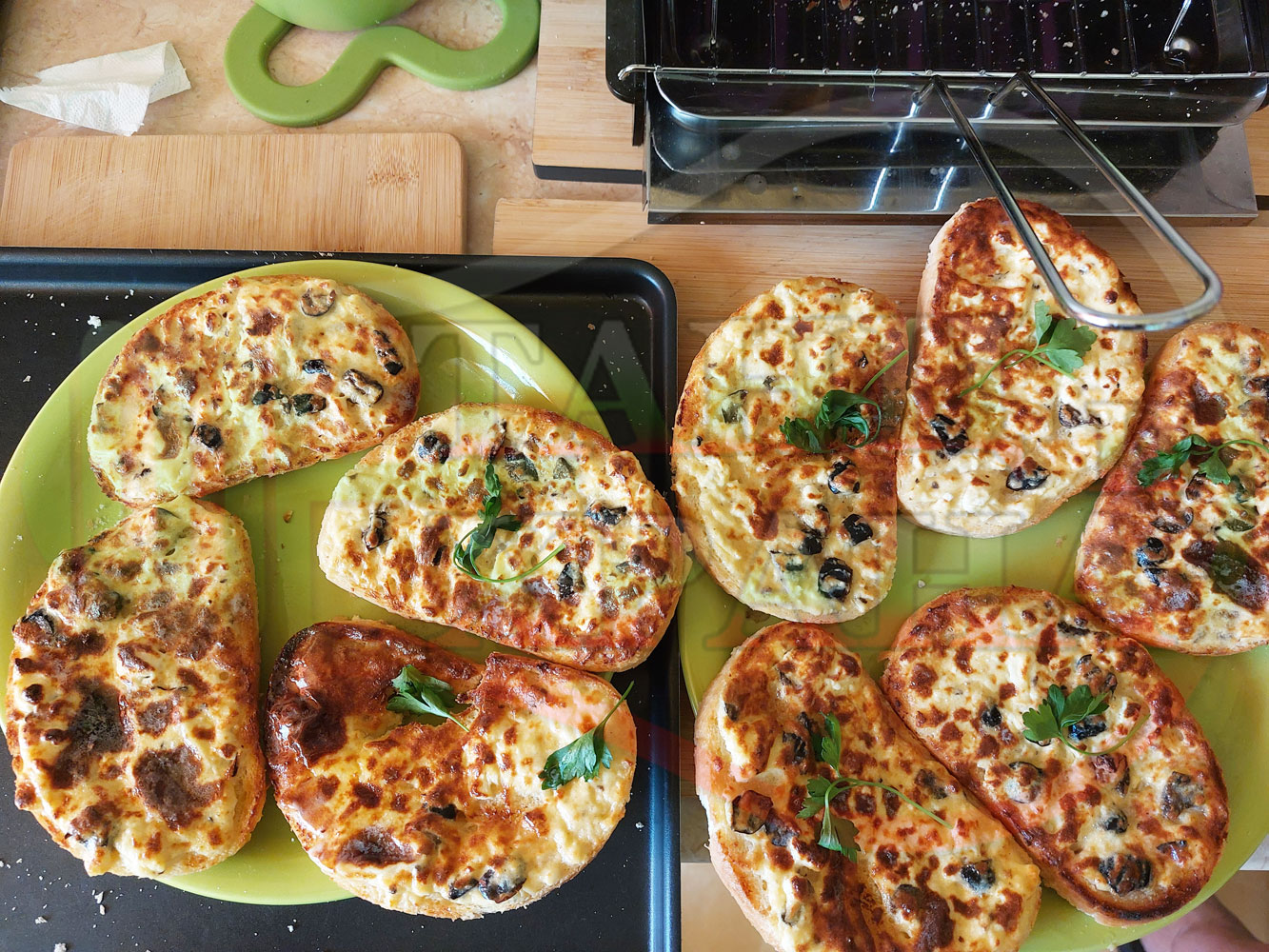 Български филийки "Маслиновочерни с БГсирене" намазани с краве масло, запечени на мини скара с яйчено сиренова плънка приготвена от яйца, черни маслини и краве бяло сирене (българско, саламурено)