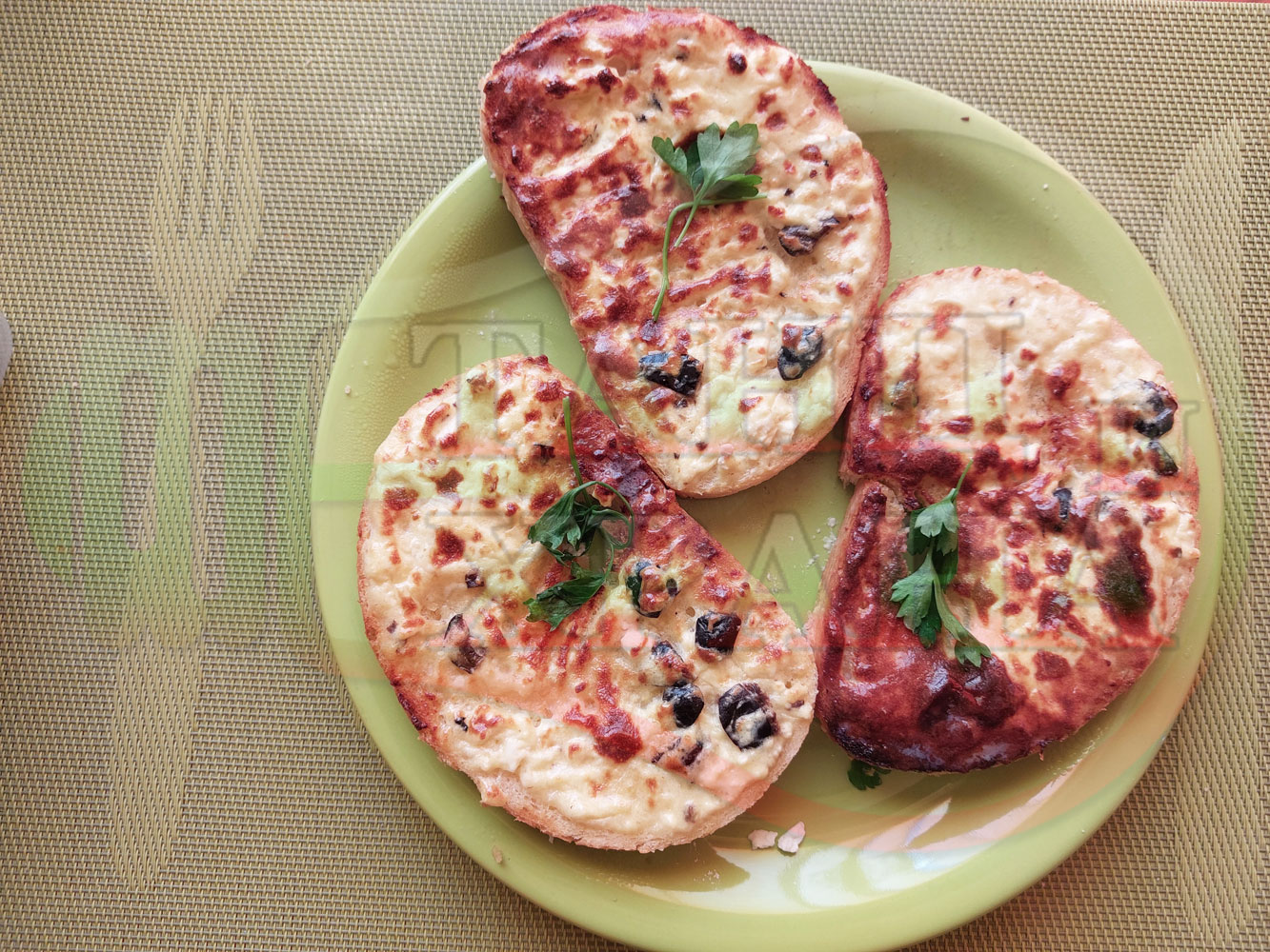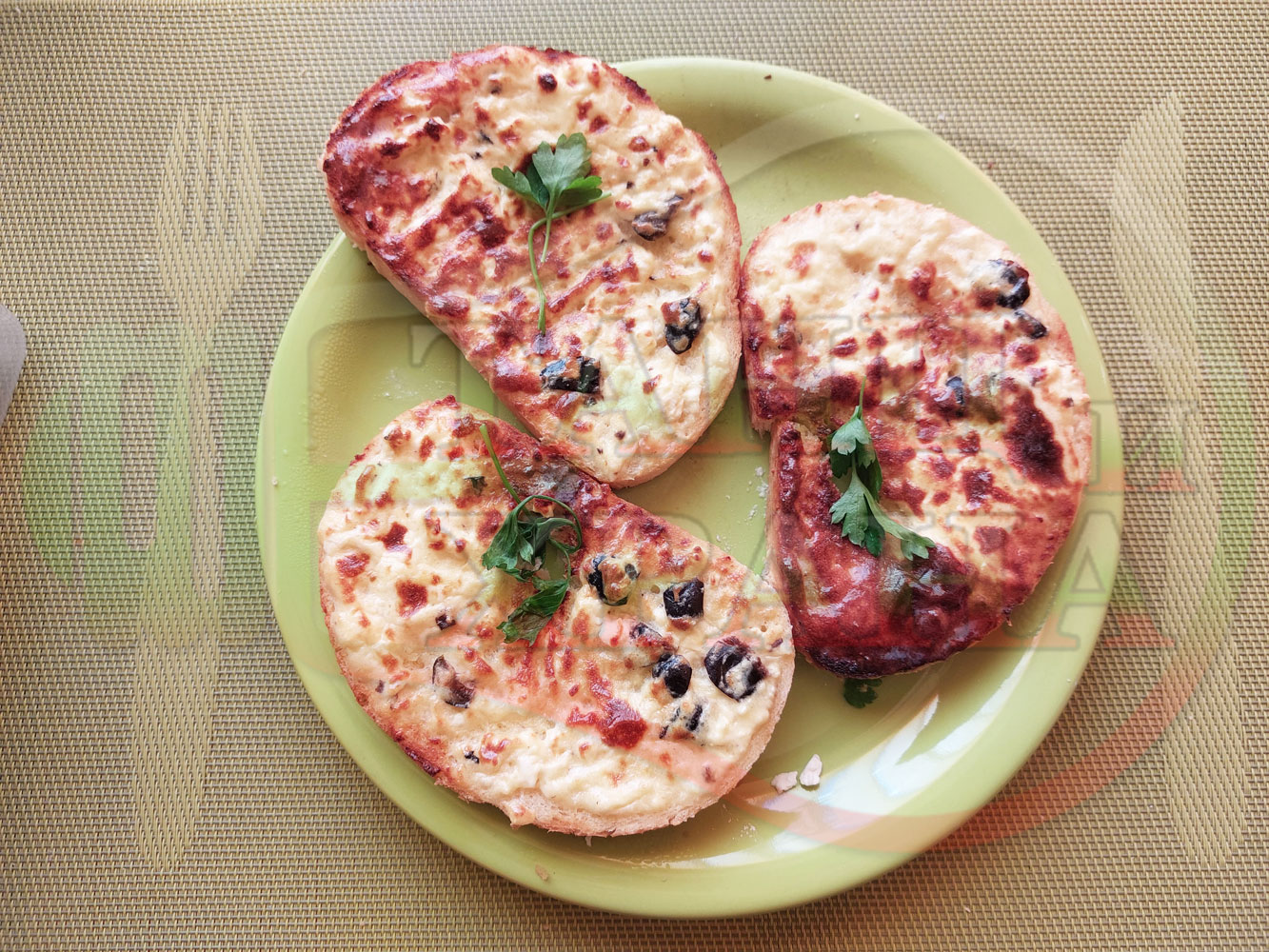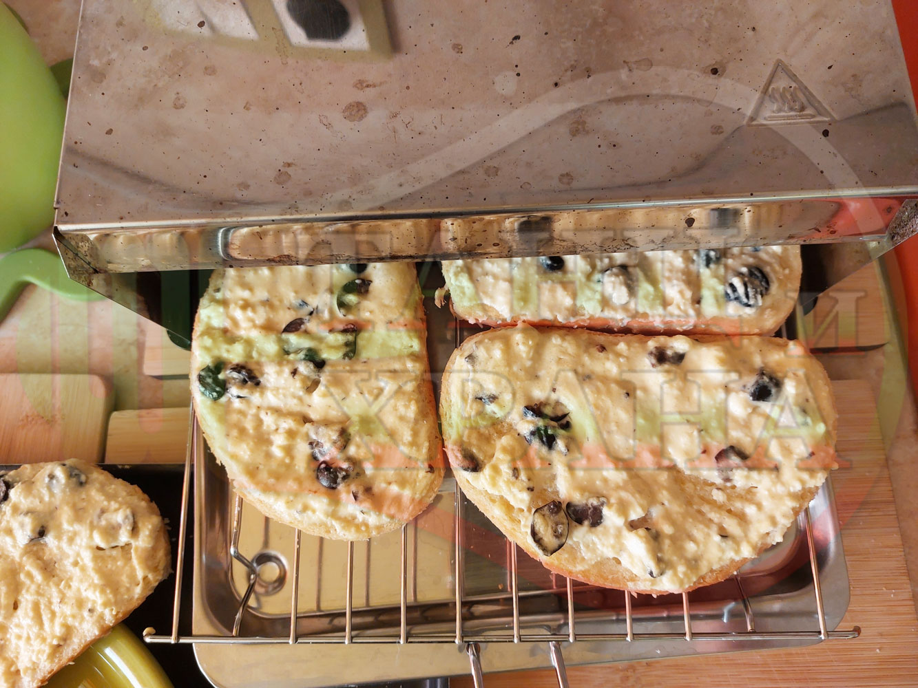 Български филийки "Маслиновочерни с БГсирене" намазани с краве масло, запечени на мини скара с яйчено сиренова плънка приготвена от яйца, черни маслини и краве бяло сирене (българско, саламурено)