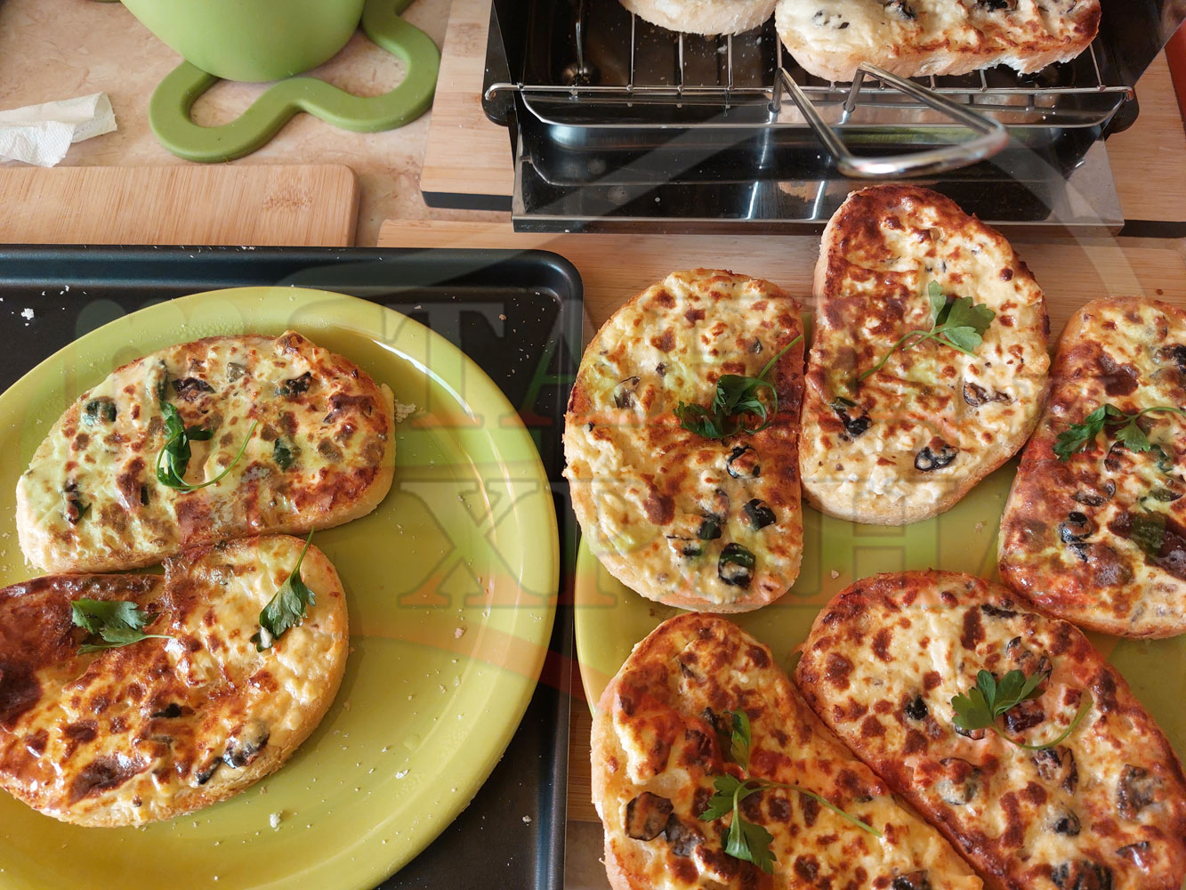 Добавете червен лют и/или сладък пипер при приготвянето на яйчено сиреновата плънка преди да запечете филийките и/или поръсете с 2-та вида пипер на вкус готовите, запечени филийки. Намажете филийките с масло докато са горещи за дообогатяване на вкуса и ги поръсете с измит и нарязан на едро магданоз и/или ги украсете със стръкчета магданоз.