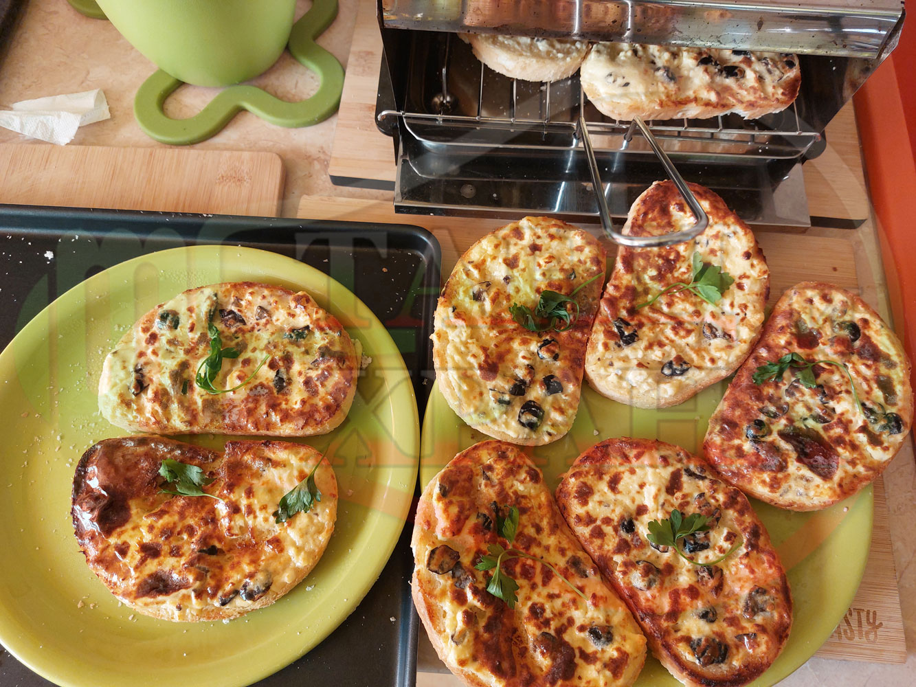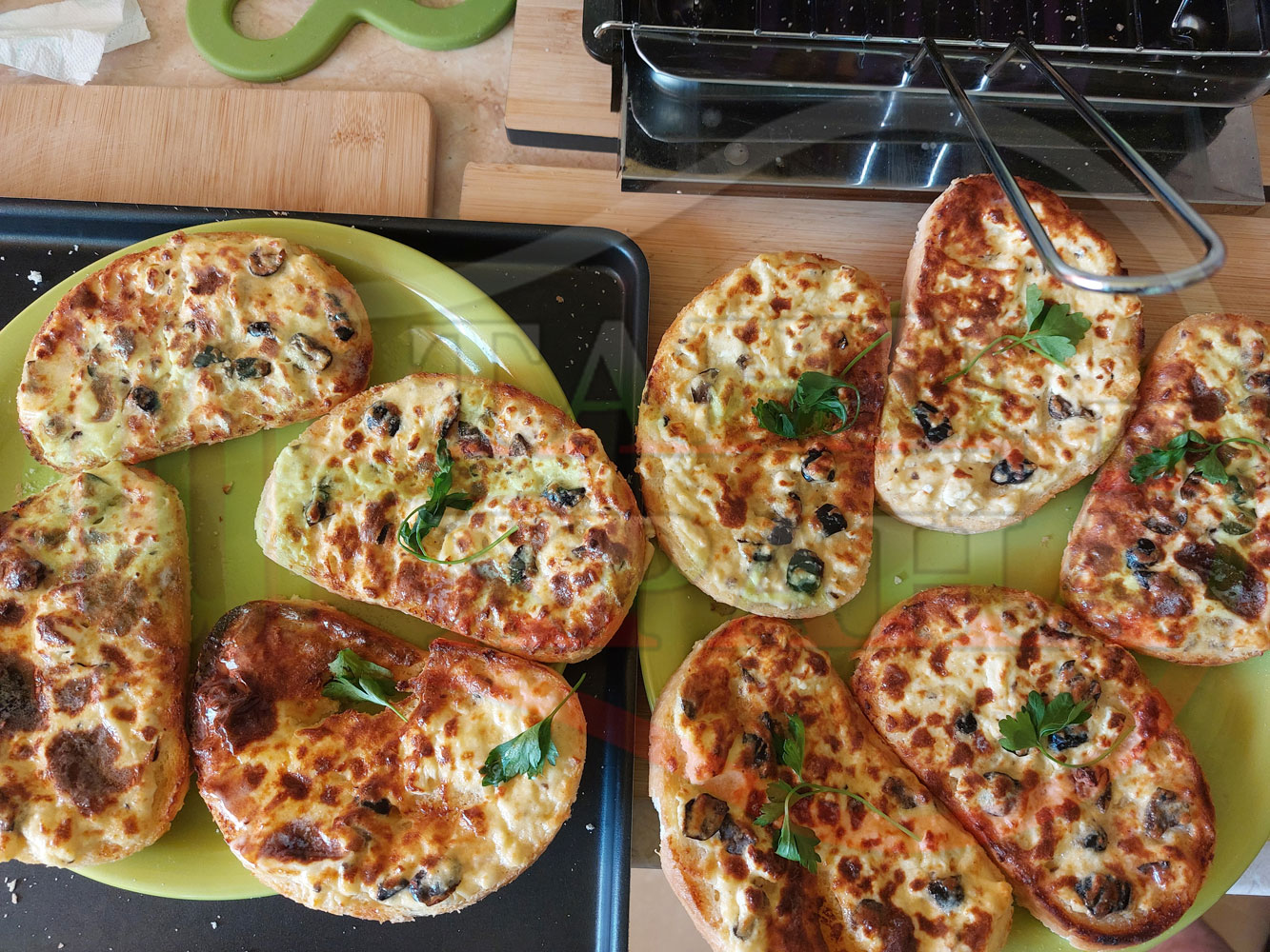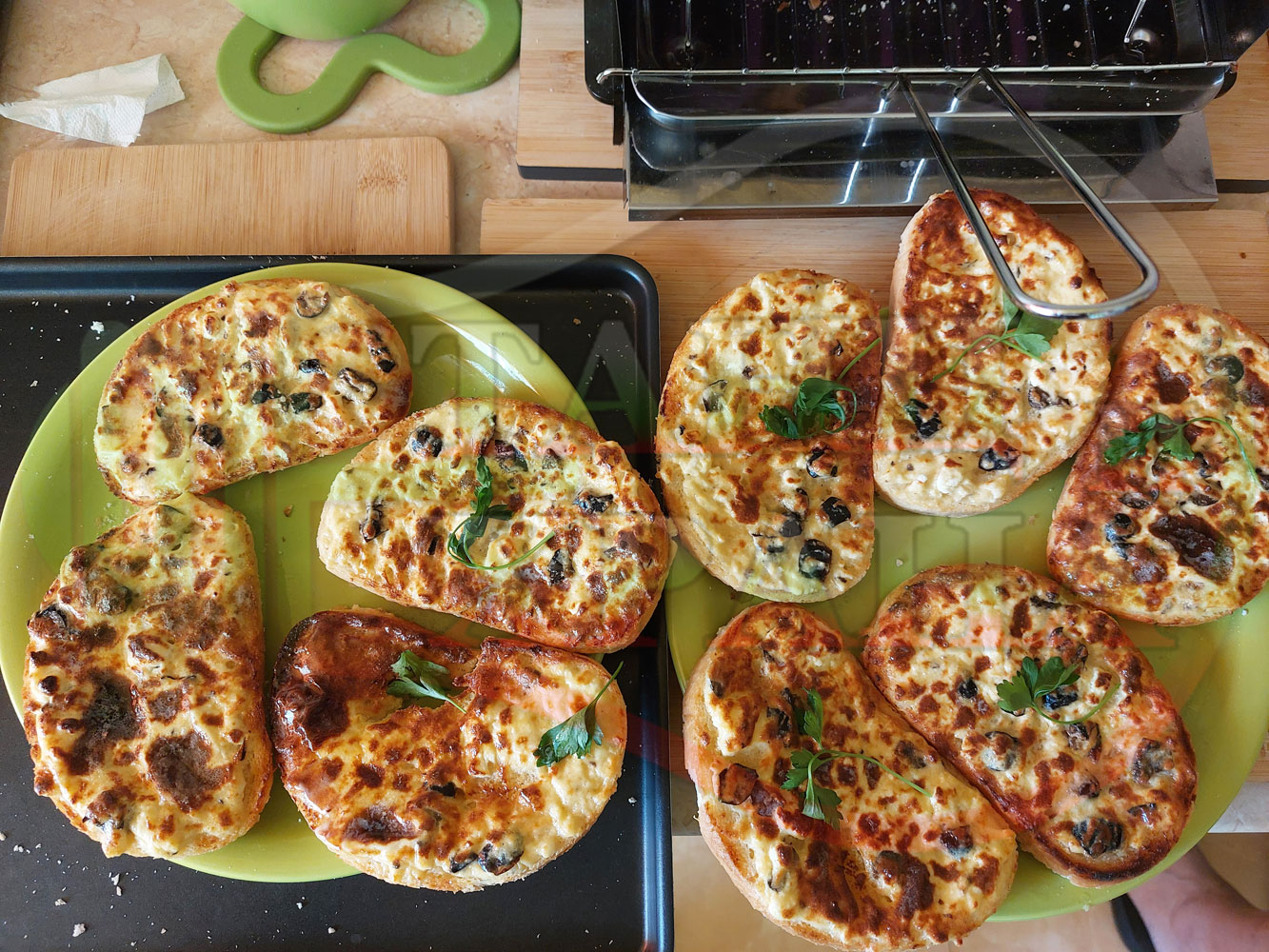 С повече масло филиите стават по-вкусни, сочни и ароматни. Преценявайте гъстотата на яйчено сиреновата плънка за да не станат филийките прекалено сухи и доста солени (зависи от големината на яйцата, солеността на българското краве бяло сирене и черните маслини).