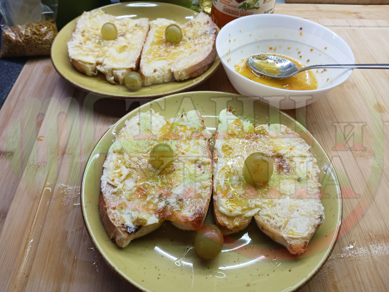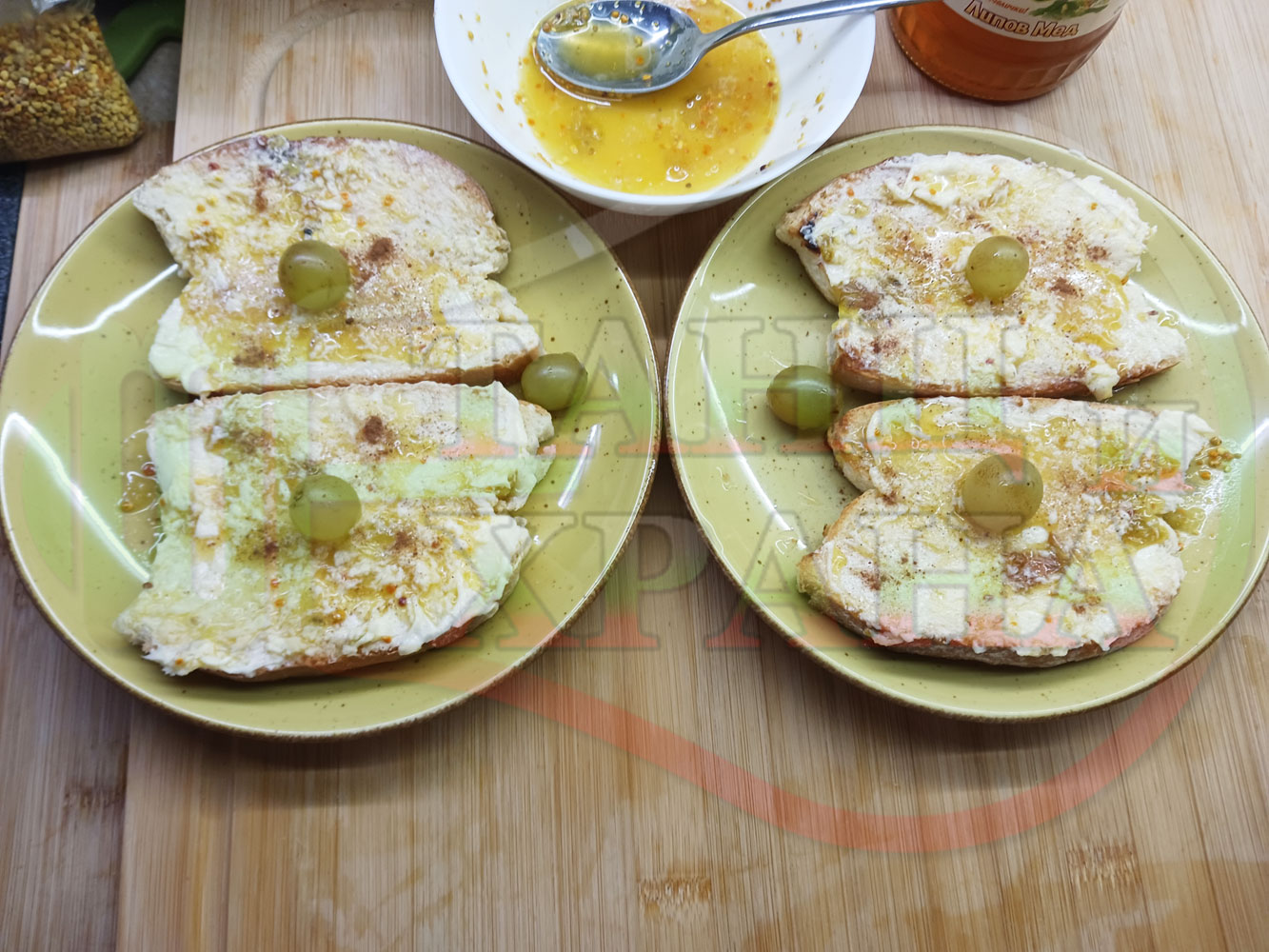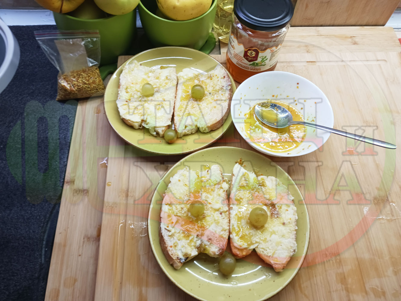 Сладки филийки "Гроздовомедни пчелноцветни" запечени на тостер намазани с масло и гроздов медено пчелен крем приготвен от прясно грозде, липов мед и пчелен цветен прашец поръсени с канела и гарнирани с гроздови зърна