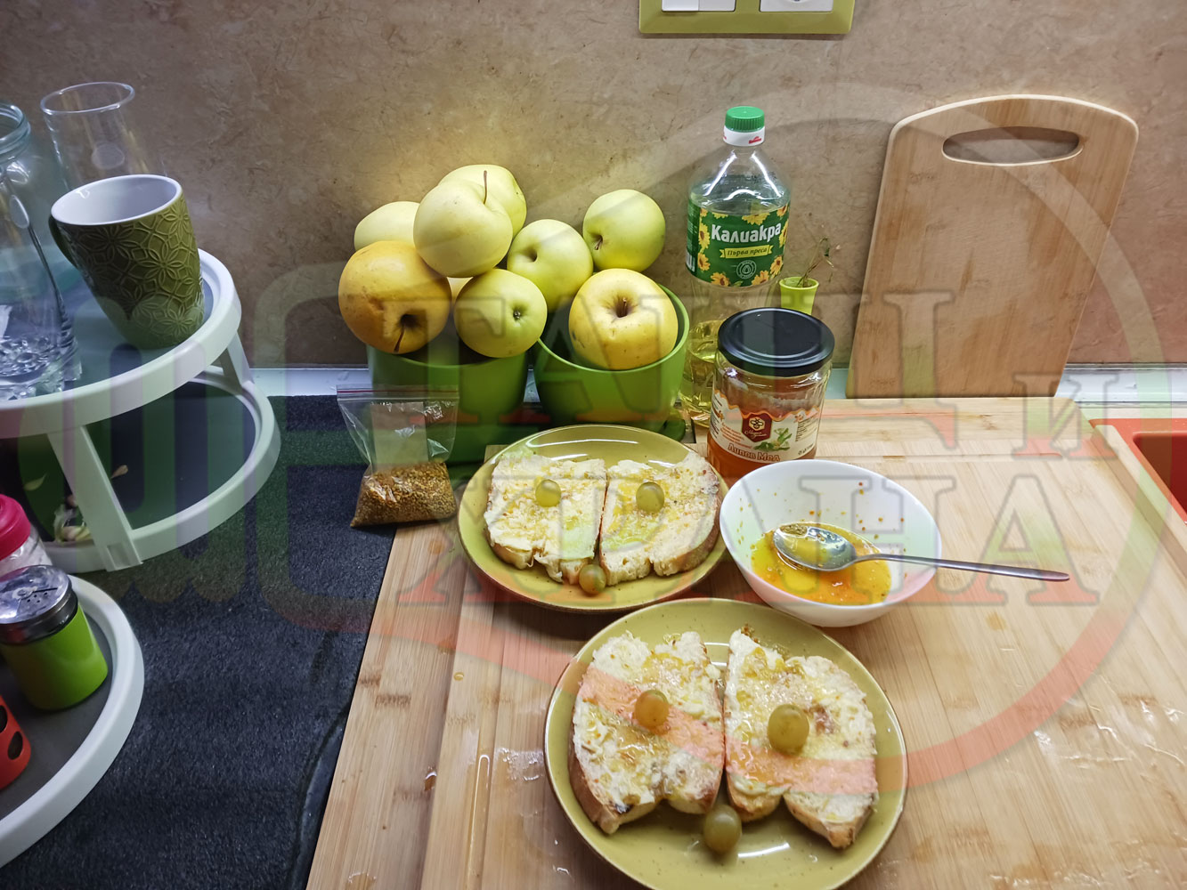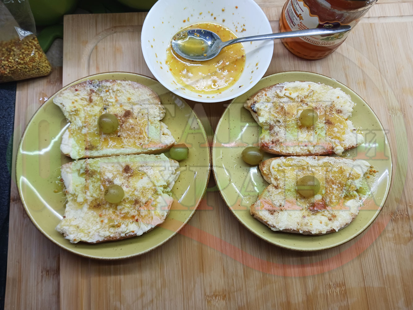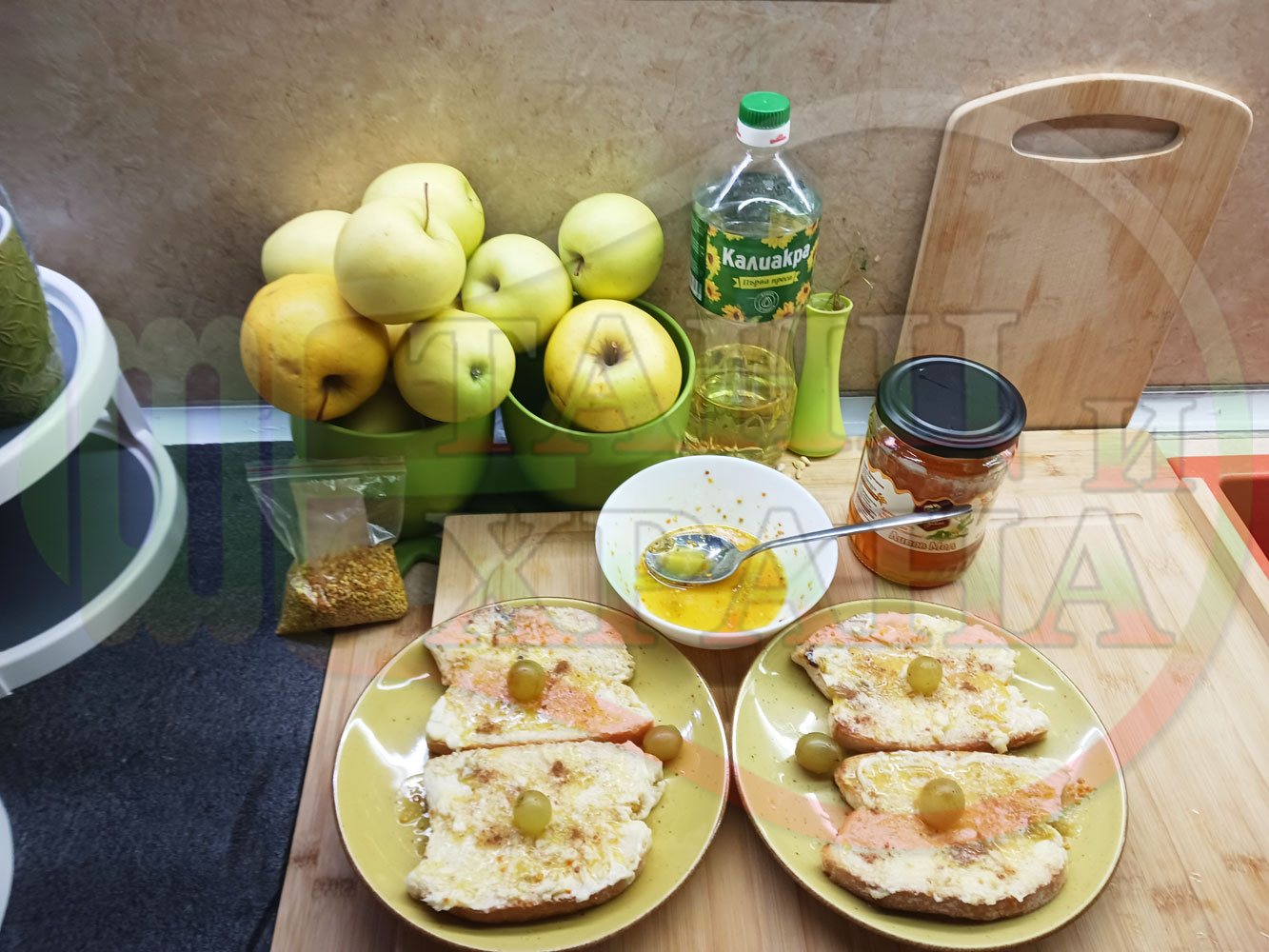 Сладки филийки "Гроздовомедни пчелноцветни" запечени на тостер намазани с масло и гроздов медено пчелен крем приготвен от прясно грозде, липов мед и пчелен цветен прашец поръсени с канела и гарнирани с гроздови зърна