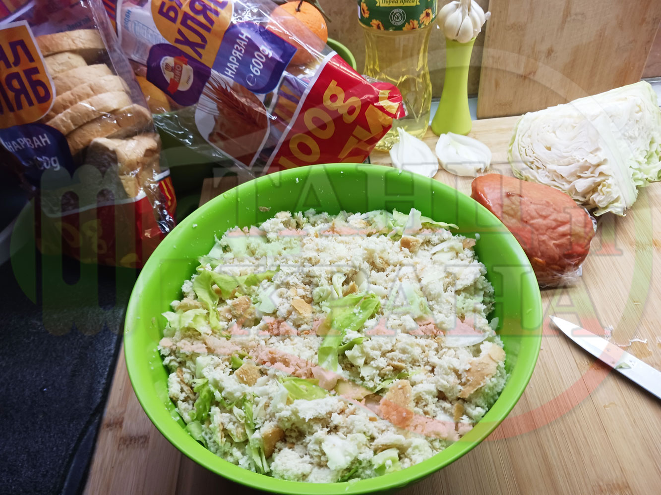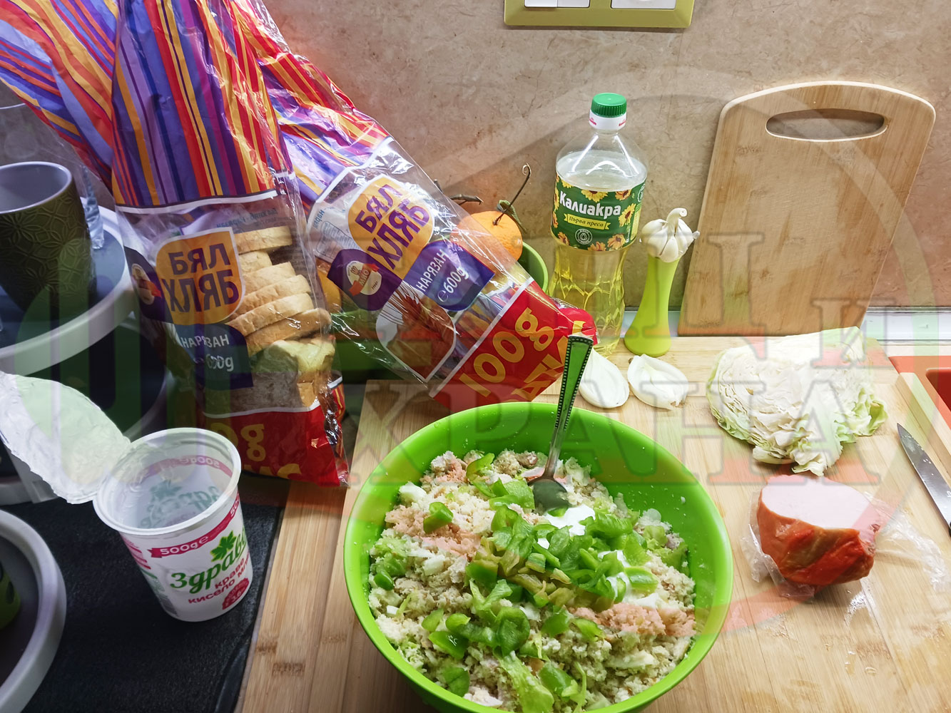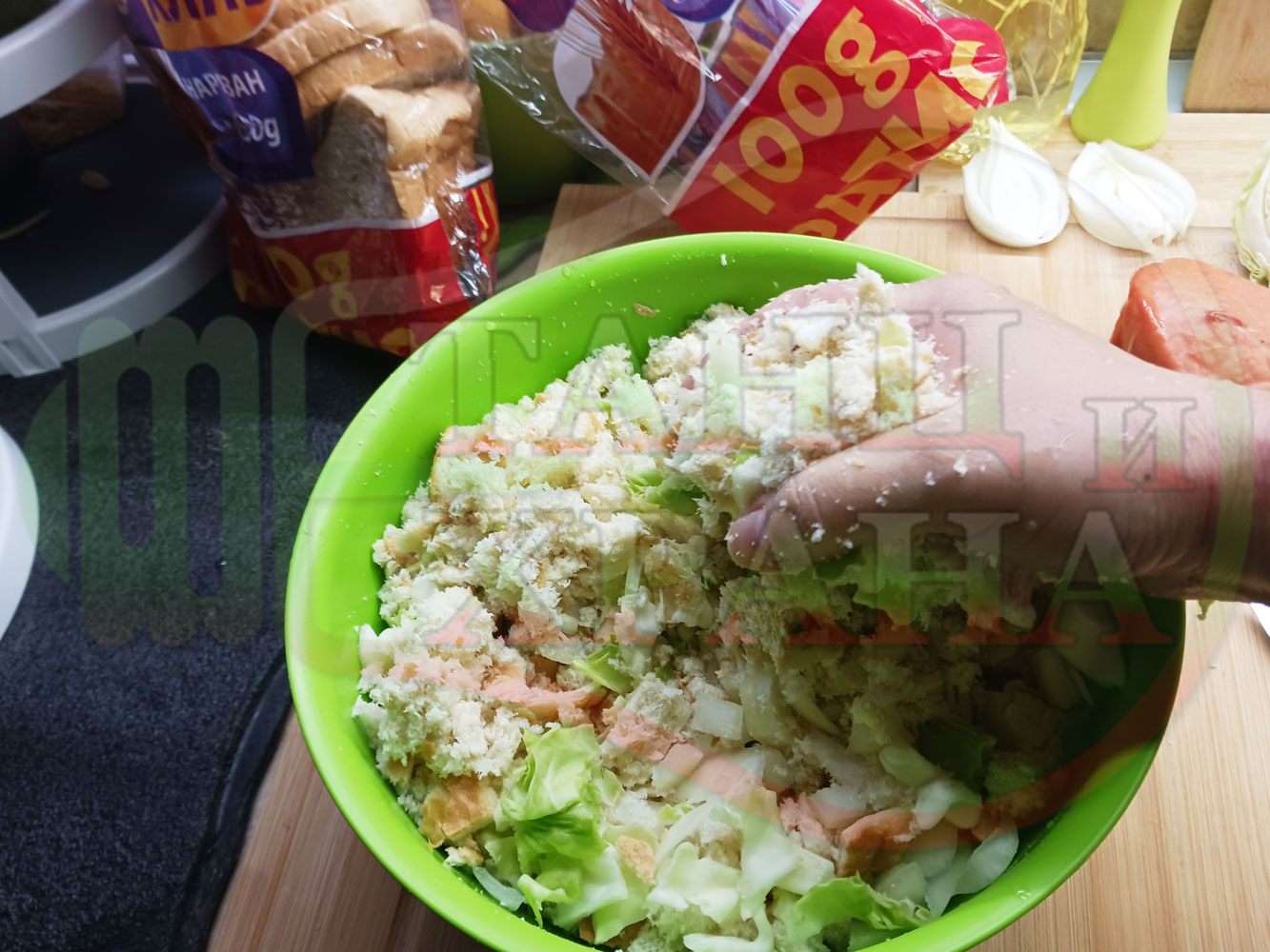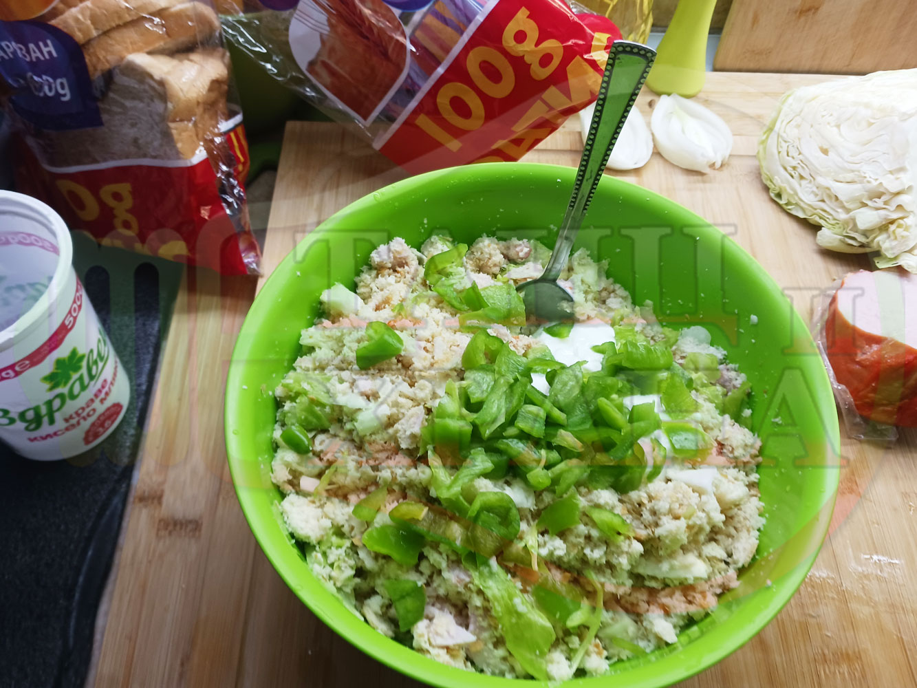 Надробете хляба в купа и добавете обеления, измит и нарязан на едро кромид лук заедно с измитото и нарязано на едро прясно зеле (заделете по-хубави вътрешни листенца от зелето и от сърцевината на кромид лука за украса). Размесете с ръка продуктите за да се овкусят, пуснат част от соковете си и се слегнат в някаква степен. Добавете обеленото от ядливата кафеникава кора и нарязано на малки парченца жарено филе заедно с обеления и нарязан на едро чесън (запазете кората от филето за друг вид ястия или бульони). Измийте чушката, почистете я от семките, нарежете я на малки парченца и я сипете в купата заедно с българското кисело мляко и слънчогледовото олио. Отново размесете с ръка и продължете да разбърквате и намачквате продуктите с вилица до получаване на сравнително гъсто, хомогенизирано хлебно тесто.
