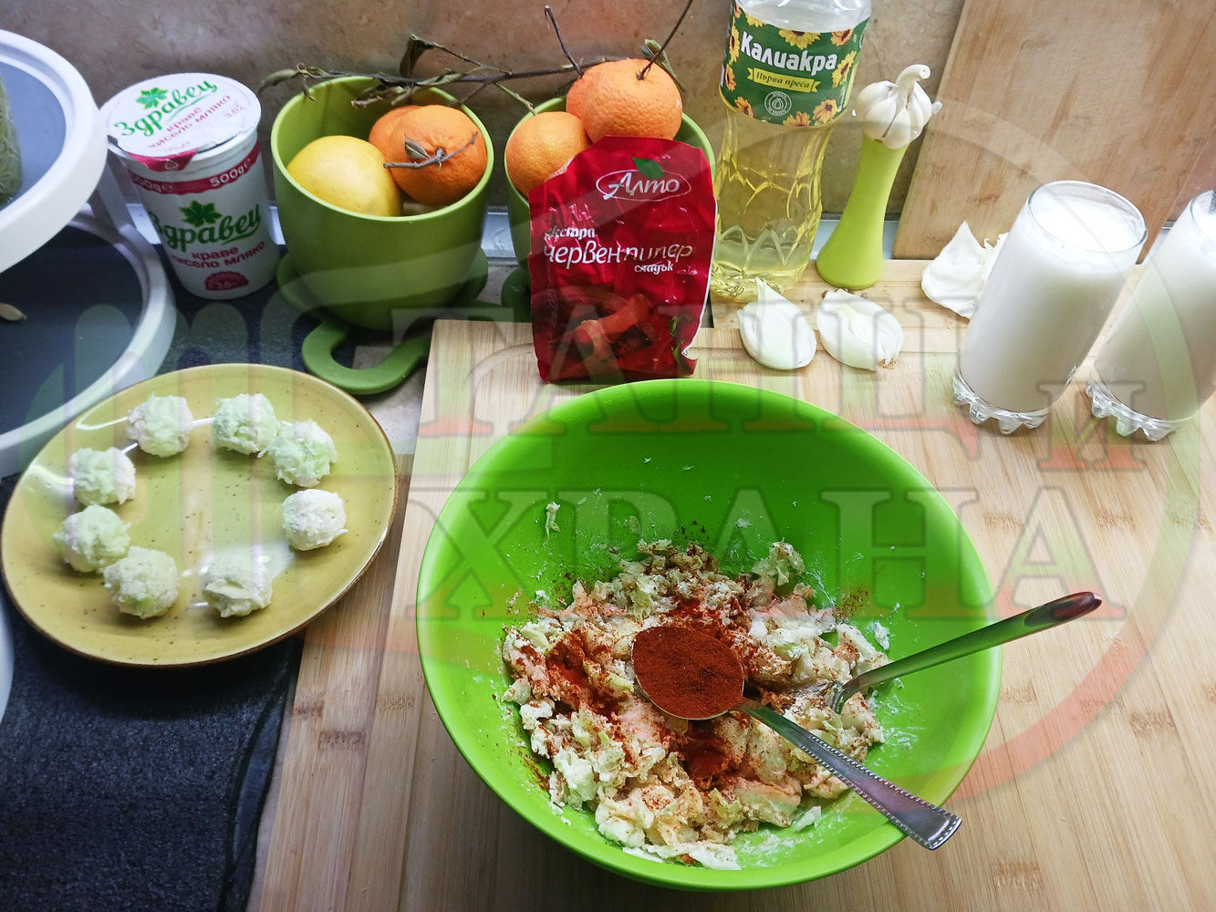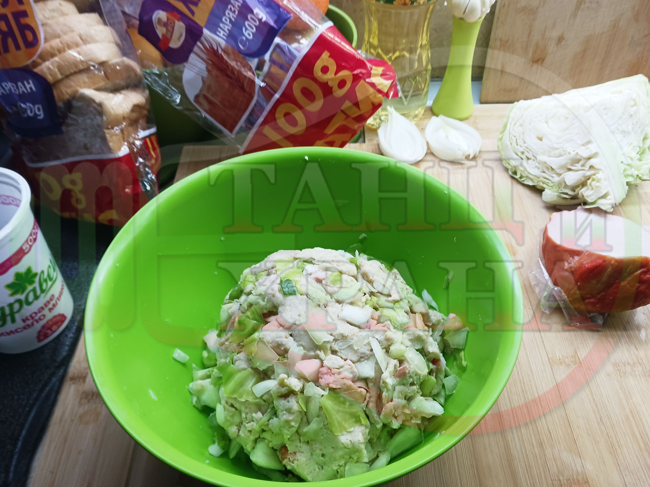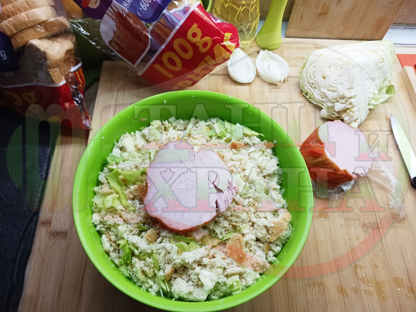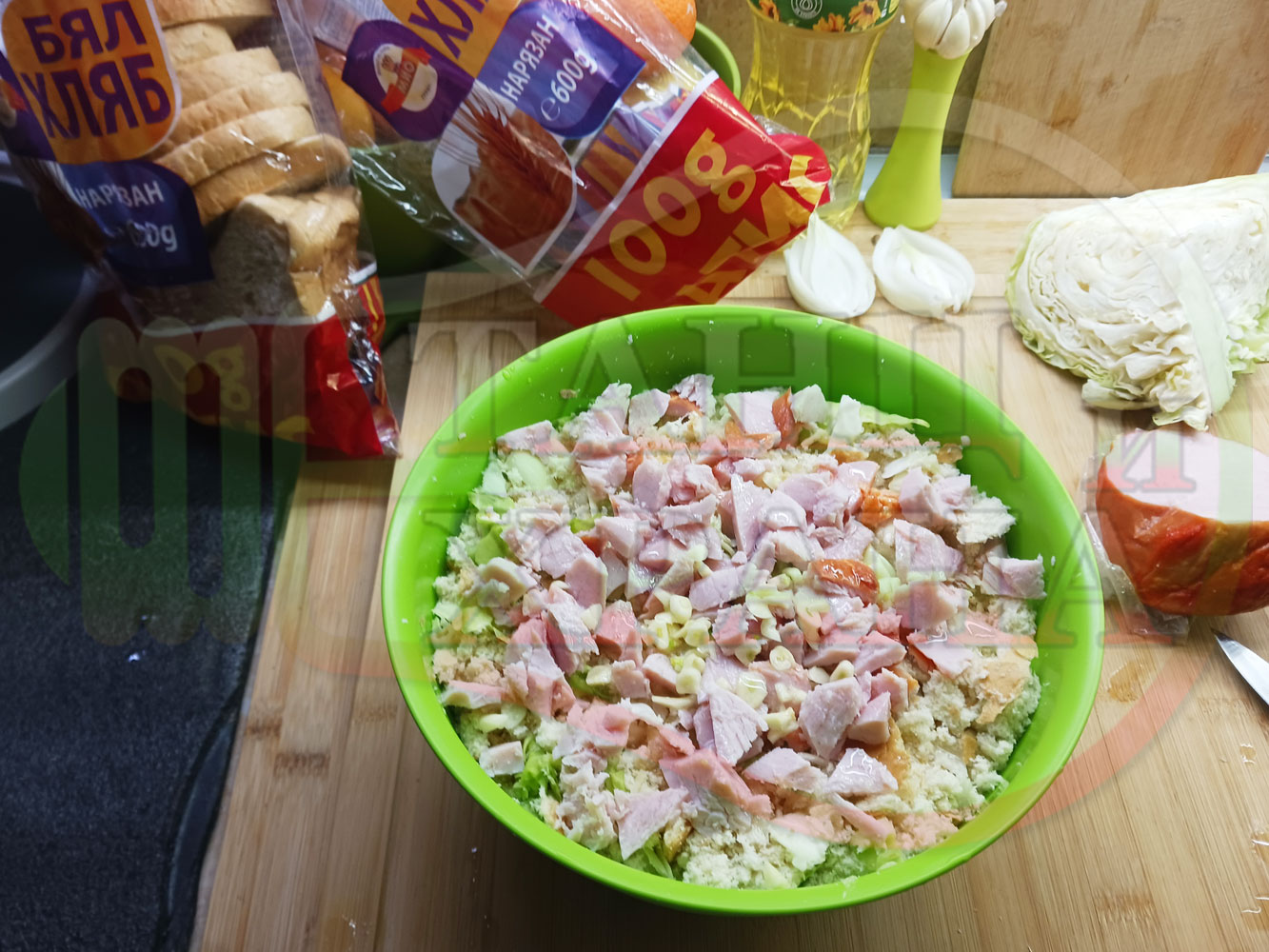 Надробете хляба в купа и добавете обеления, измит и нарязан на едро кромид лук заедно с измитото и нарязано на едро прясно зеле (заделете по-хубави вътрешни листенца от зелето и от сърцевината на кромид лука за украса). Размесете с ръка продуктите за да се овкусят, пуснат част от соковете си и се слегнат в някаква степен. Добавете обеленото от ядливата кафеникава кора и нарязано на малки парченца жарено филе заедно с обеления и нарязан на едро чесън (запазете кората от филето за друг вид ястия или бульони). Измийте чушката, почистете я от семките, нарежете я на малки парченца и я сипете в купата заедно с българското кисело мляко и слънчогледовото олио. Отново размесете с ръка и продължете да разбърквате и намачквате продуктите с вилица до получаване на сравнително гъсто, хомогенизирано хлебно тесто.
