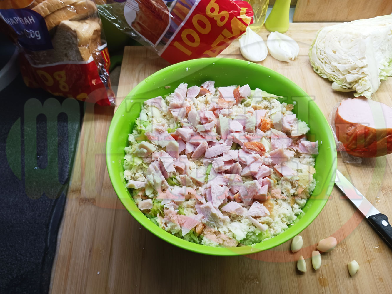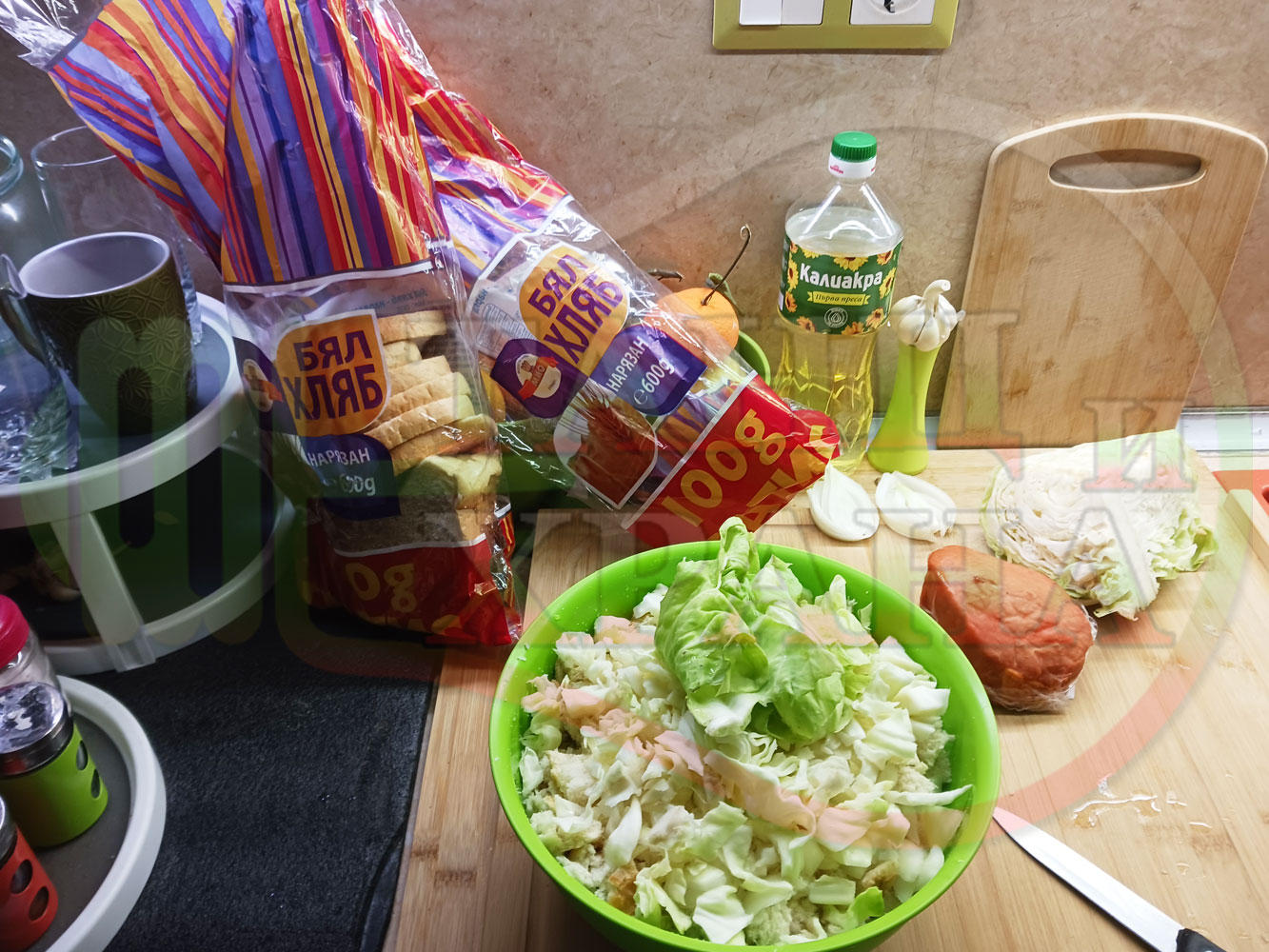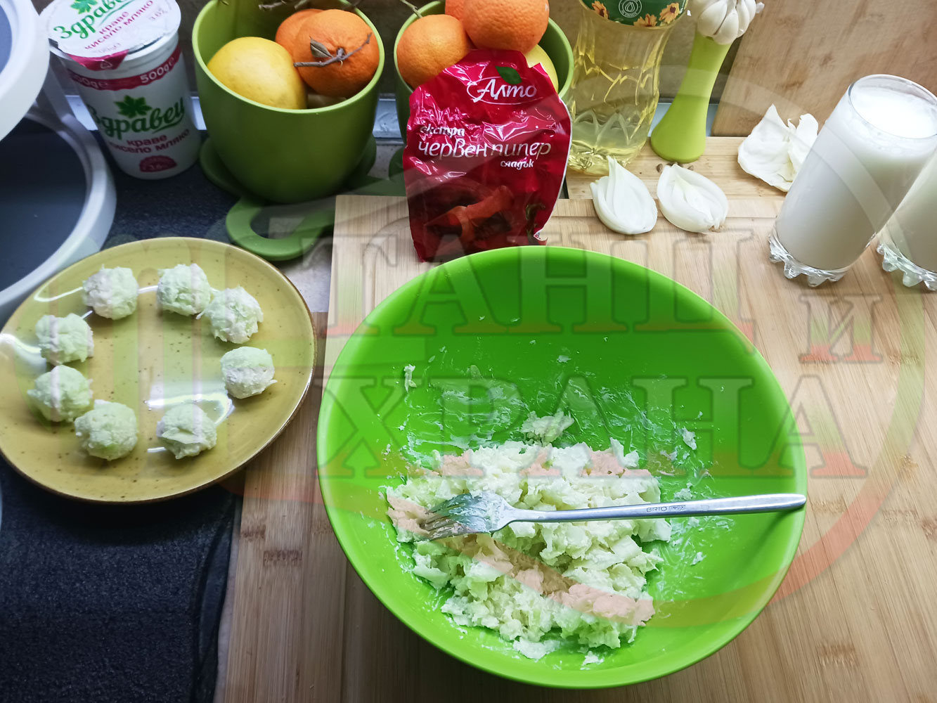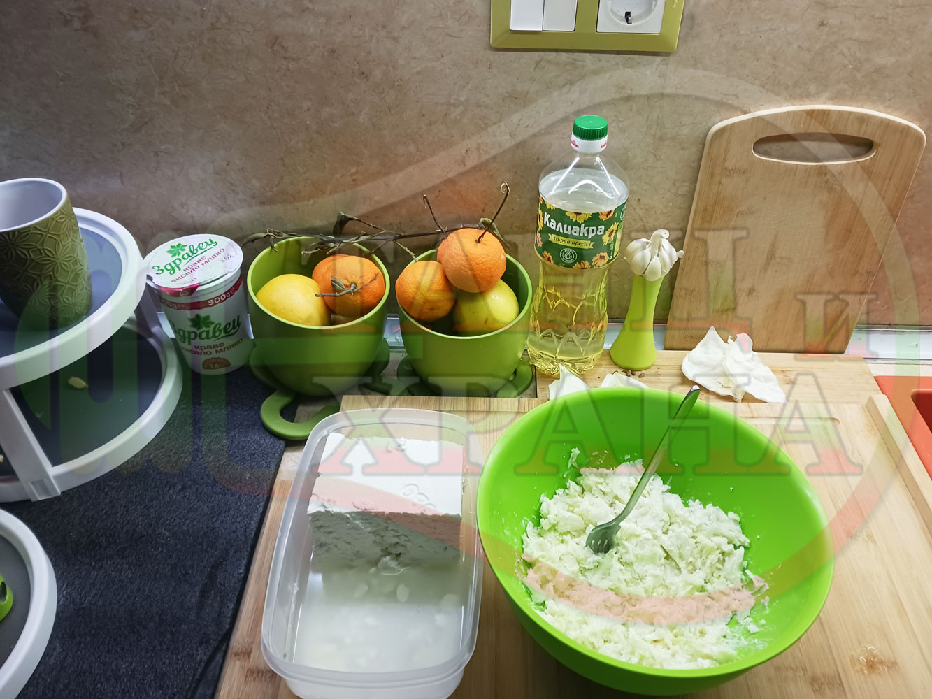 Надробете хляба в купа и добавете обеления, измит и нарязан на едро кромид лук заедно с измитото и нарязано на едро прясно зеле (заделете по-хубави вътрешни листенца от зелето и от сърцевината на кромид лука за украса). Размесете с ръка продуктите за да се овкусят, пуснат част от соковете си и се слегнат в някаква степен. Добавете обеленото от ядливата кафеникава кора и нарязано на малки парченца жарено филе заедно с обеления и нарязан на едро чесън (запазете кората от филето за друг вид ястия или бульони). Измийте чушката, почистете я от семките, нарежете я на малки парченца и я сипете в купата заедно с българското кисело мляко и слънчогледовото олио. Отново размесете с ръка и продължете да разбърквате и намачквате продуктите с вилица до получаване на сравнително гъсто, хомогенизирано хлебно тесто.