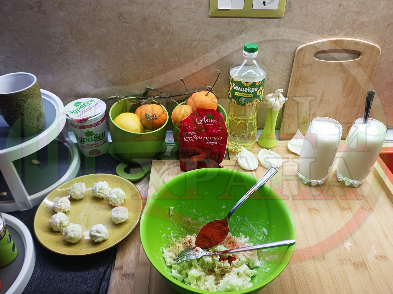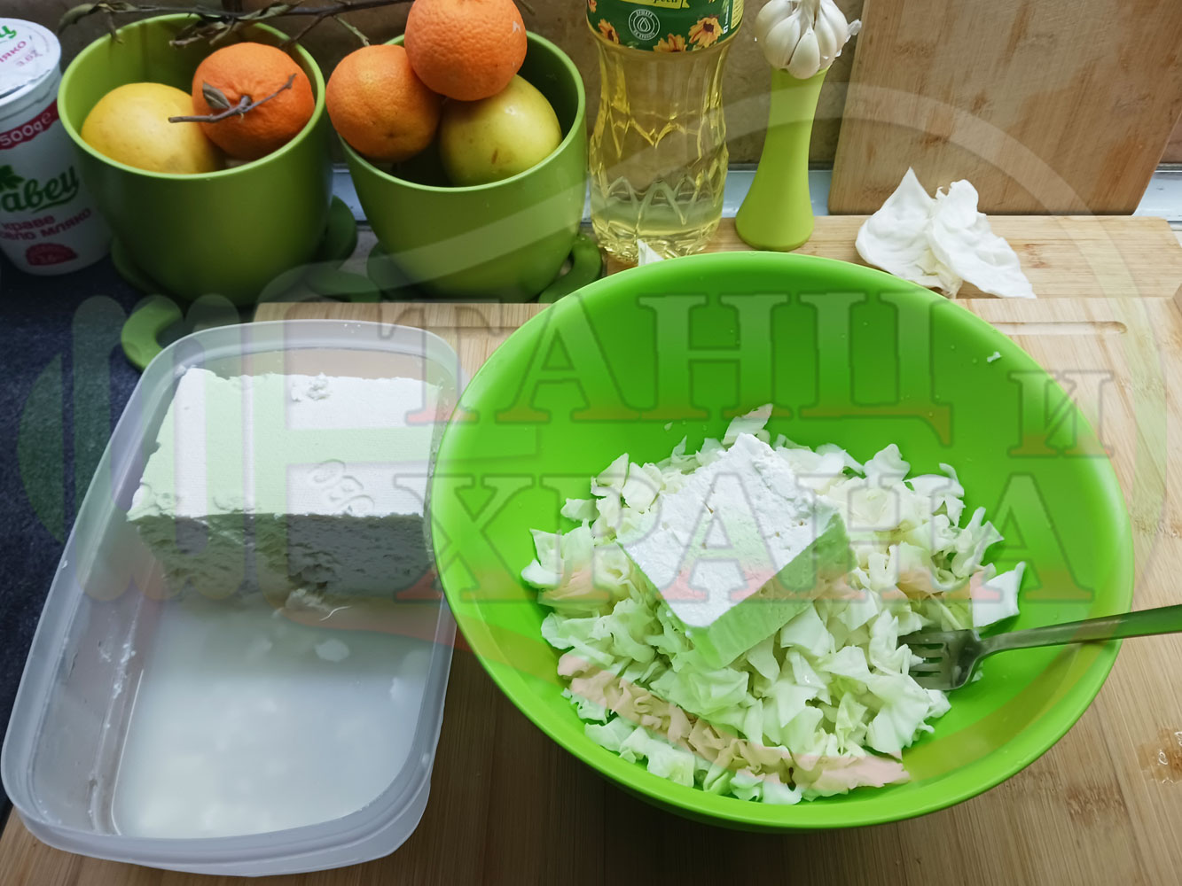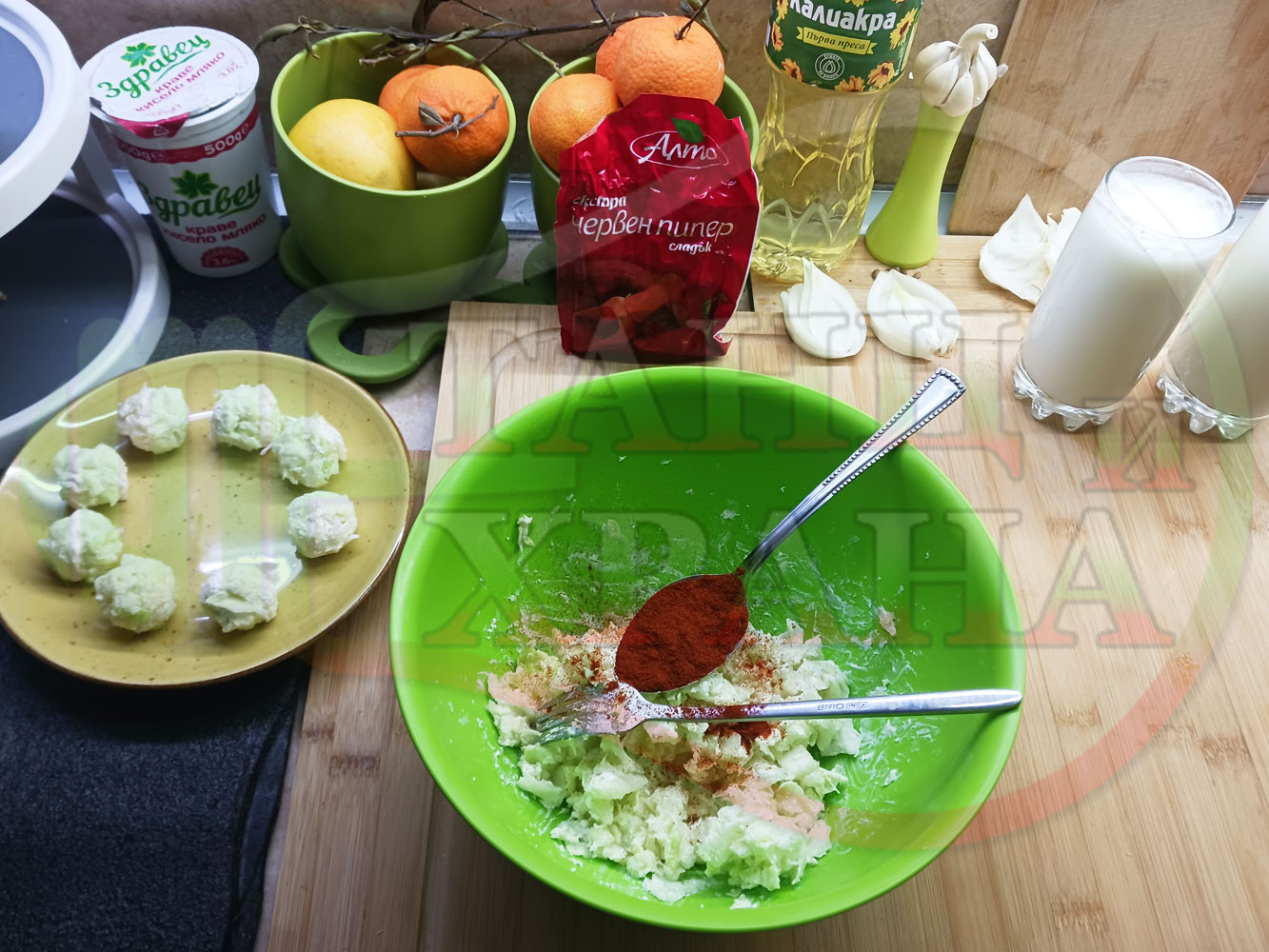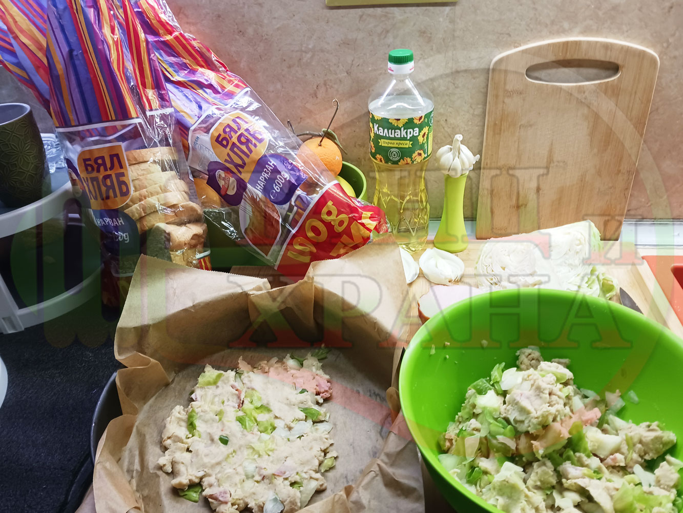 Надробете хляба в купа и добавете обеления, измит и нарязан на едро кромид лук заедно с измитото и нарязано на едро прясно зеле (заделете по-хубави вътрешни листенца от зелето и от сърцевината на кромид лука за украса). Размесете с ръка продуктите за да се овкусят, пуснат част от соковете си и се слегнат в някаква степен. Добавете обеленото от ядливата кафеникава кора и нарязано на малки парченца жарено филе заедно с обеления и нарязан на едро чесън (запазете кората от филето за друг вид ястия или бульони). Измийте чушката, почистете я от семките, нарежете я на малки парченца и я сипете в купата заедно с българското кисело мляко и слънчогледовото олио. Отново размесете с ръка и продължете да разбърквате и намачквате продуктите с вилица до получаване на сравнително гъсто, хомогенизирано хлебно тесто.