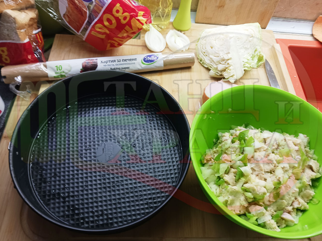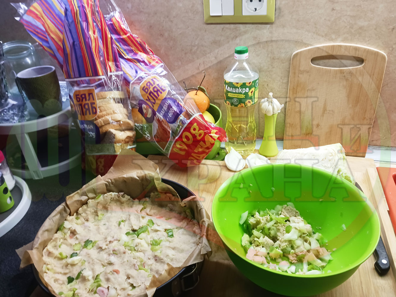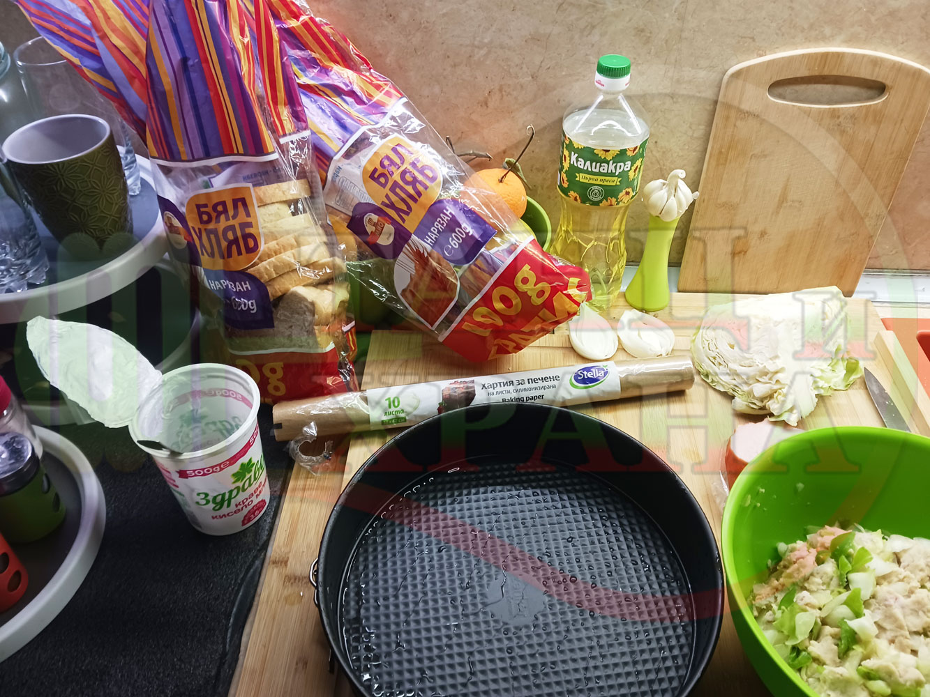 ПРОДУКТИ: Приблизителни количества за българска хлебна торта "Зелева филежарена" омесена от хляб с прясно зеле, кромид лук, зелени пресни чушки, жарено филе и кисело мляко от България сурово гарнирана със сиреново зелев крем с червен сладък пипер и краве бяло сирене - двукомпонентна