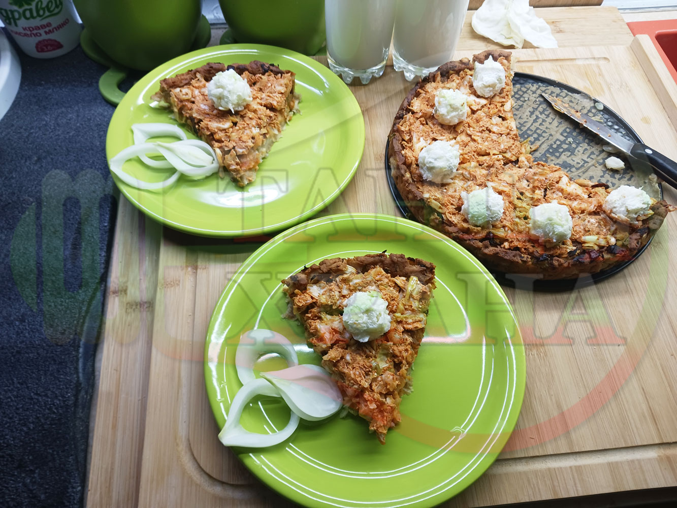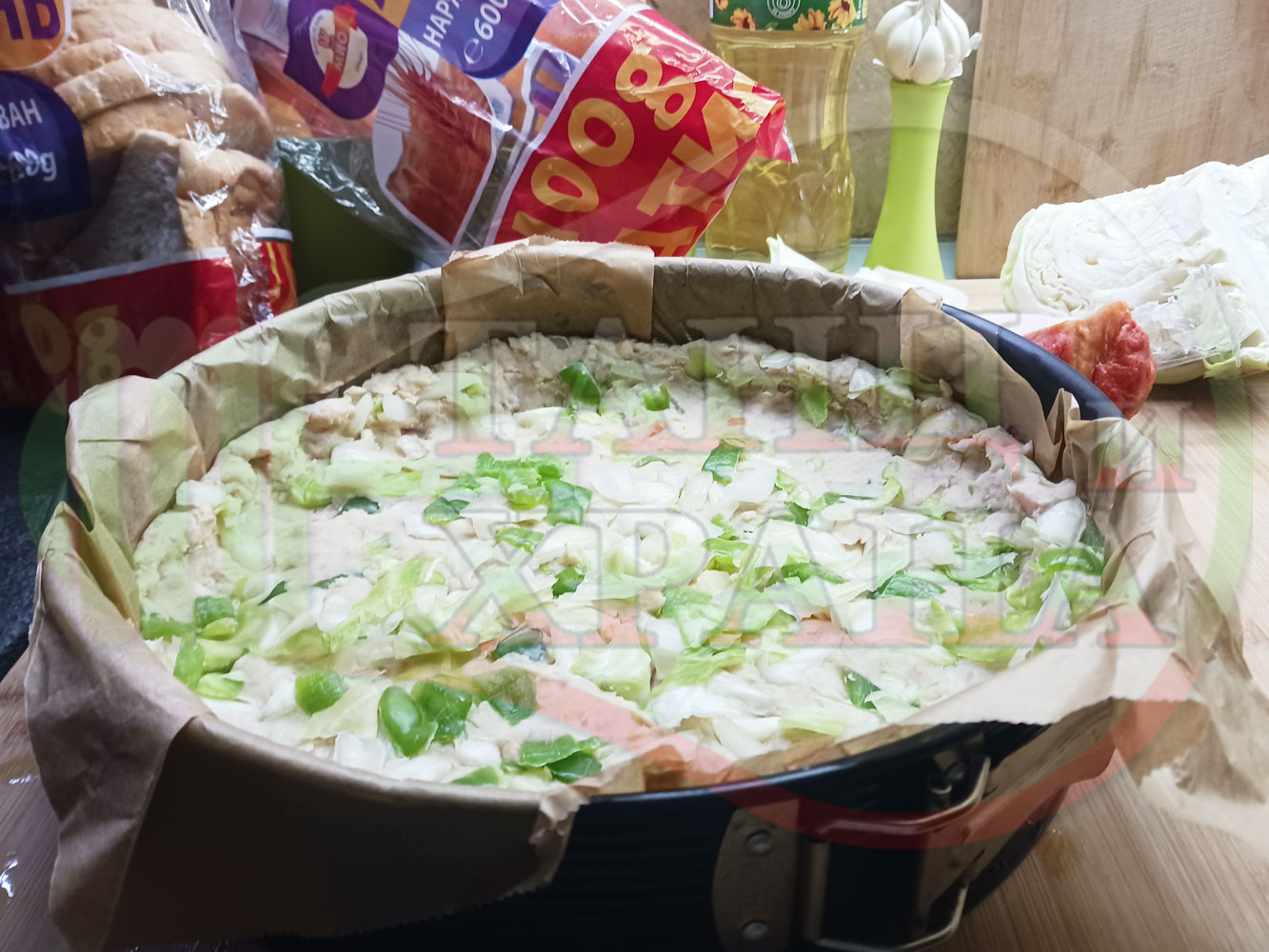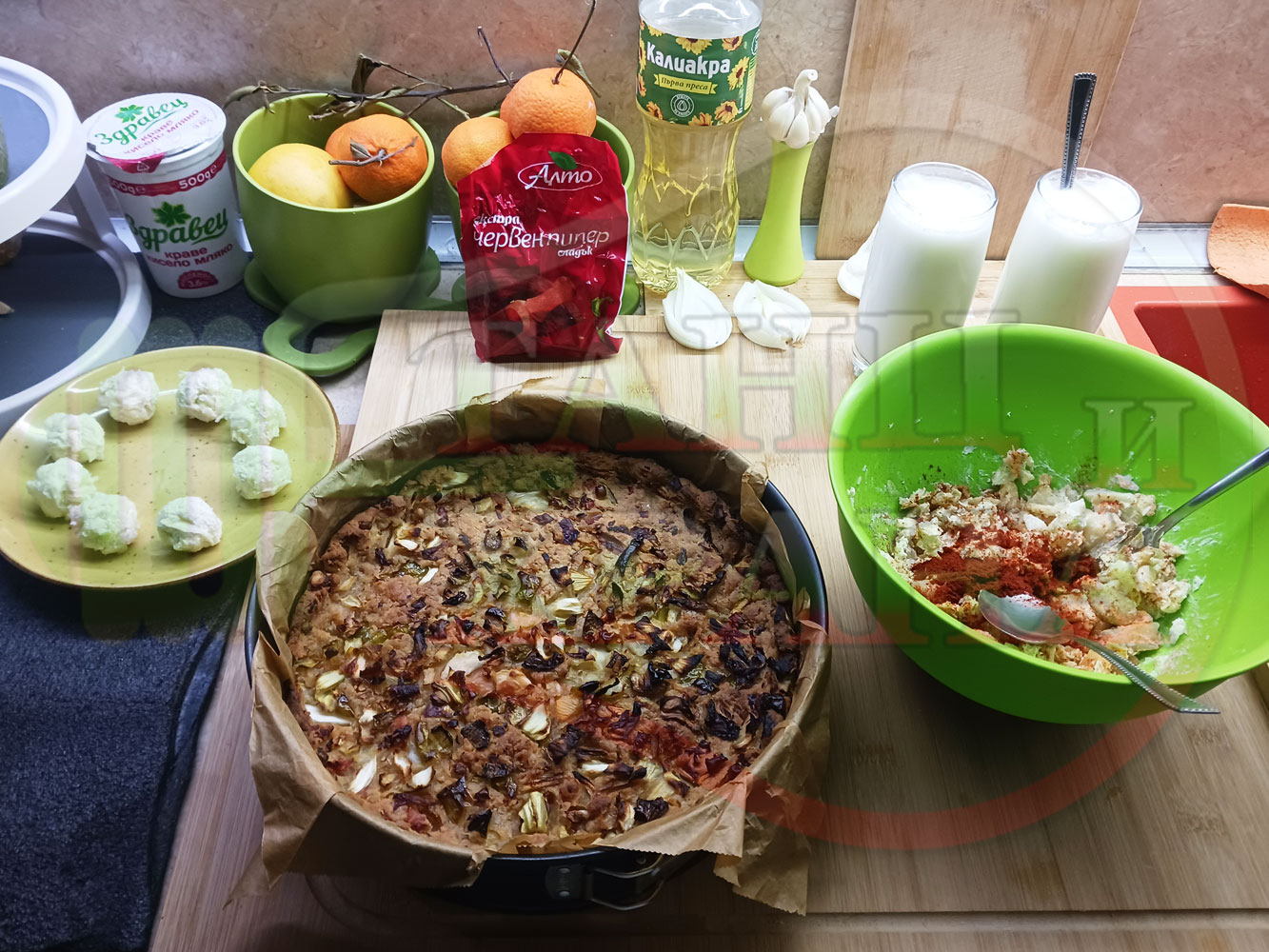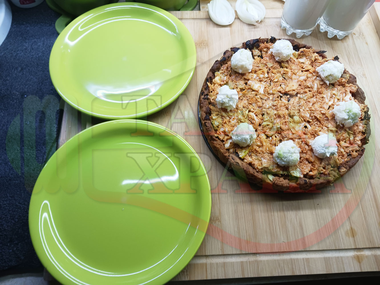 Българска хлебна торта "Зелева филежарена" омесена от хляб с прясно зеле, кромид лук, зелени пресни чушки, жарено филе и кисело мляко от България сурово гарнирана със сиреново зелев крем с червен сладък пипер и краве бяло сирене - двукомпонентна