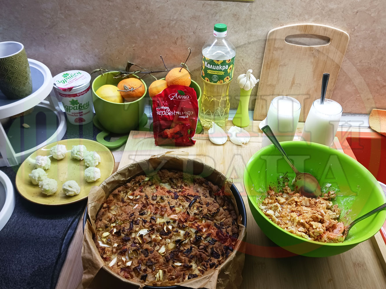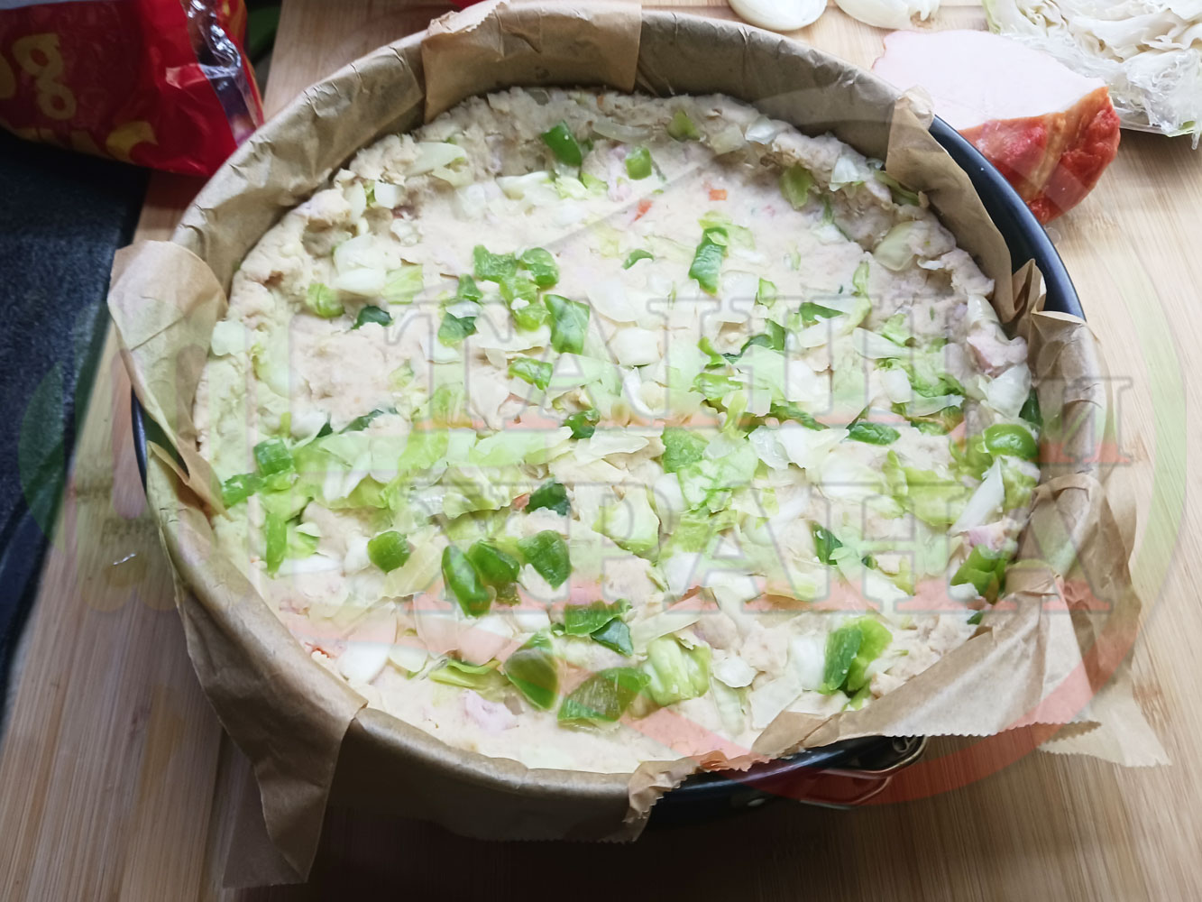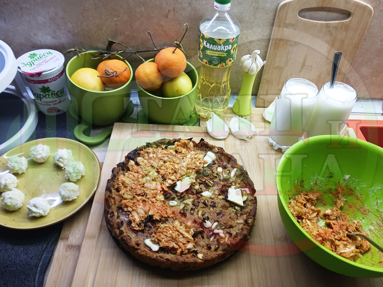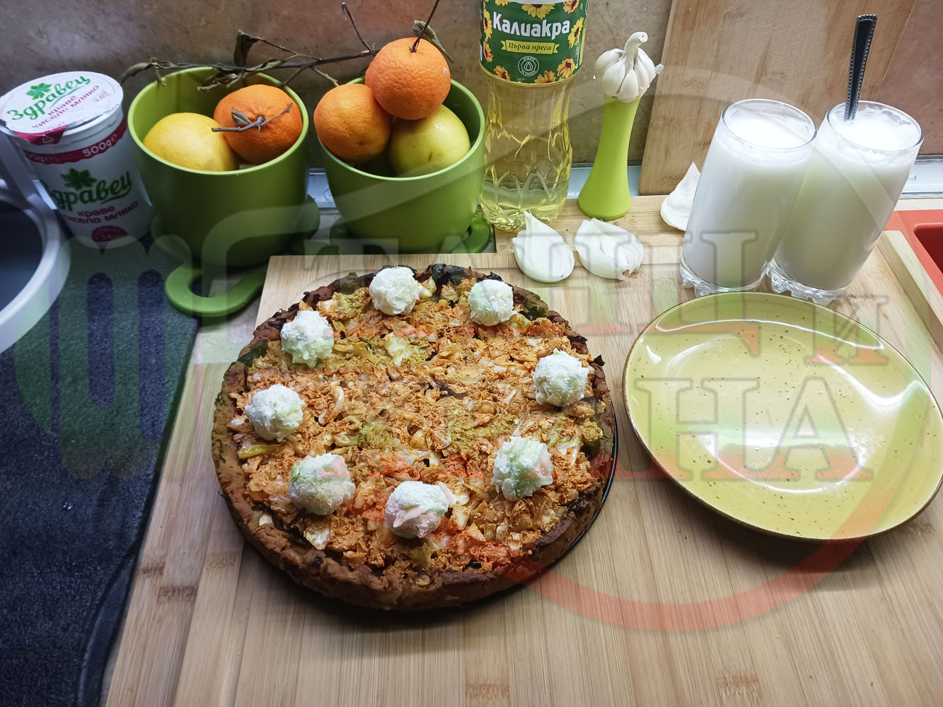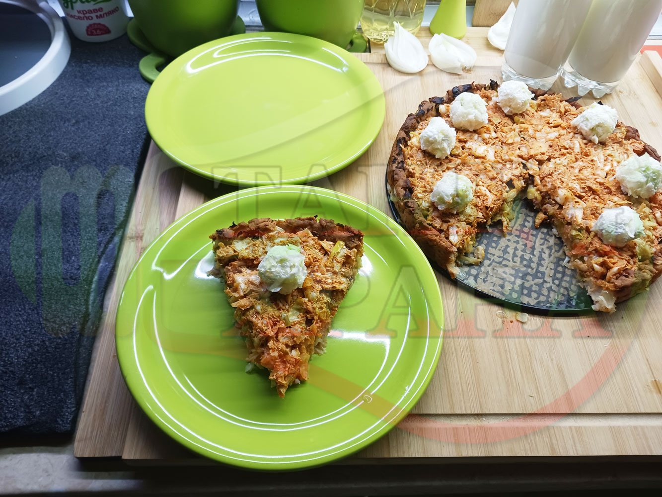 Българска хлебна торта "Зелева филежарена" омесена от хляб с прясно зеле, кромид лук, зелени пресни чушки, жарено филе и кисело мляко от България сурово гарнирана със сиреново зелев крем с червен сладък пипер и краве бяло сирене - двукомпонентна