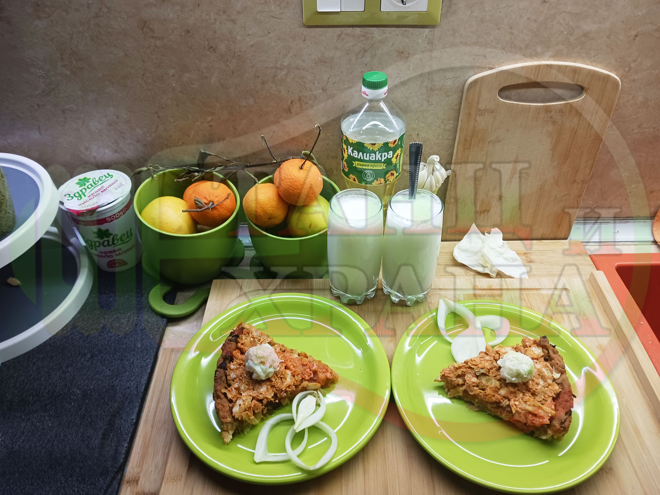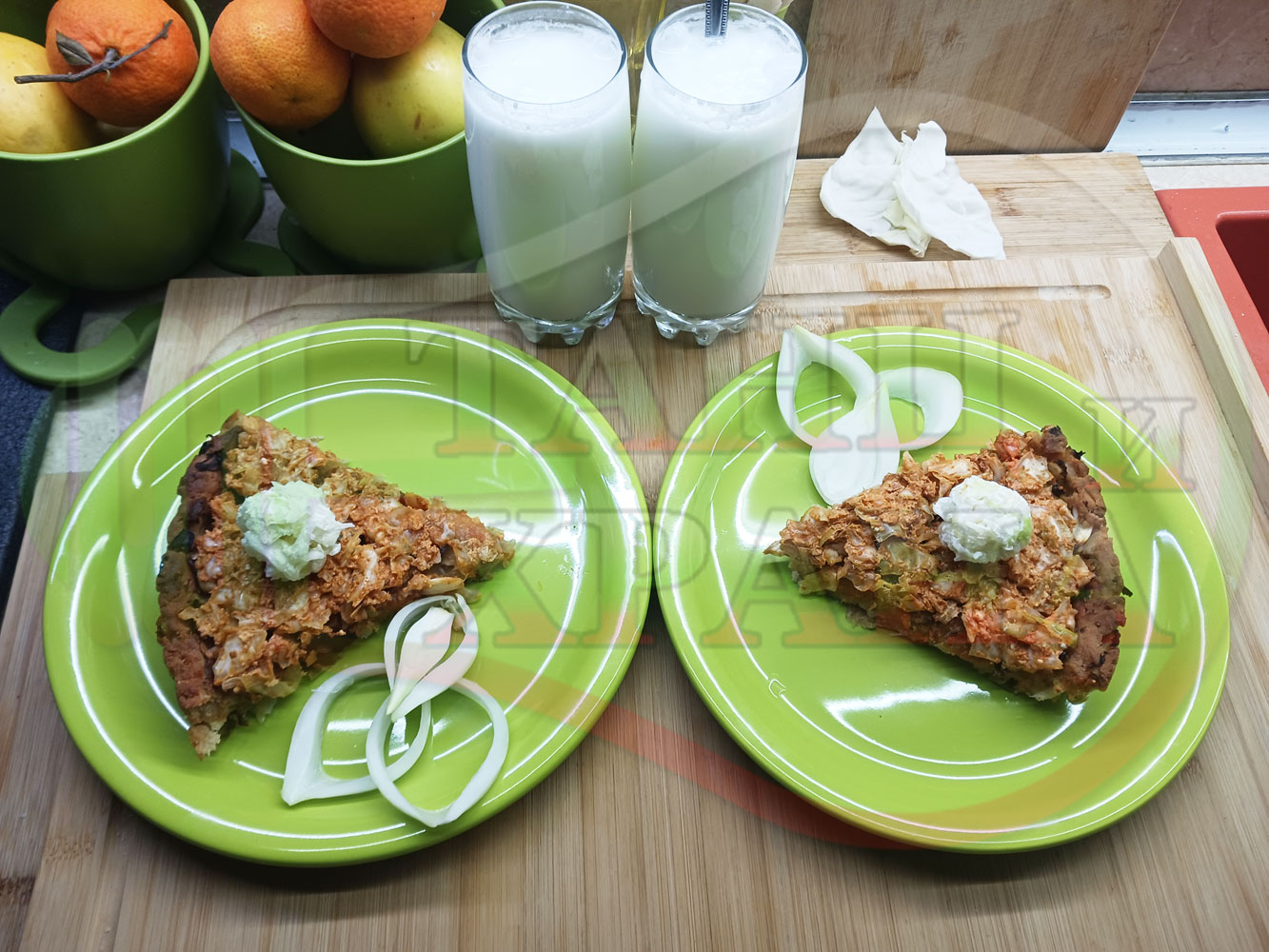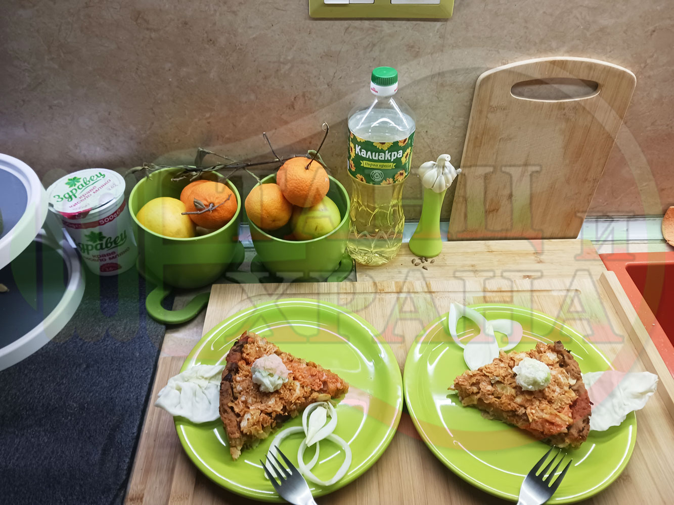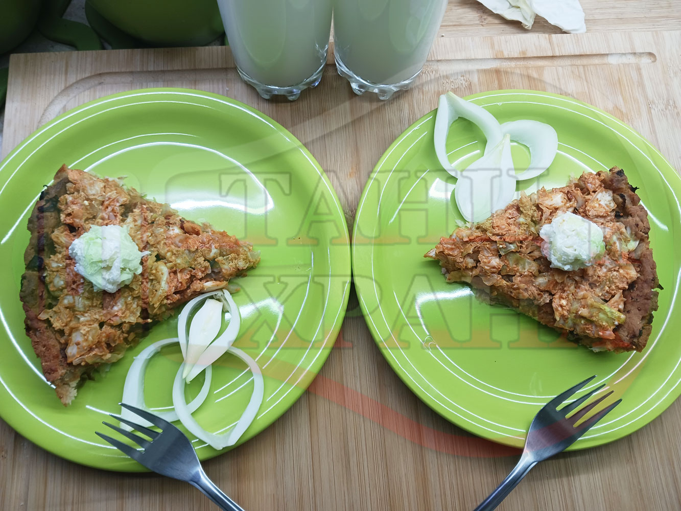Българска хлебна торта "Зелева филежарена" омесена от хляб с прясно зеле, кромид лук, зелени пресни чушки, жарено филе и кисело мляко от България сурово гарнирана със сиреново зелев крем с червен сладък пипер и краве бяло сирене - двукомпонентна