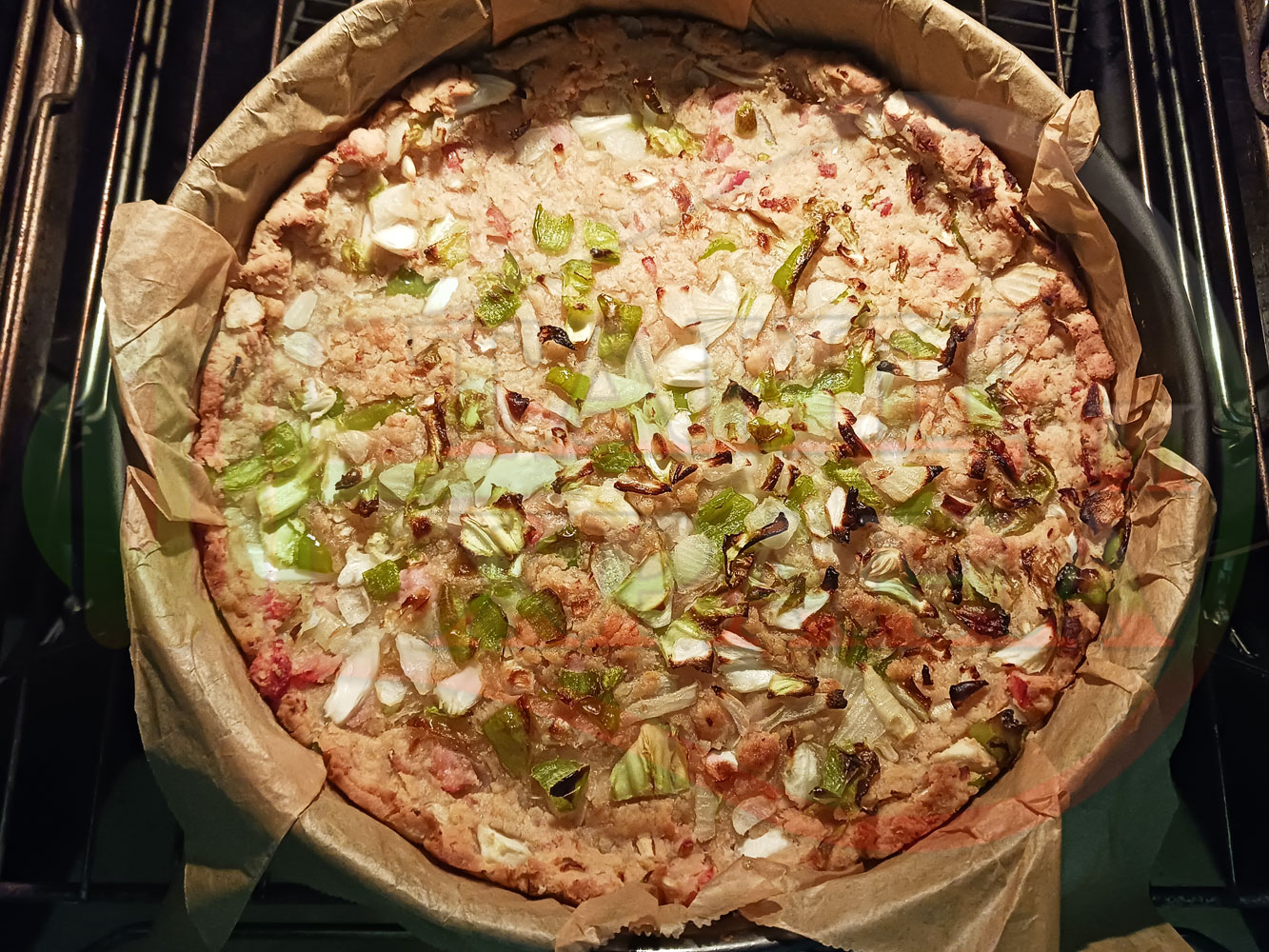 Поставете хартия за печене във форма за печене на торти с падащ ринг (не режете хартията, в случай че не се стремите тортата да има перфектен вид и ще загубите някакво време за да отрежете хартията точно по формата за печене на торти). Разпределете хлебното тесто върху хартията за печене и го загладете, така че тестото да покрие плътно дъното. Изтеглете и оформете с притискане стените на хлебната торта по падащия ринг, така че да образува страничен борд ("оградка") от поне 2 см. на височина. Поставете тавата в предварително загрятата фурна (загрейте я за поне 5 минути). Запечете на фурна без вентилатор на 180 градуса за около 50 минути.