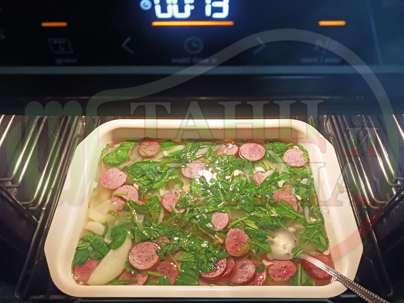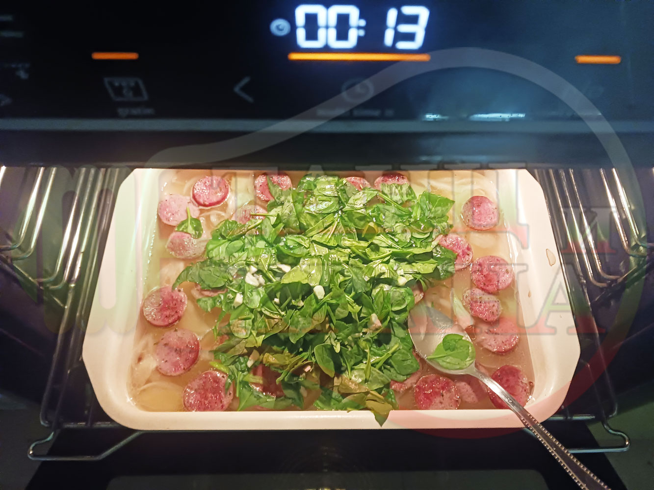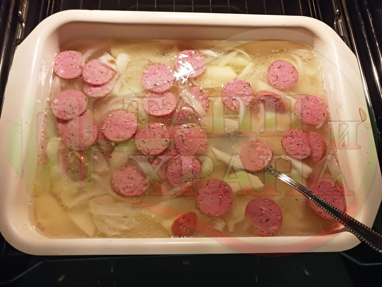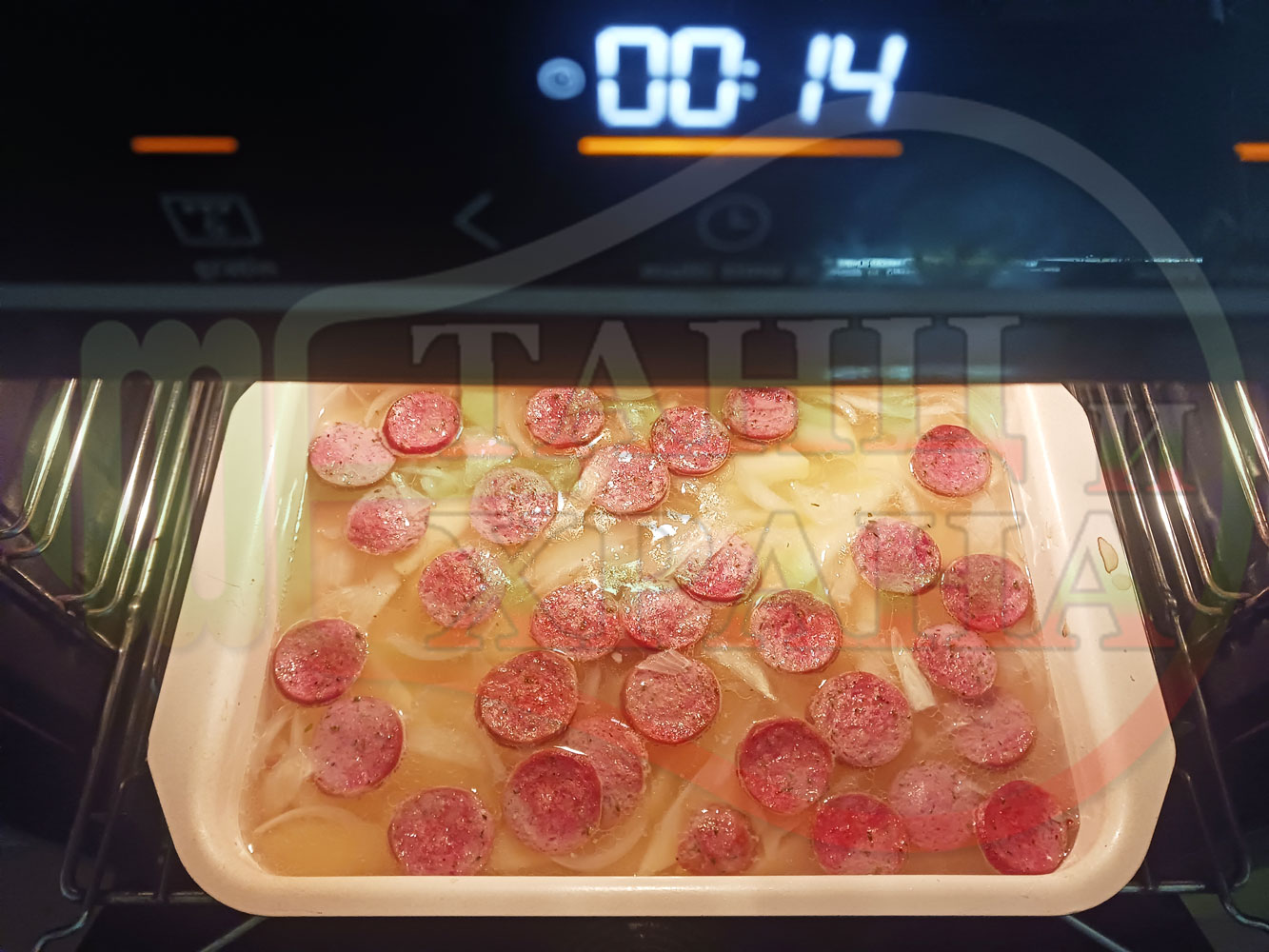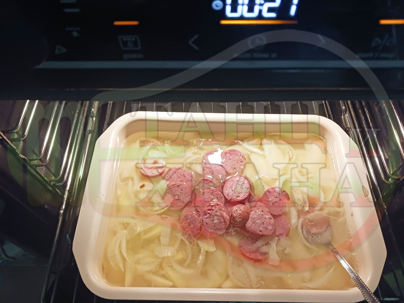 ВНИМАНИЕ: Фурните са различни и съответно времето за сваряване и запичане е ориентировъчно. Наблюдавайте процеса на запичане и при необходимост, покрийте тавата с капак или я отстранете от фурната. Разбърквайте и обръщайте често нарязаната на кръгчета наденица за да се изпече равномерно (след като я добавите).