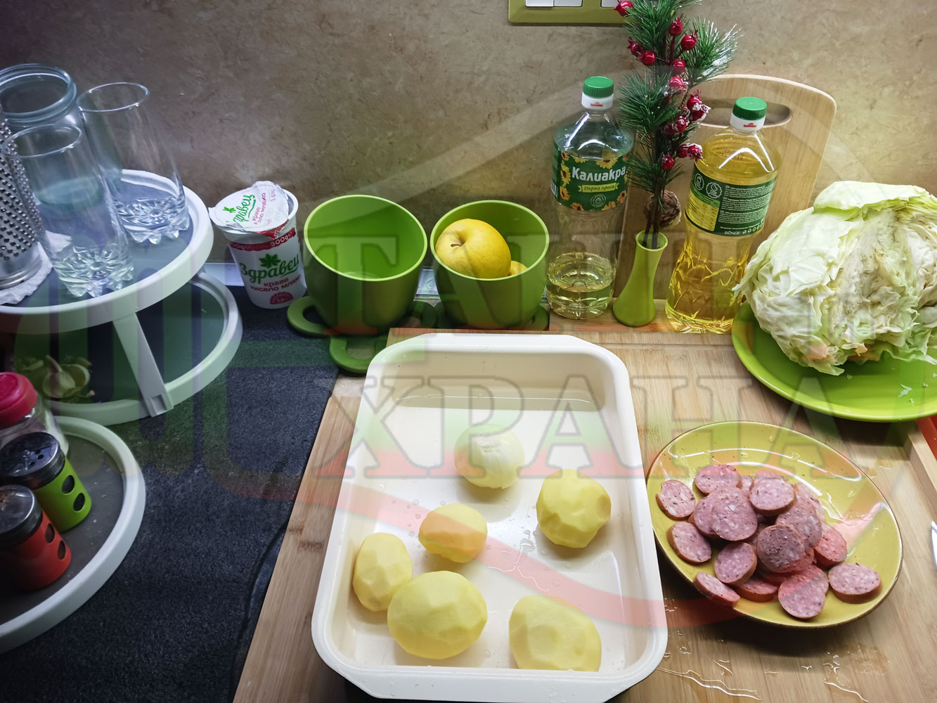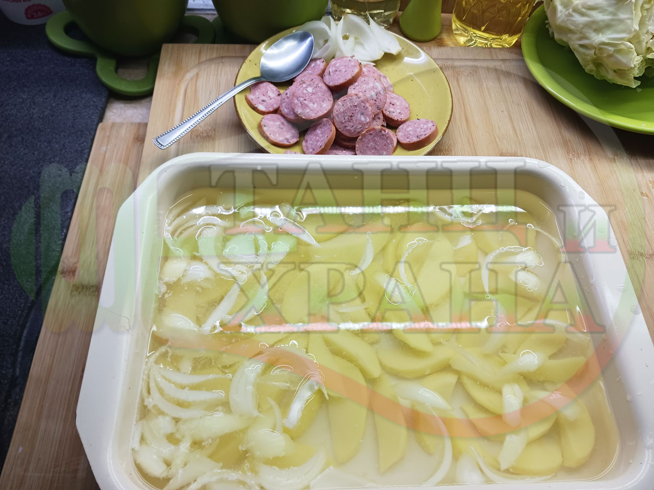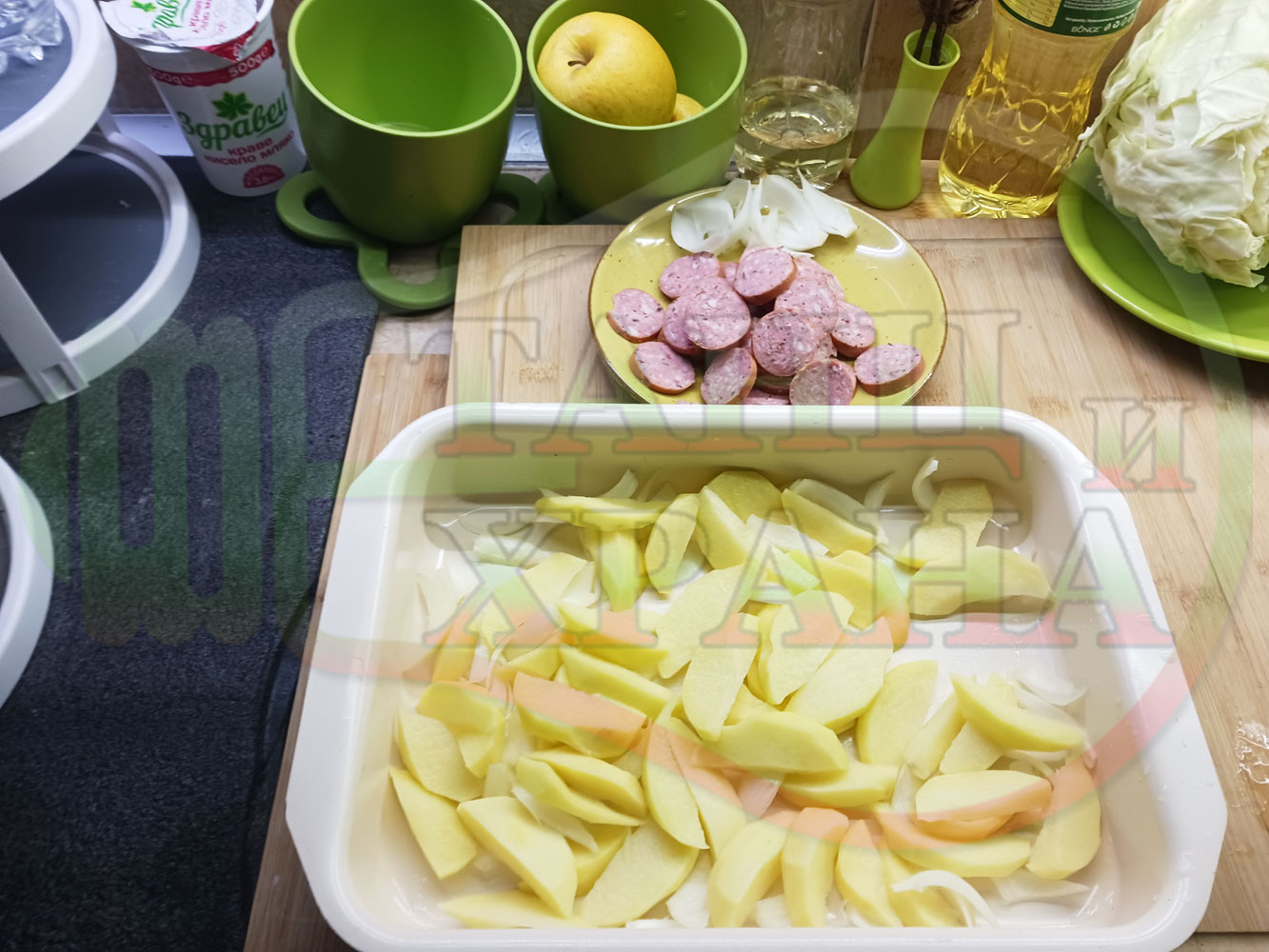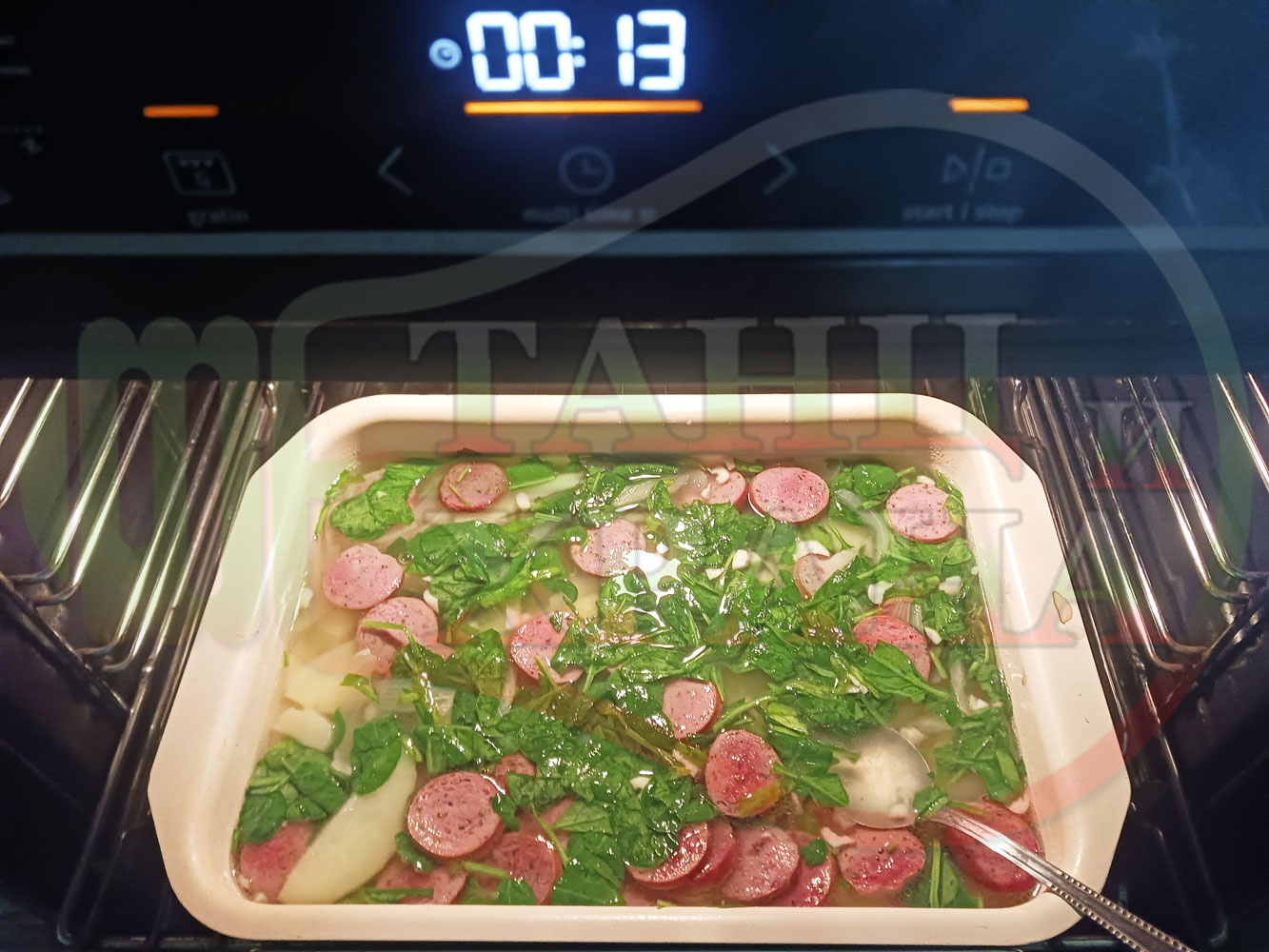 ВНИМАНИЕ: Фурните са различни и съответно времето за сваряване и запичане е ориентировъчно. Наблюдавайте процеса на запичане и при необходимост, покрийте тавата с капак или я отстранете от фурната. Разбърквайте и обръщайте често нарязаната на кръгчета наденица за да се изпече равномерно (след като я добавите).